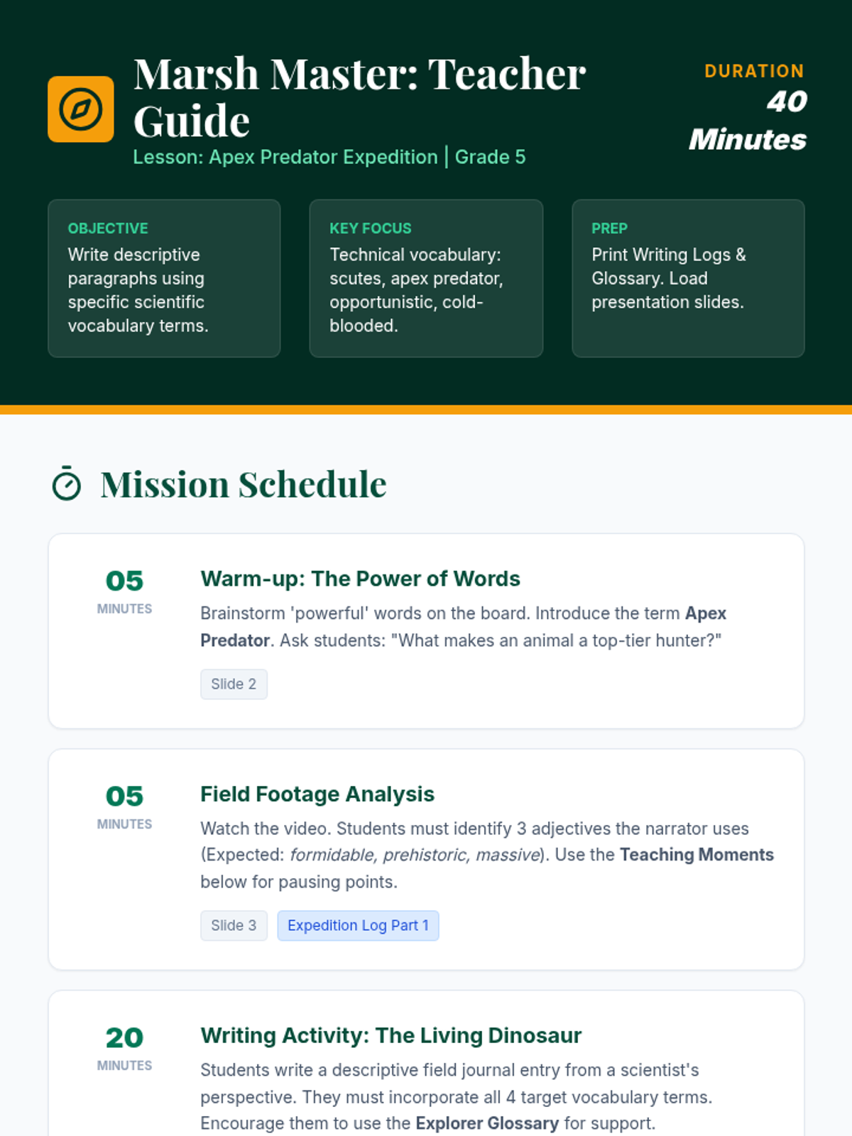 Students explore the world of saltwater crocodiles through film and scientific observation, culminating in a descriptive writing piece from the perspective of an explorer. The lesson focuses on technical vocabulary like 'scutes', 'apex predator', and 'opportunistic'.