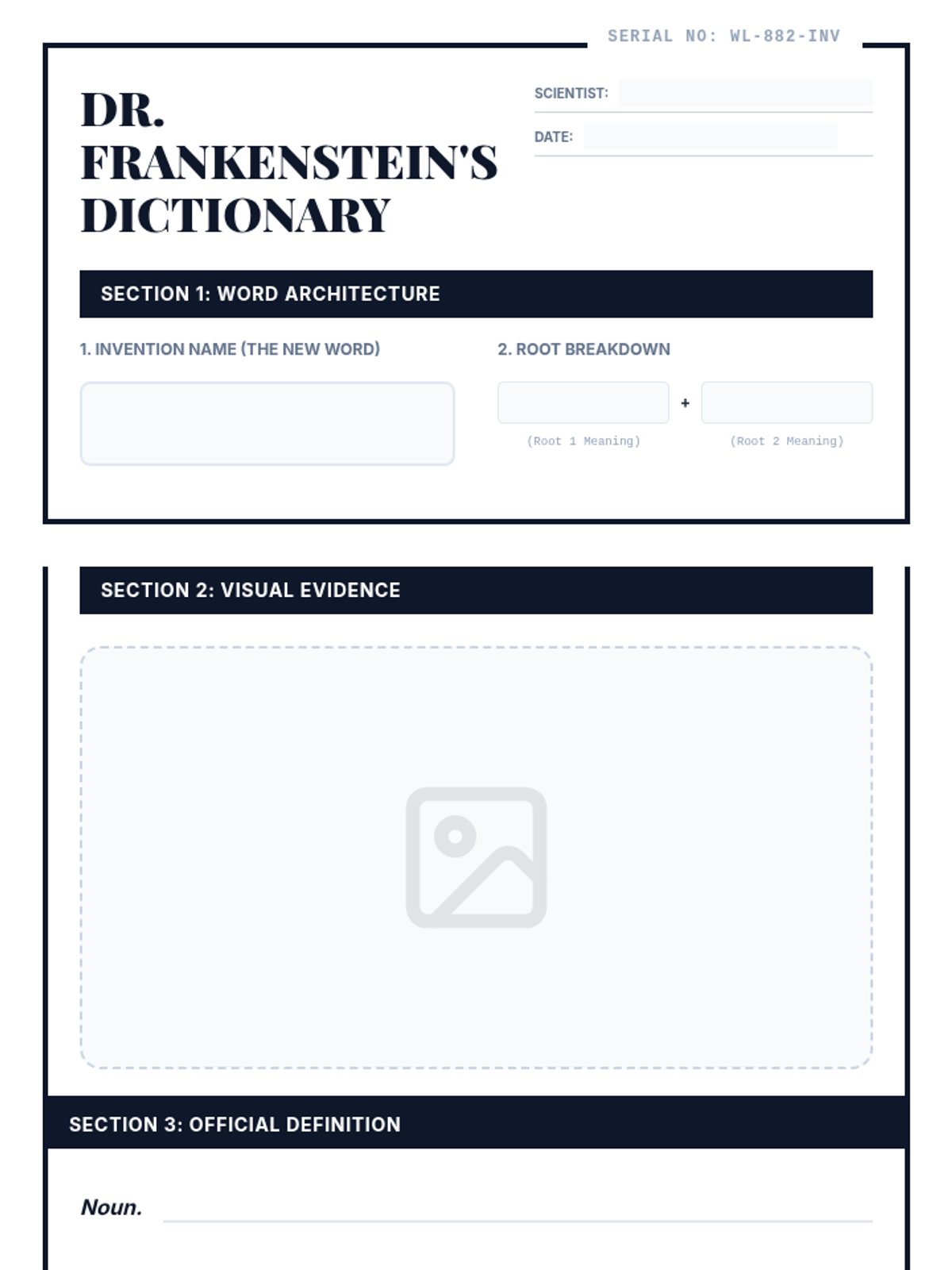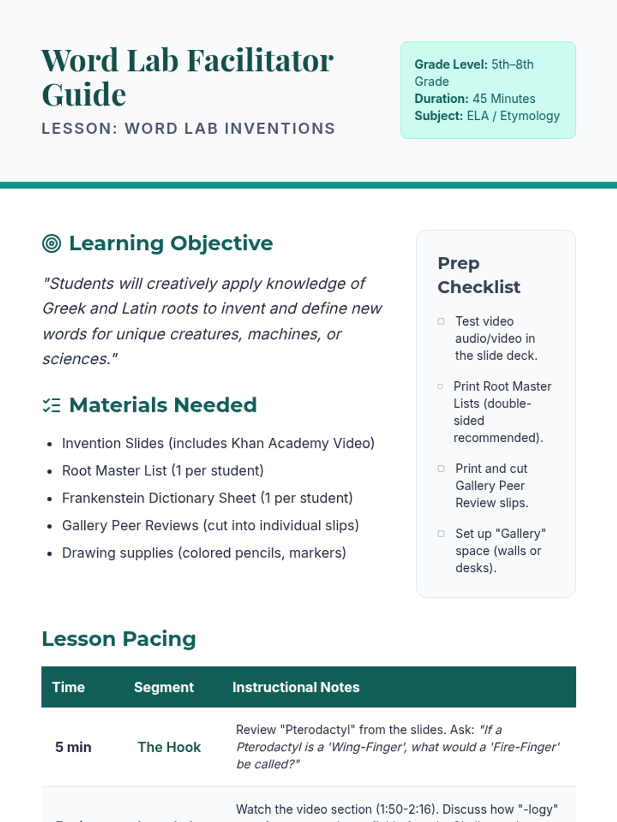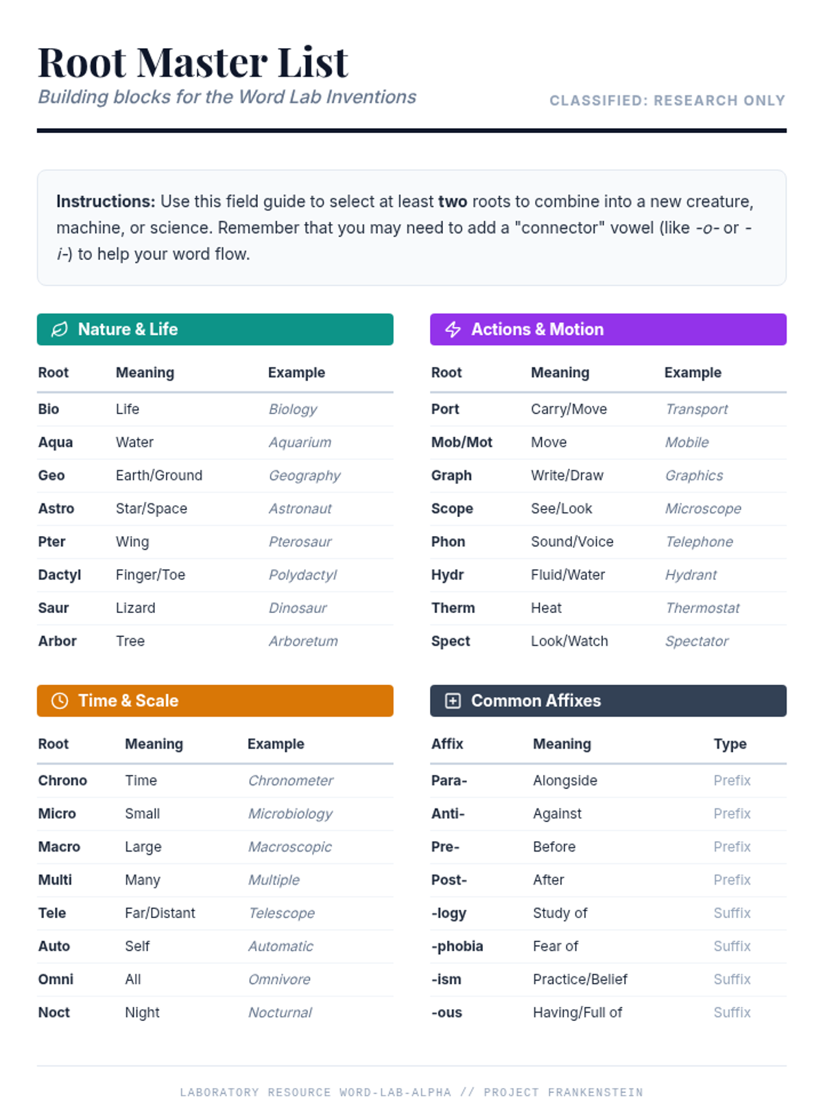 A creative exploration of Greek and Latin roots where students invent new creatures, machines, or sciences by combining word parts. Students will watch a Khan Academy video, analyze the word 'Pterodactyl', and present their creations in a gallery walk.