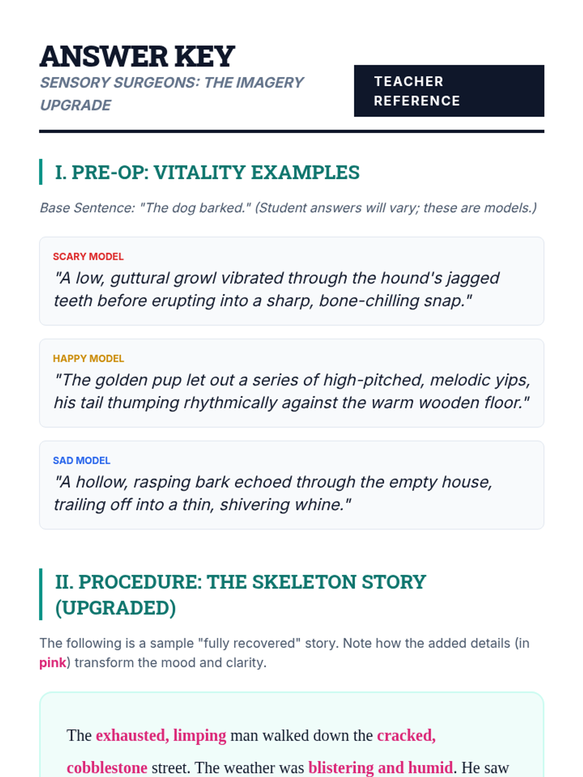 A lesson focused on transforming 'lifeless' writing into vivid narratives using sensory imagery and descriptive language revisions. Students watch a video model, 'operate' on a skeleton story using colored pens, and practice upgrading their own writing.