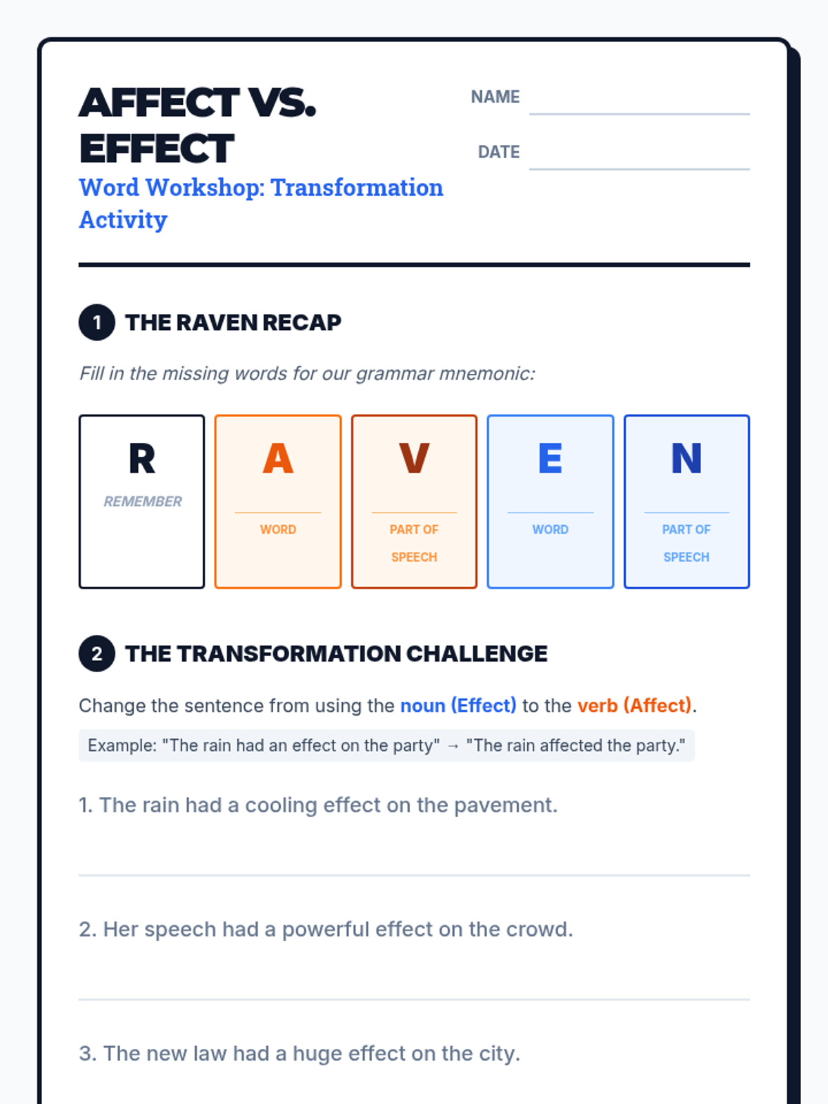 A grammar lesson for 5th-6th graders focusing on the common confusion between 'affect' and 'effect' using the RAVEN mnemonic and sentence transformation activities.