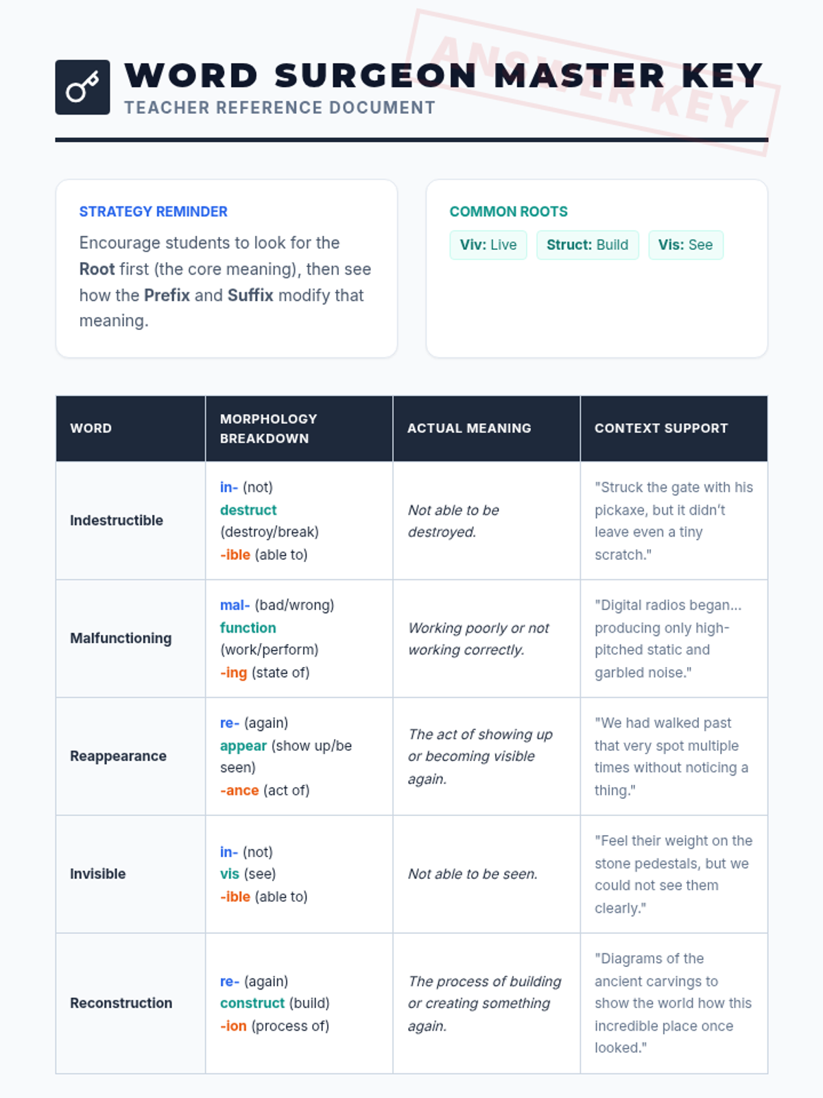 Students learn to decode complex vocabulary using morphological analysis (prefixes, roots, and suffixes) inspired by David's 'word surgery' techniques from Khan Academy.