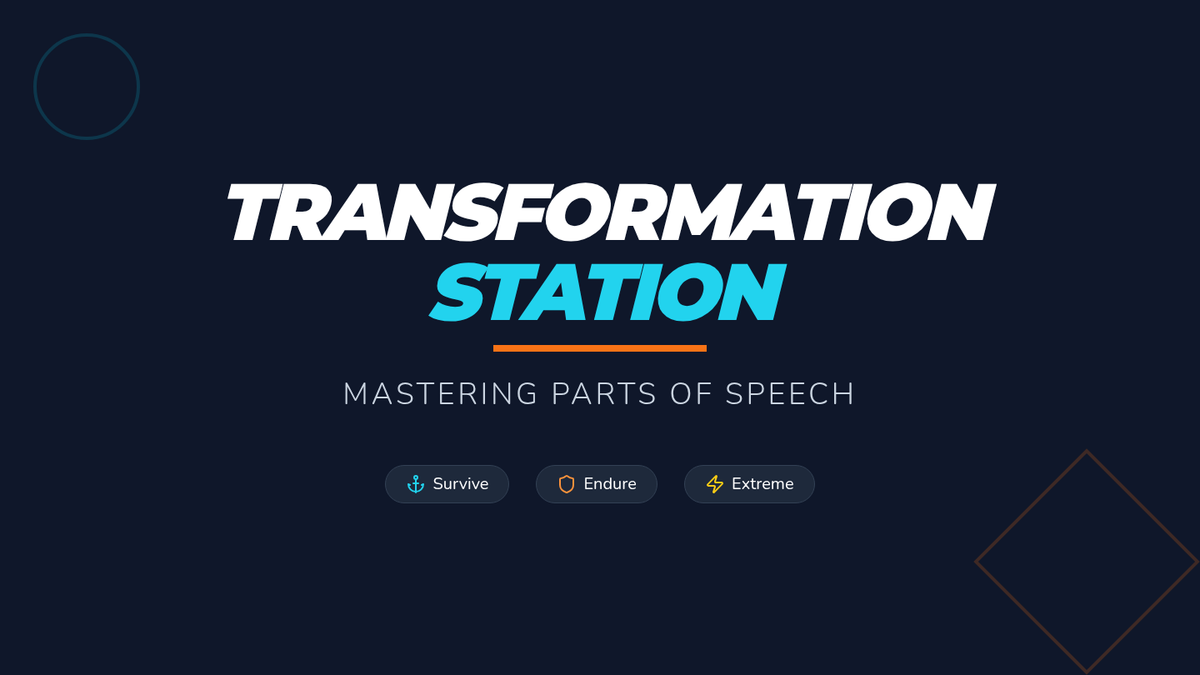 A lesson where students explore the relationship between different parts of speech using the focus words survive, endure, and extreme, featuring a Khan Academy video and a 'Transformation Station' activity.