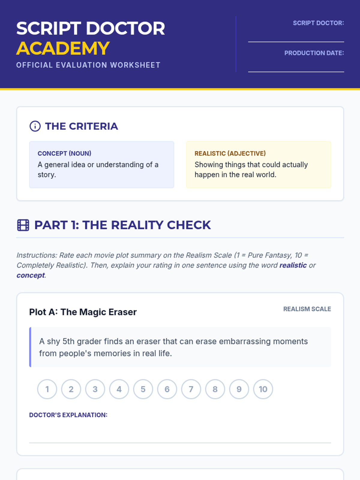 A lesson where students act as 'Script Doctors' to evaluate the realism of story plots, using vocabulary from Khan Academy to propose creative edits.