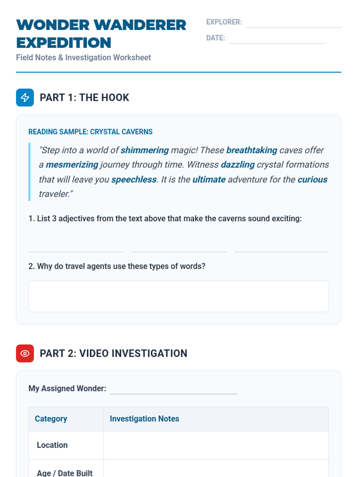 Students explore the Seven Wonders of the World through video analysis and persuasive writing, culminating in a 'Travel Agent Pitch' brochure. They will master descriptive vocabulary and learn to blend historical facts with compelling travel copy.