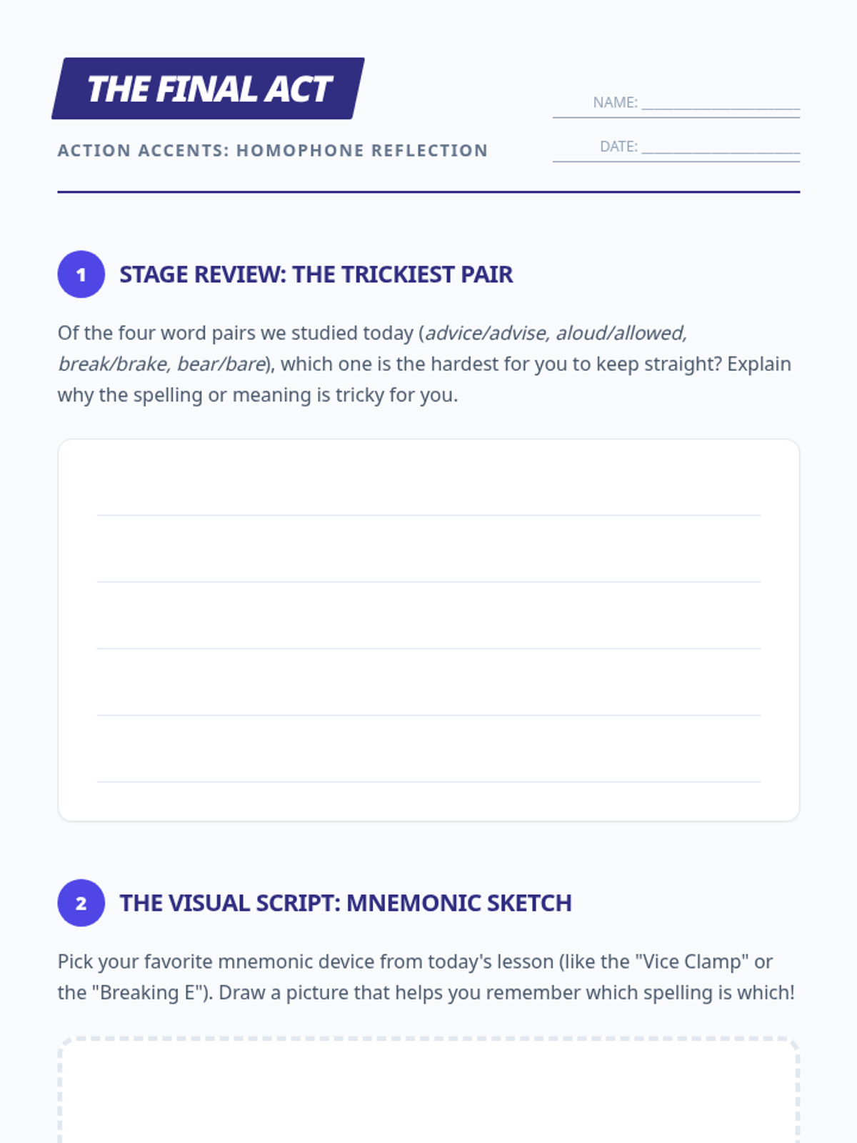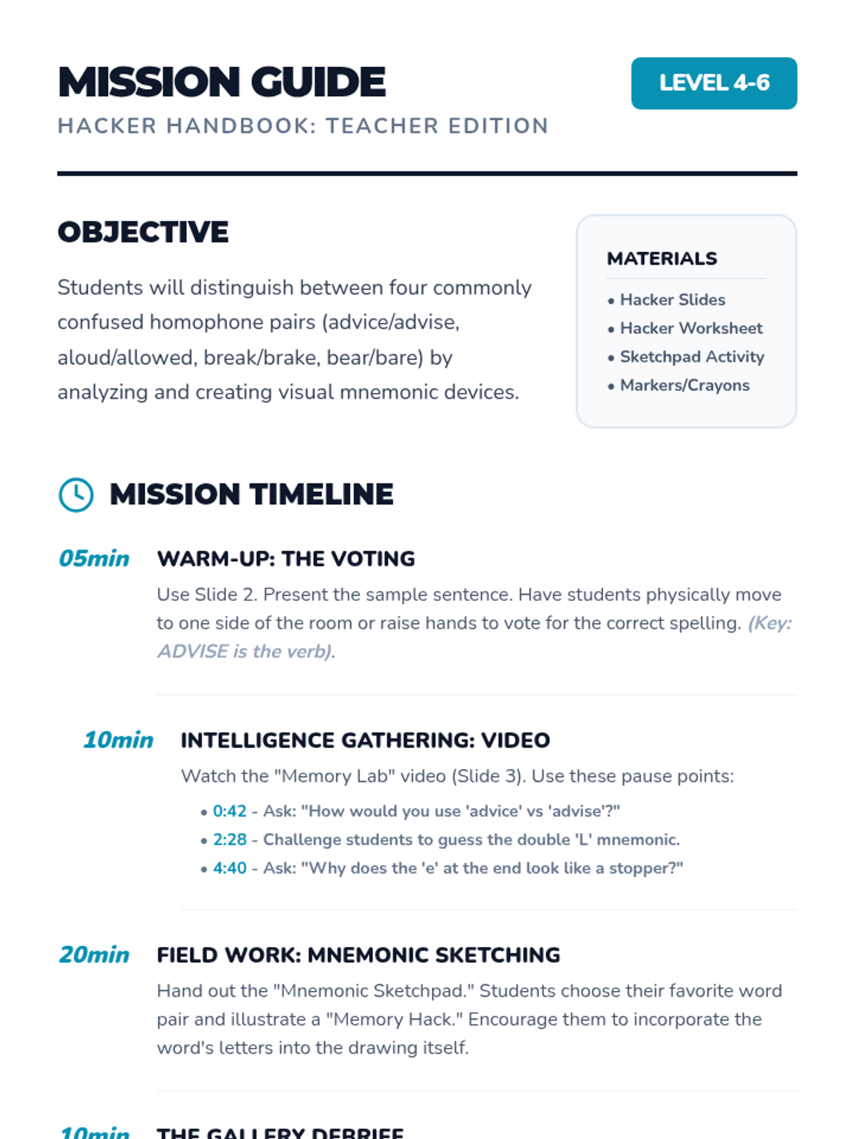 A dynamic lesson for middle schoolers to master four sets of commonly confused homophones: advice/advise, aloud/allowed, break/brake, and bear/bare using mnemonics and creative writing.