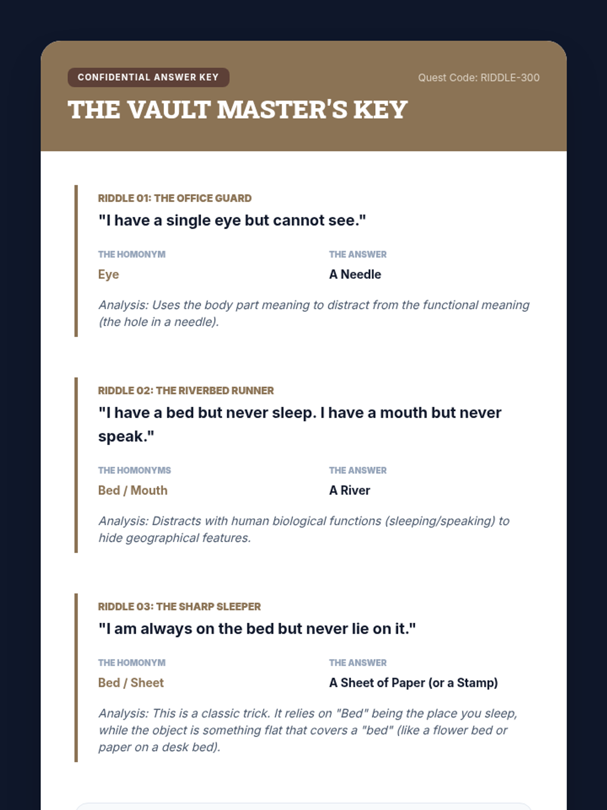 Students draft their own riddles where the answer hinges on a homophone or homonym. They practice guiding the reader toward the wrong meaning before revealing the correct one.