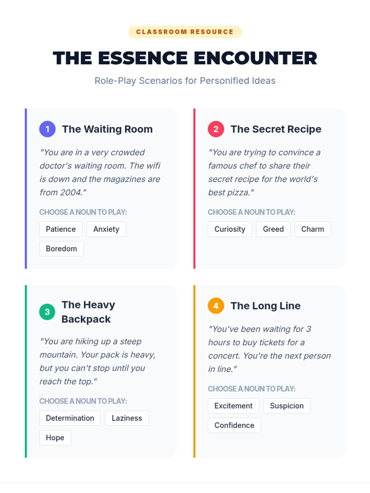 A creative writing lesson for 6th graders exploring the boundary between concrete and abstract nouns through personification and character design. Students learn to 'manifest' intangible ideas into physical characters using etymology and creative prompts.