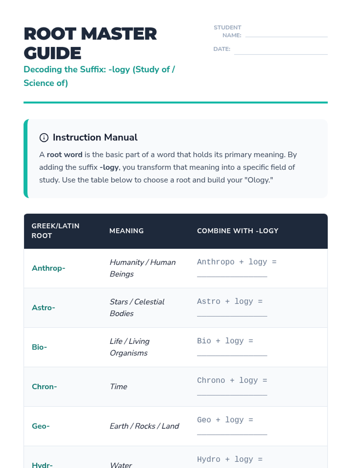 A 6th-grade linguistics and science lesson where students explore the suffix -logy, analyze Greek/Latin roots, and design their own scientific fields of study.