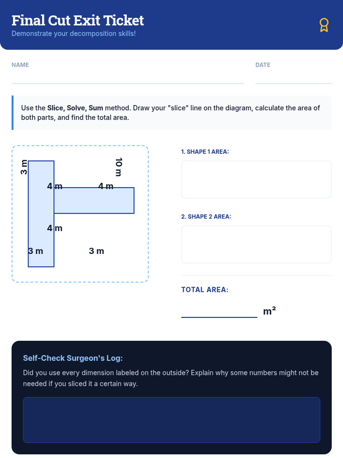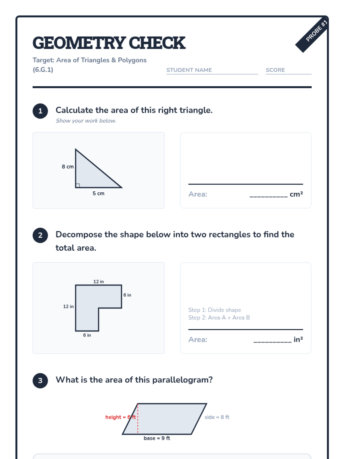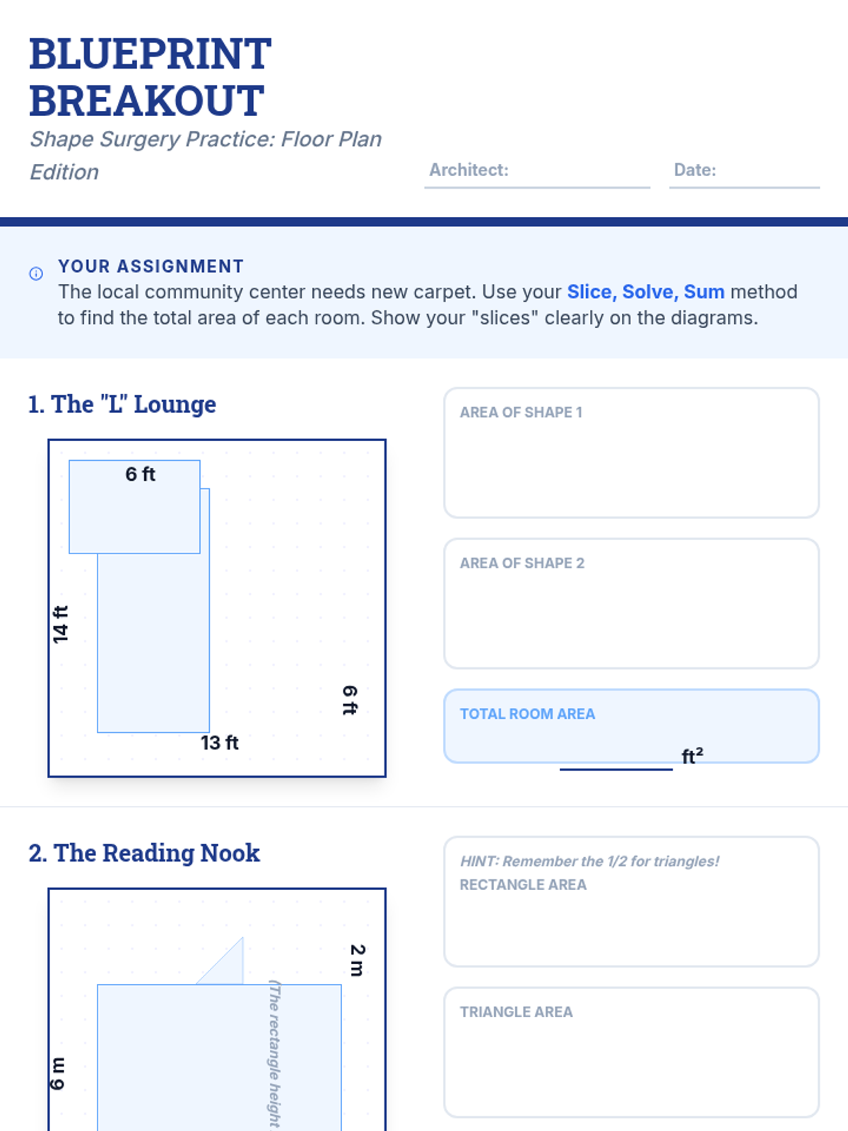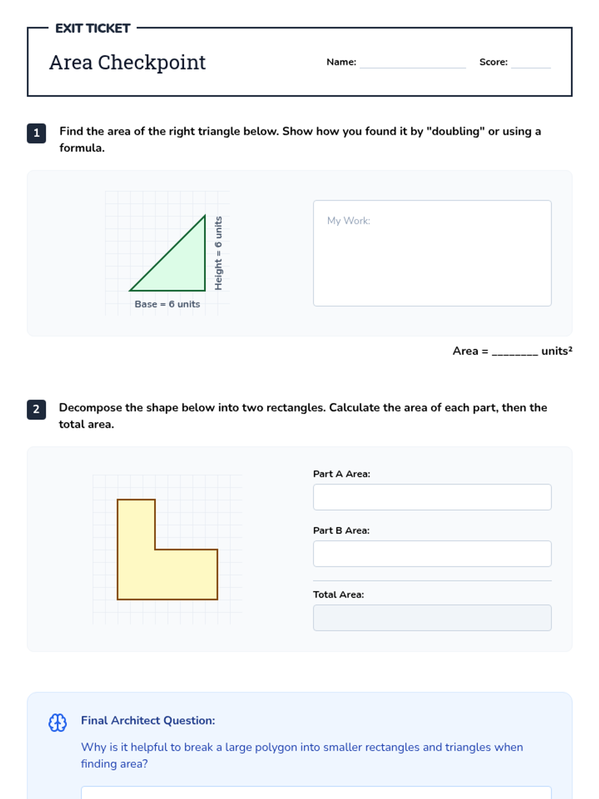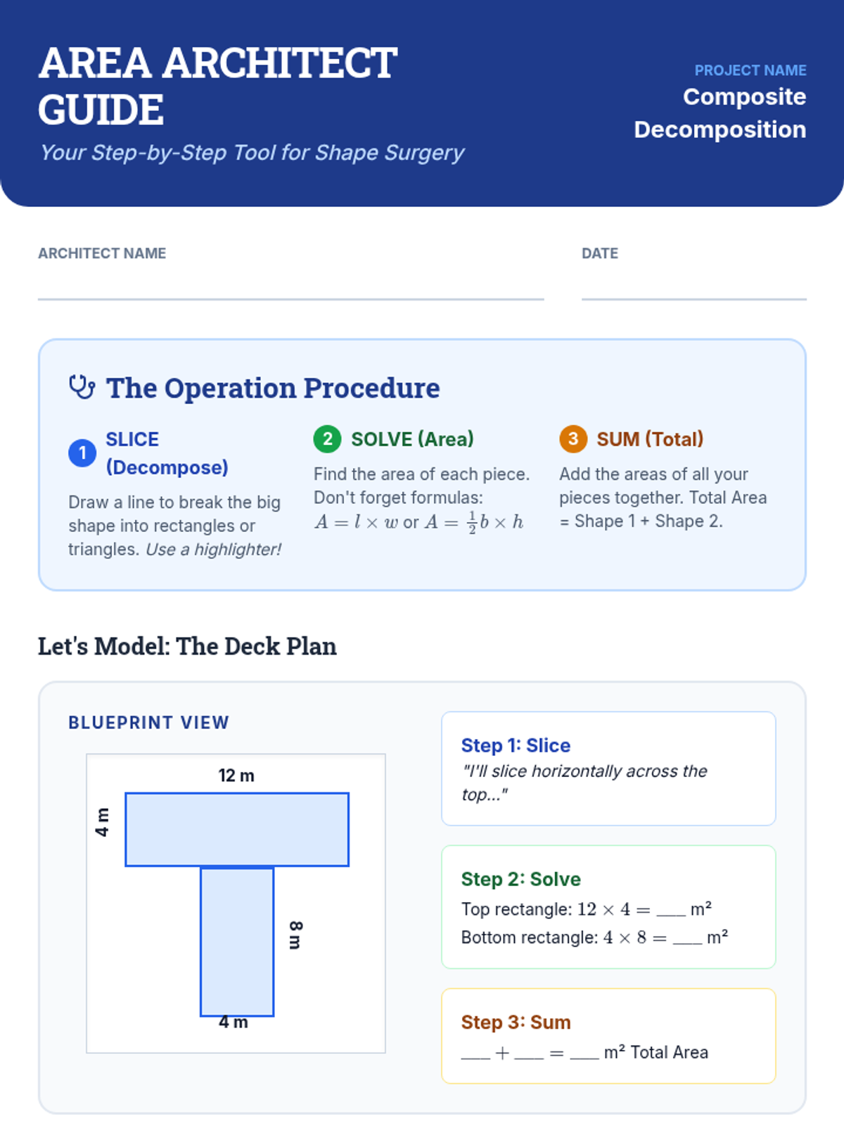 A comprehensive lesson on calculating the area of irregular rectilinear shapes by decomposing them into smaller rectangles. Includes tiered practice, a project-based learning guide, and a detailed assessment rubric.