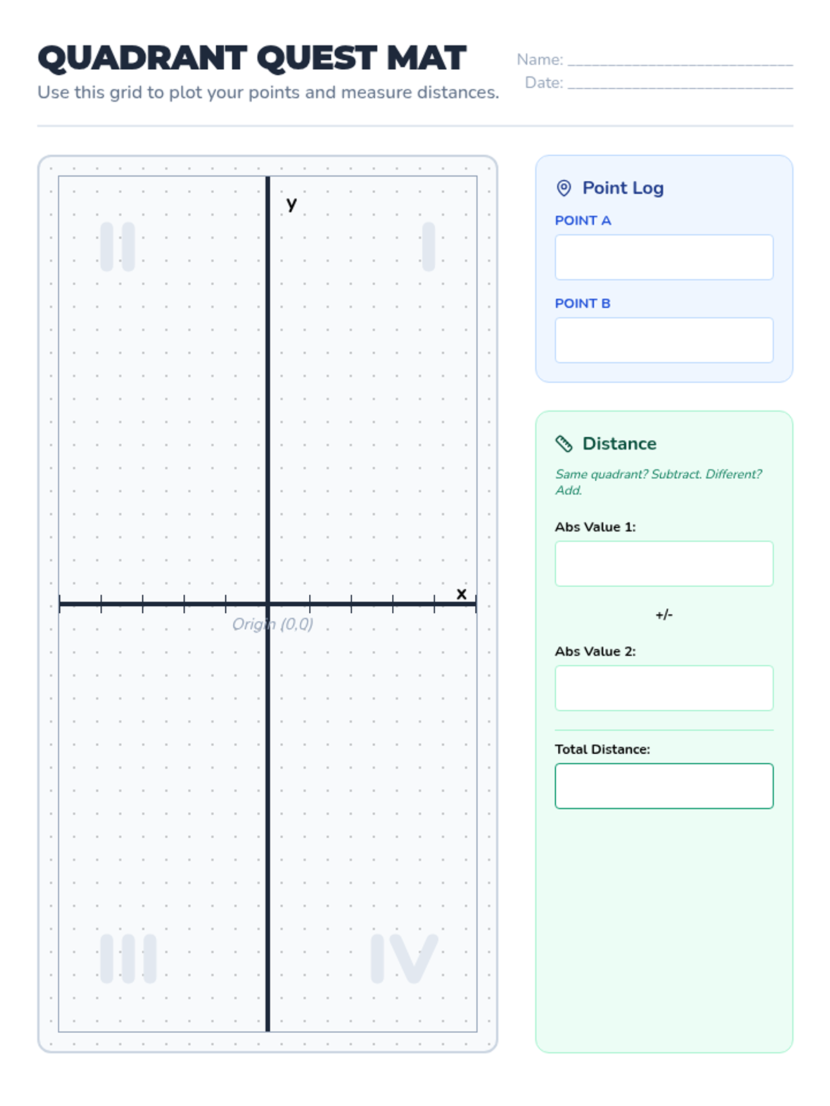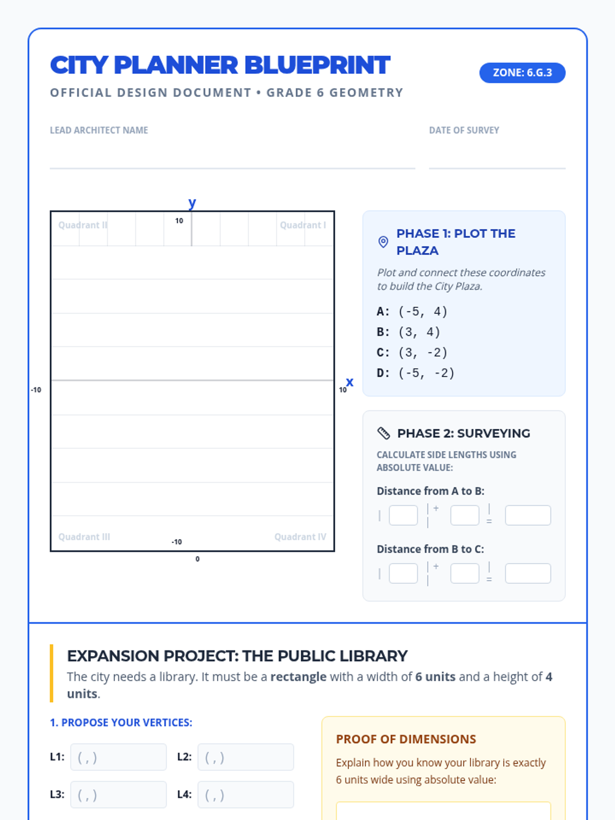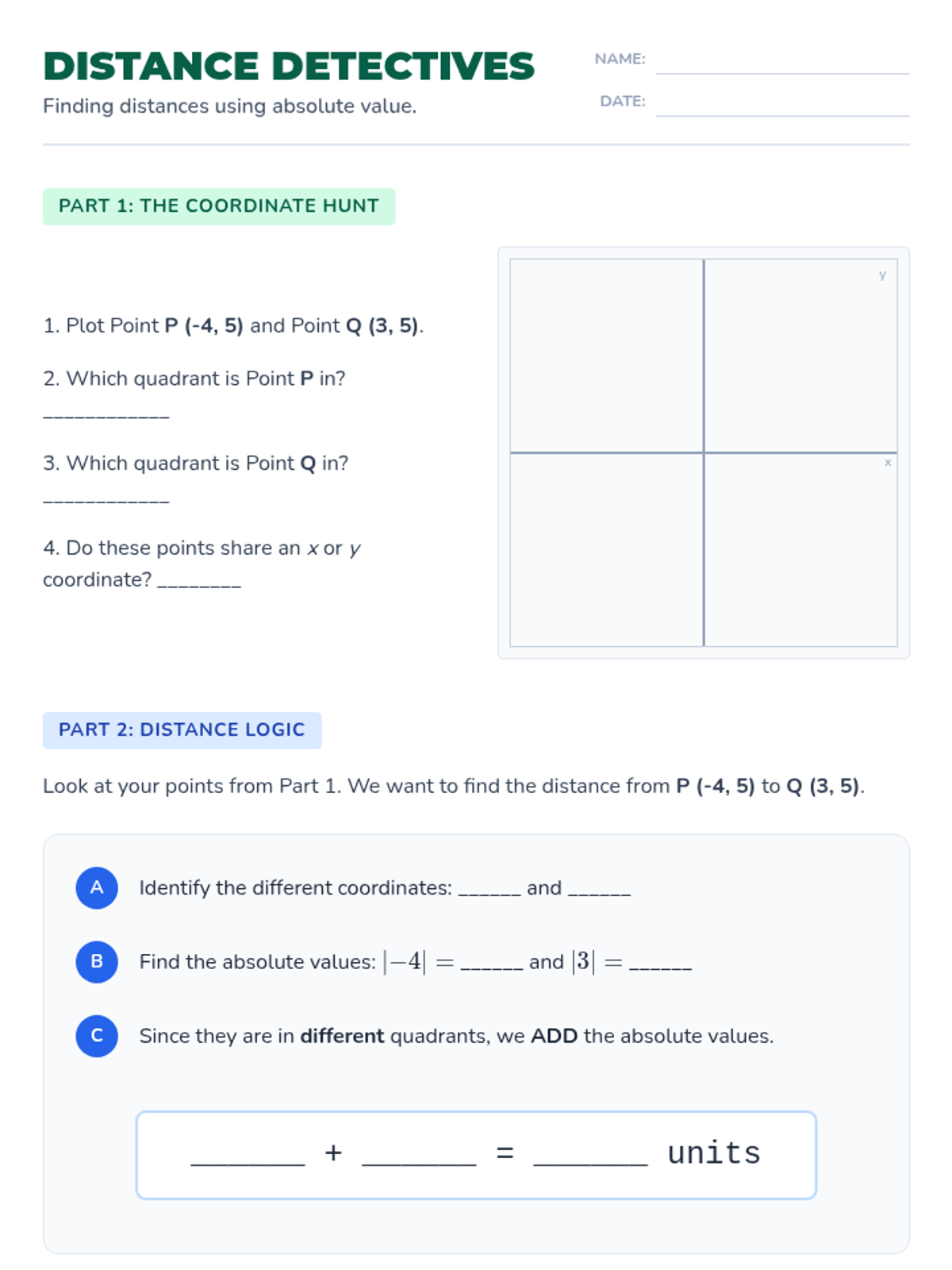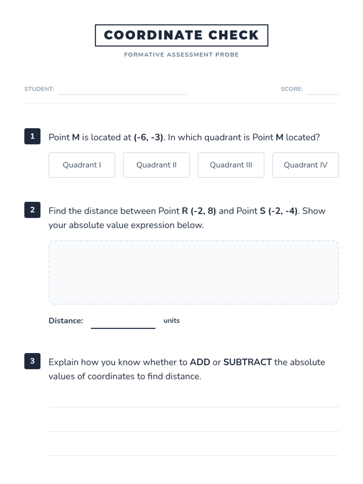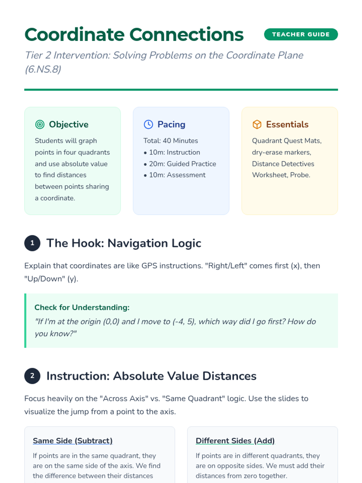 A targeted intervention lesson focused on mastering the four-quadrant coordinate plane and calculating distances between points using absolute value. Designed for small groups, it includes visual aids, guided plotting, and step-by-step calculation support.