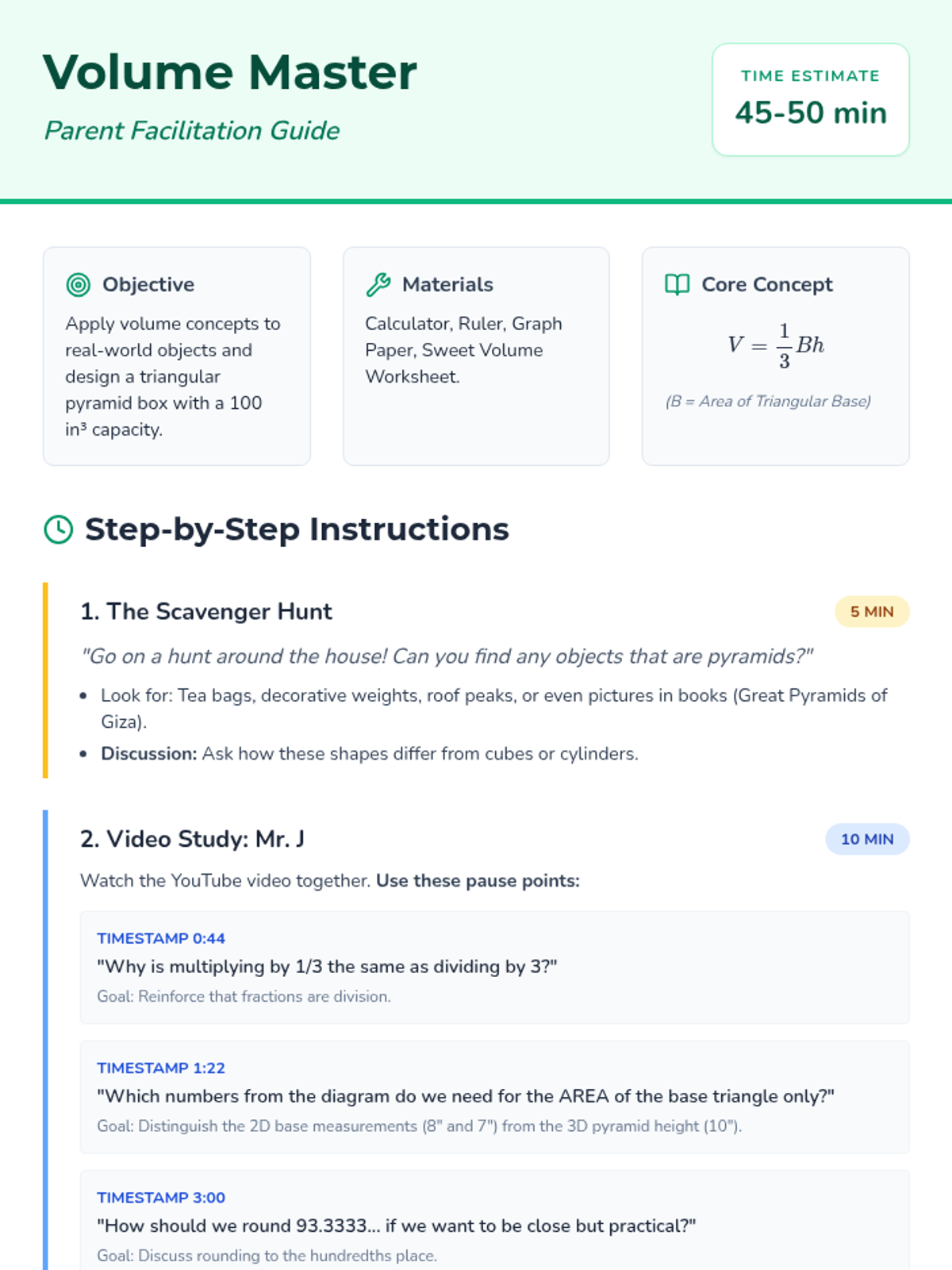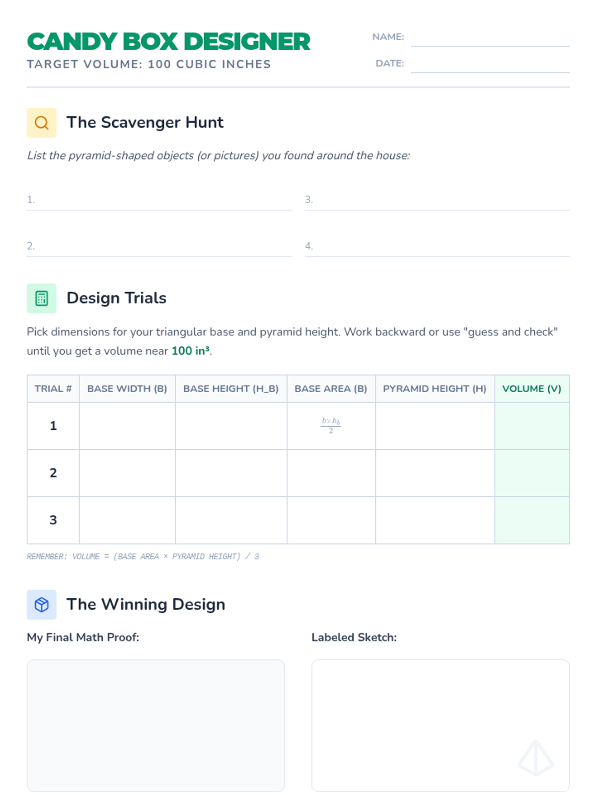 A hands-on geometry lesson where students learn to calculate the volume of triangular pyramids by designing their own candy packaging with a specific volume target.