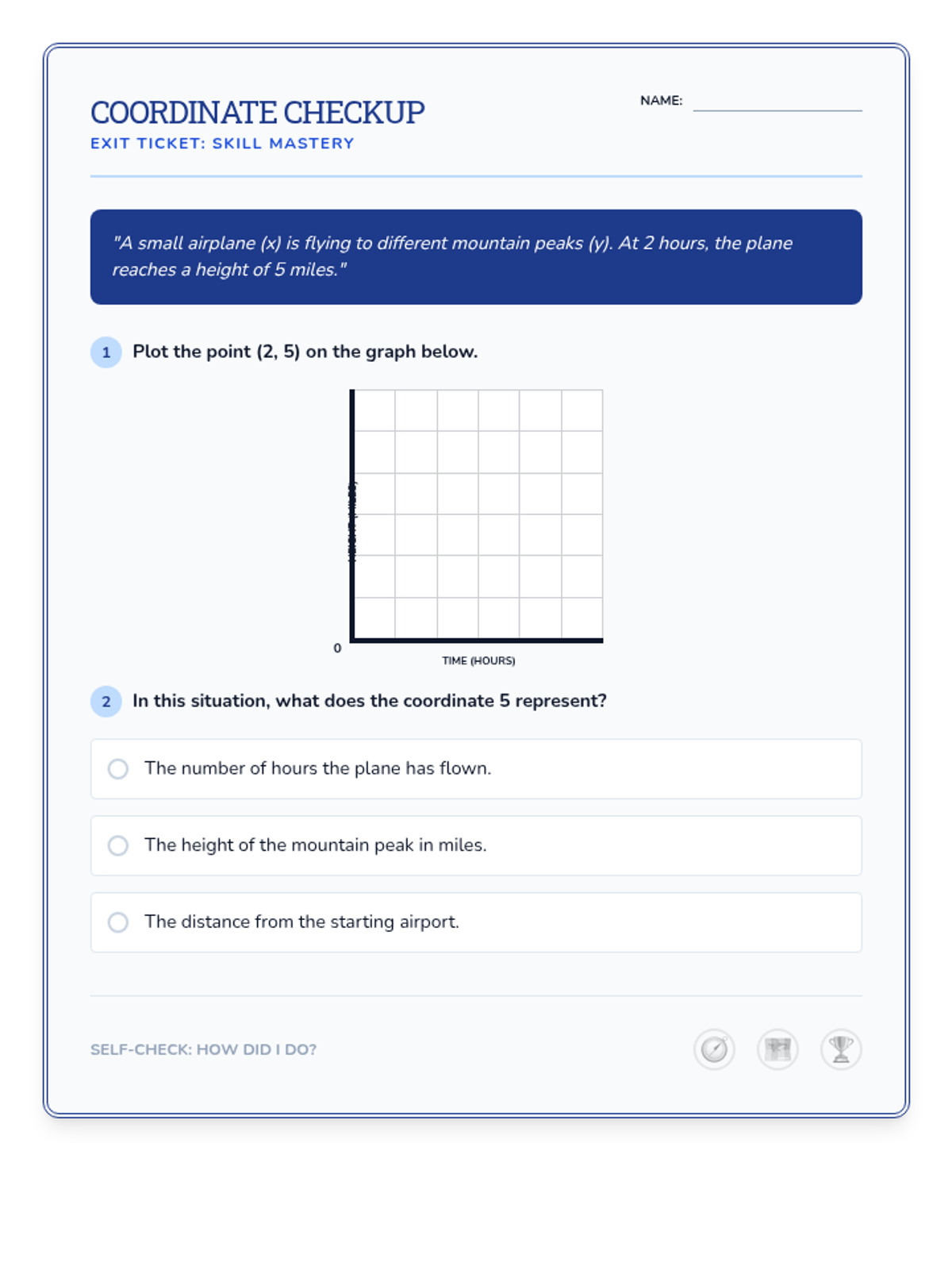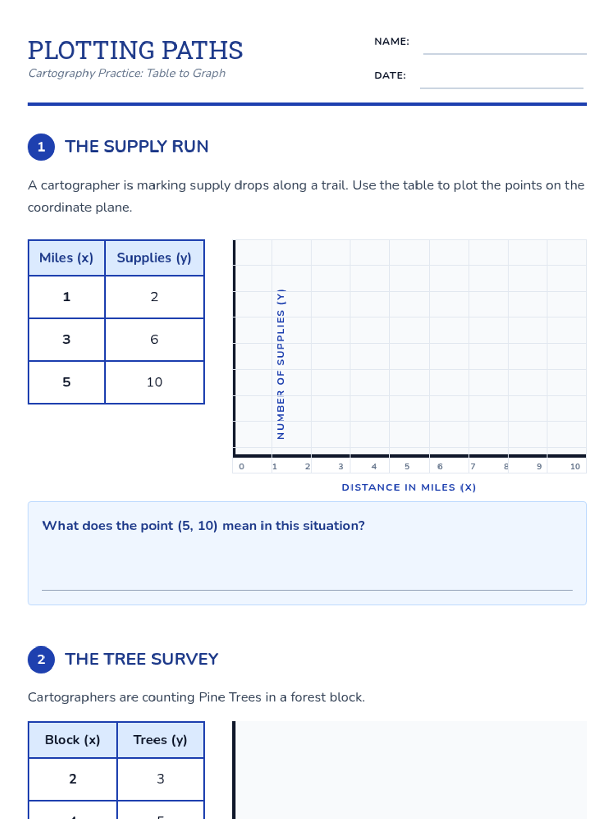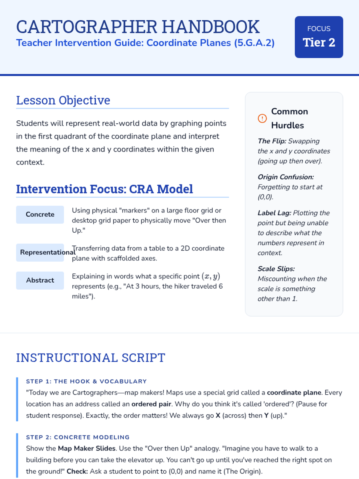 A Tier 2 intervention lesson focused on plotting ordered pairs in the first quadrant and interpreting their real-world meaning through a cartography theme. Students move from concrete tables to representational graphs and abstract interpretation.