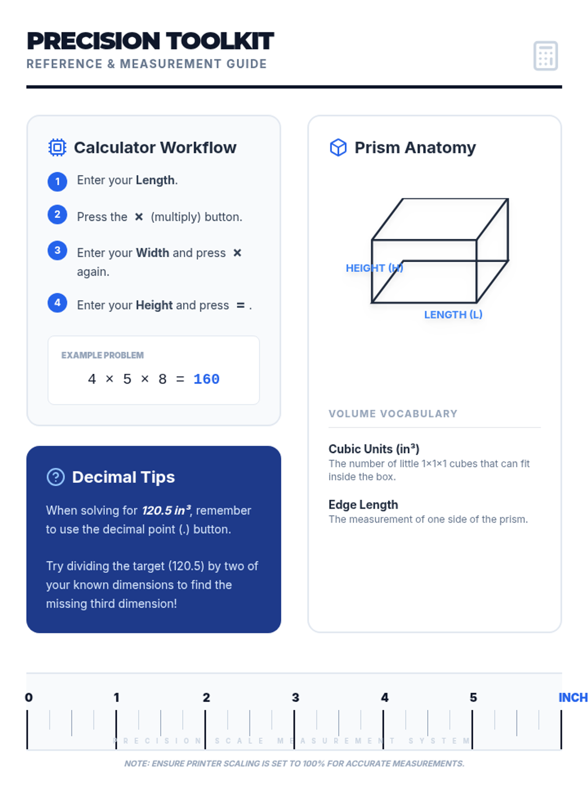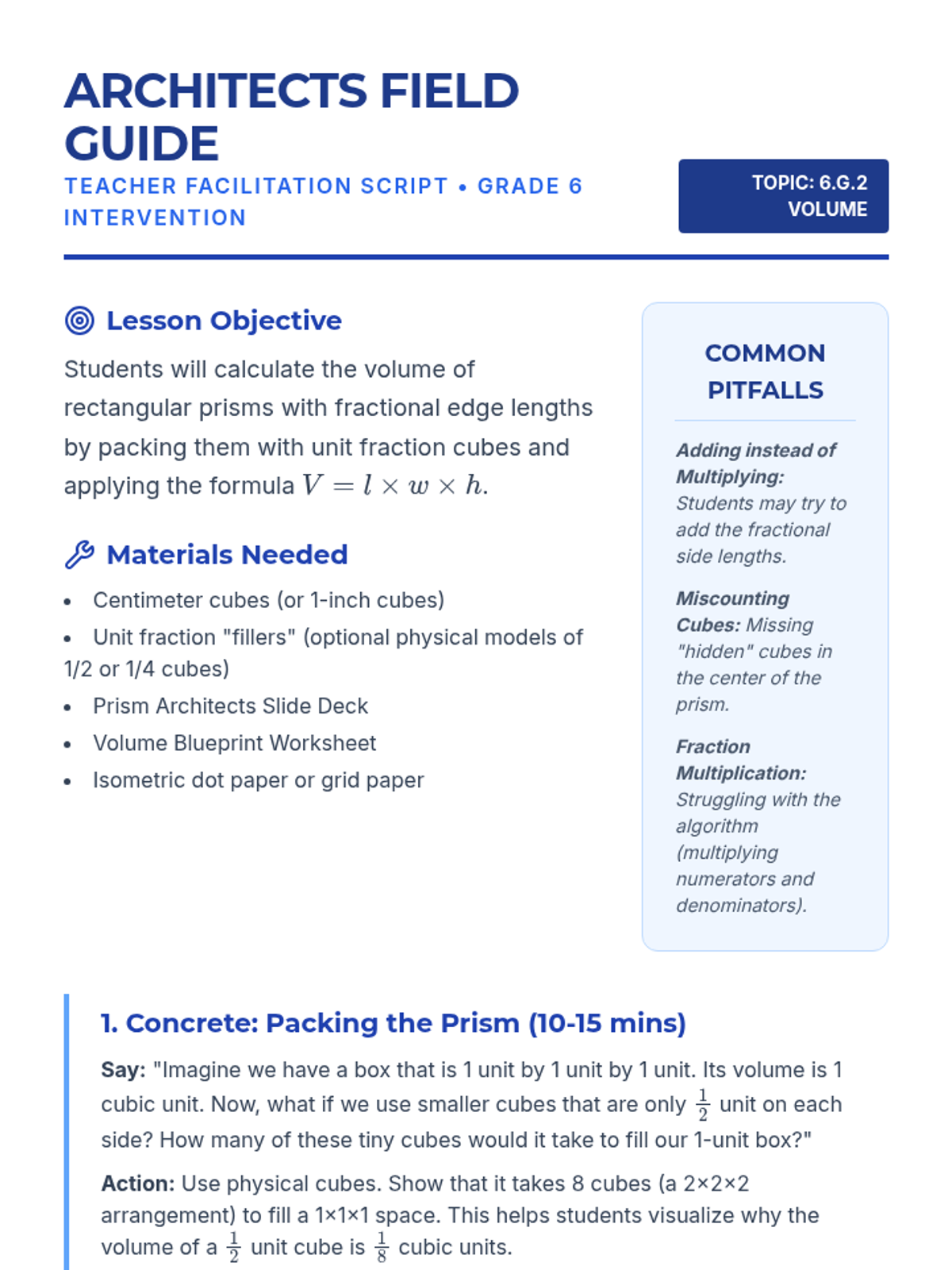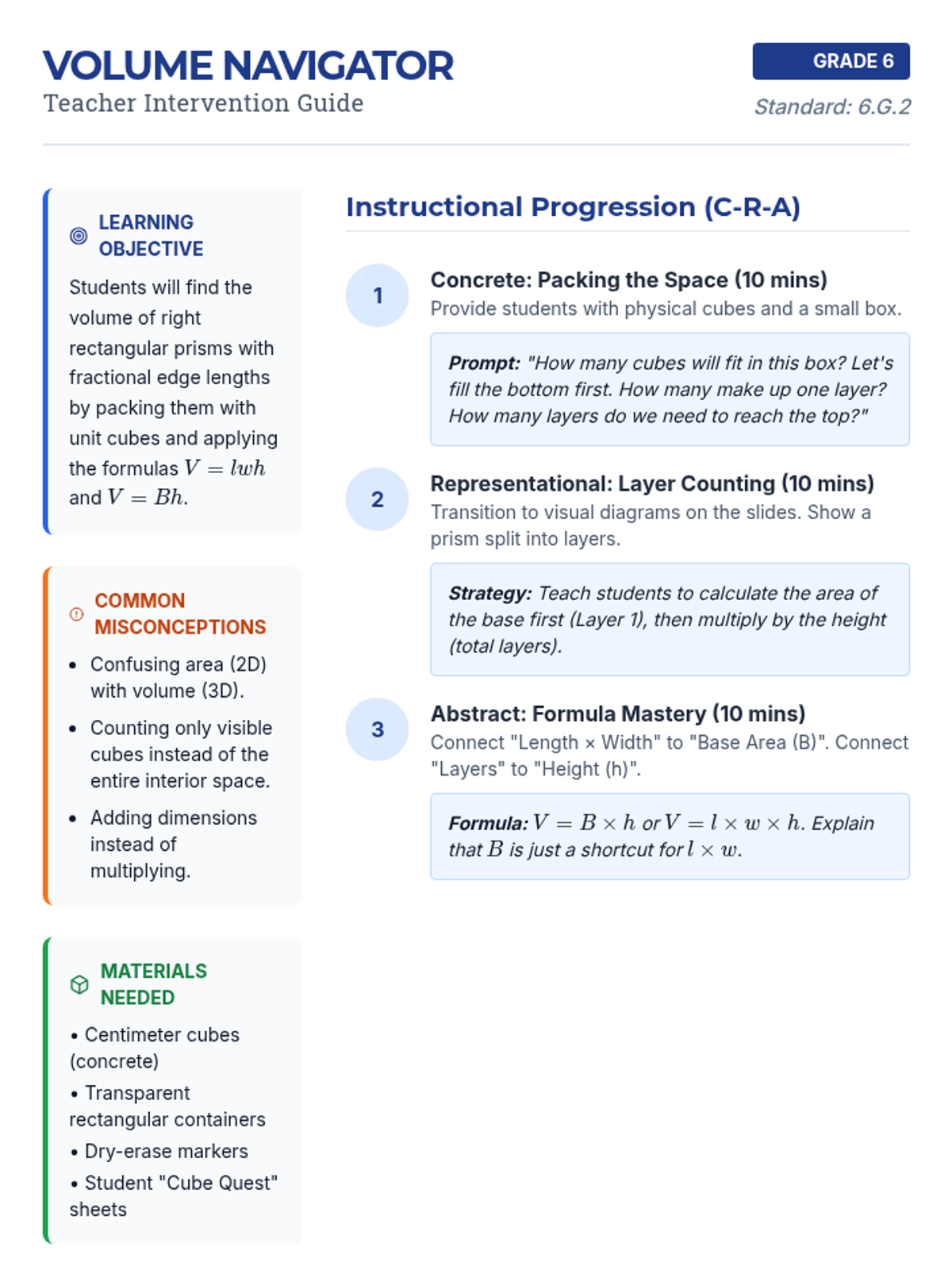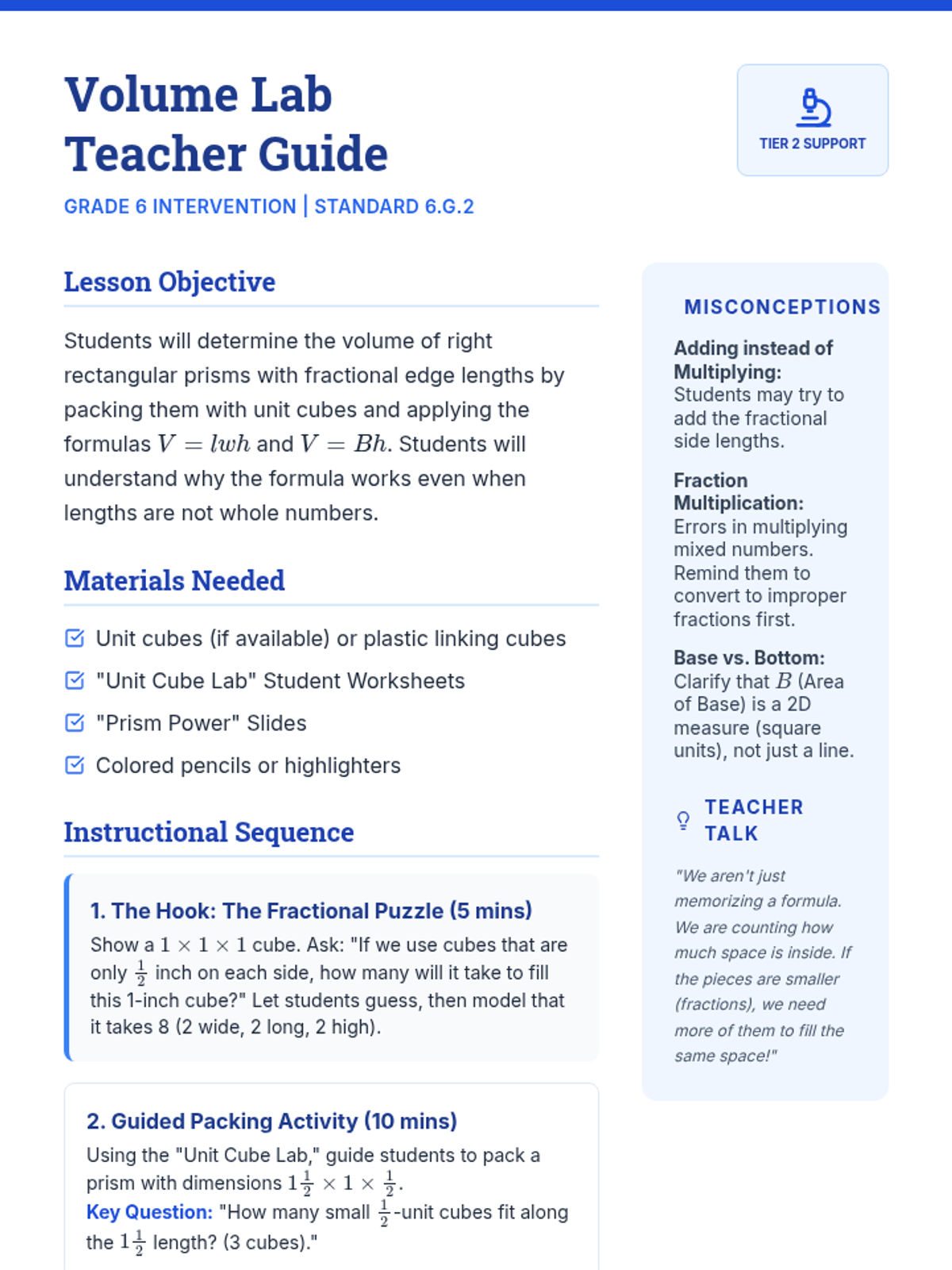 A Tier 2 small group intervention focused on understanding volume with fractional edge lengths through unit cube packing and formula application ($V = lwh$ and $V = Bh$). Students move from concrete packing models to abstract formula use.