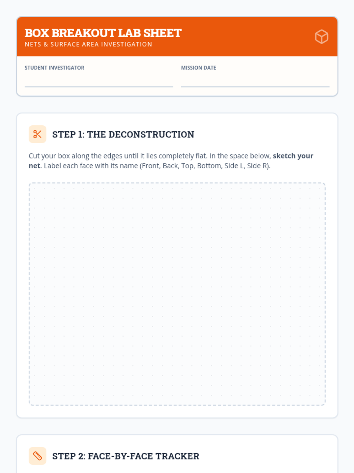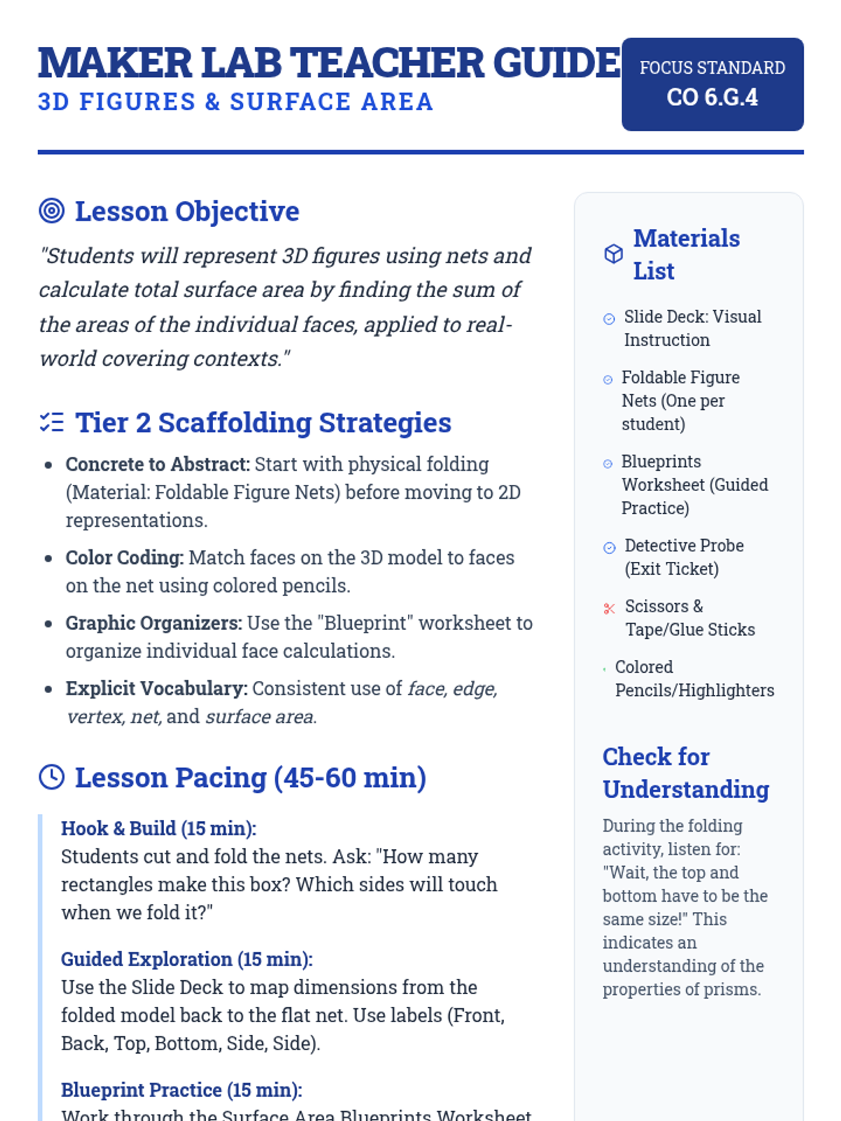 A targeted Tier 2 intervention lesson focusing on the relationship between 3D figures and their 2D nets. Students deconstruct real-world boxes to calculate surface area through face-by-face analysis and collaborative problem-solving.