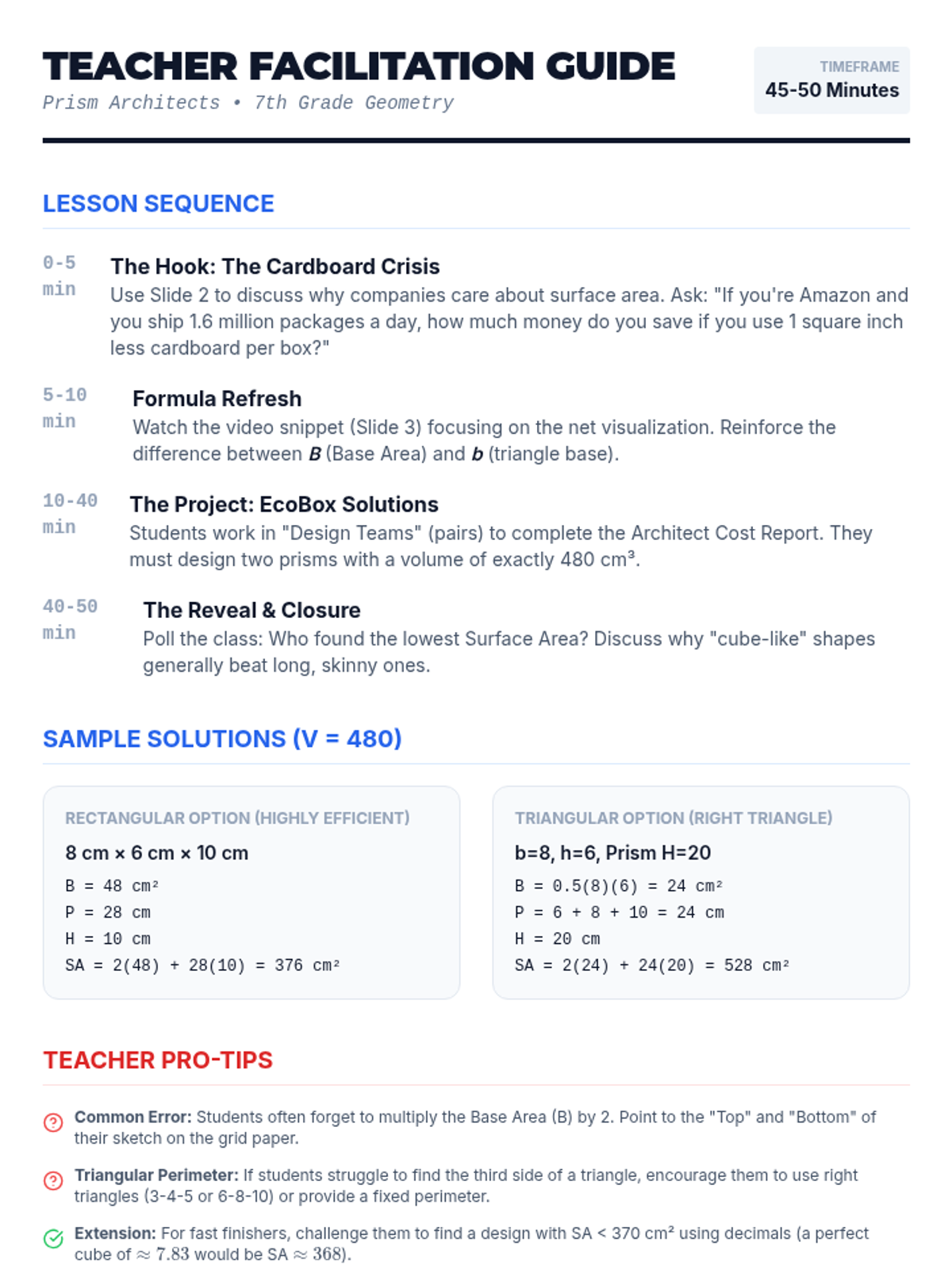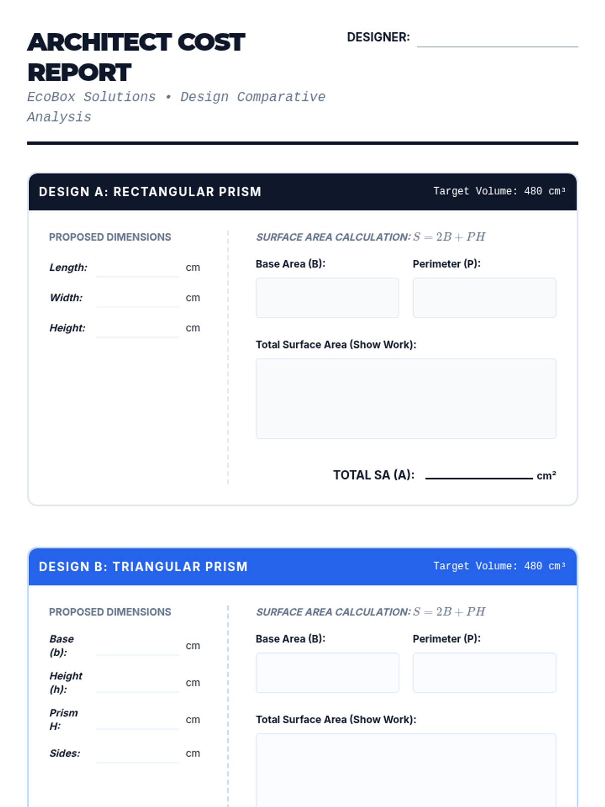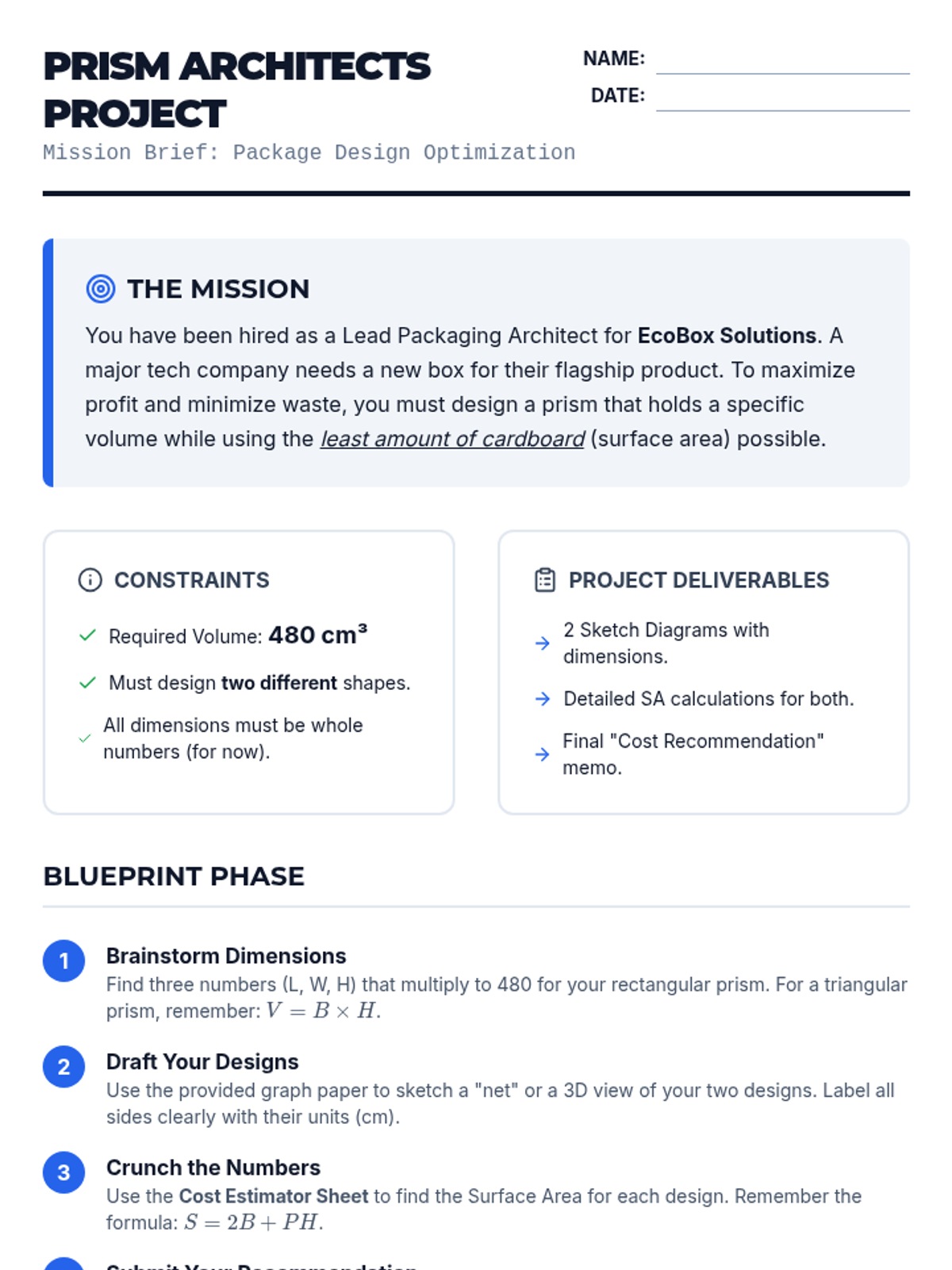 Students act as "Prism Architects" to design product packaging that minimizes surface area while maintaining a fixed volume. They apply surface area formulas to compare different geometric designs and identify the most cost-effective solution.