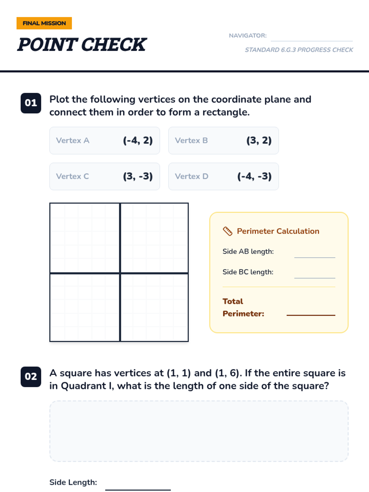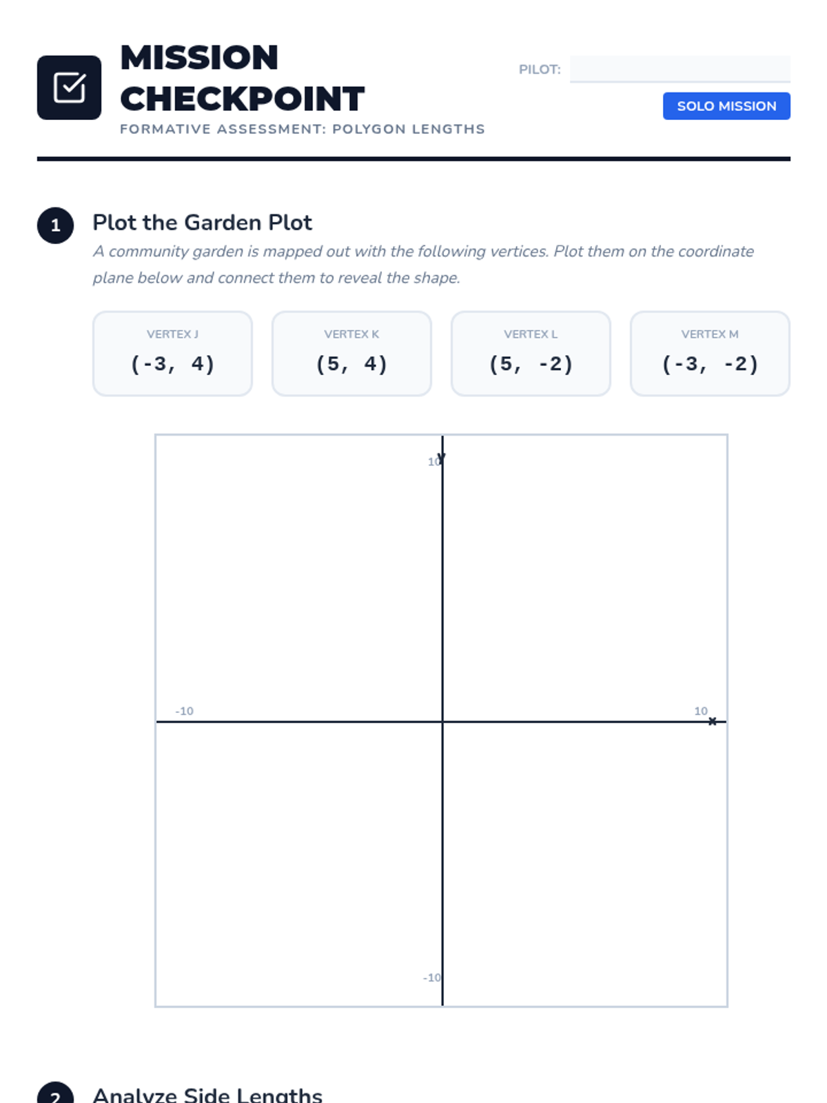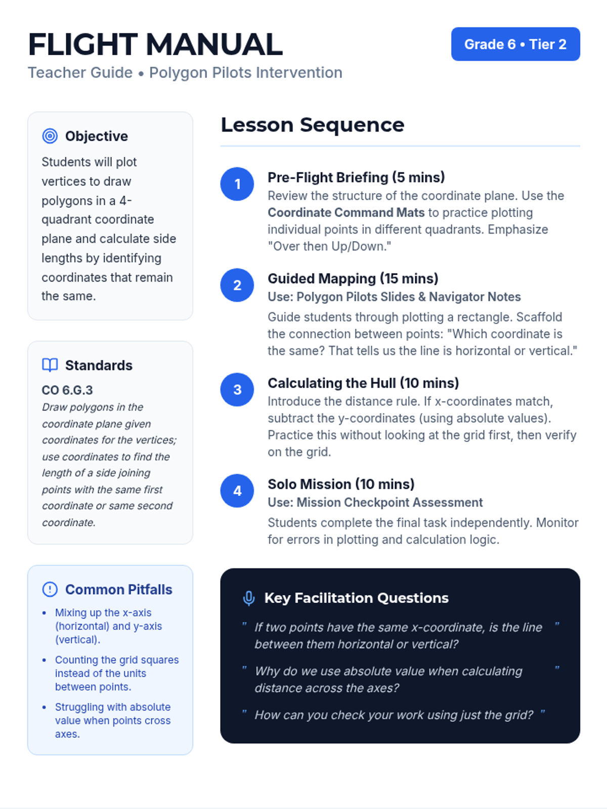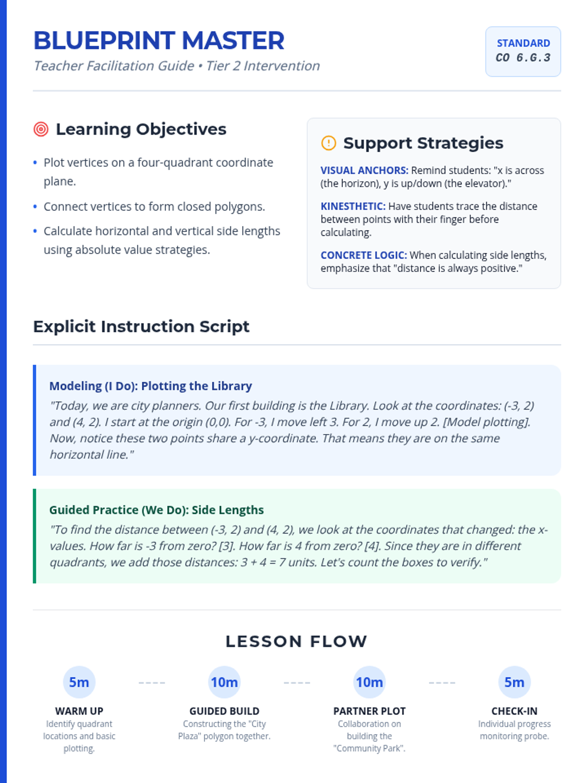 A Tier 2 intervention lesson focused on plotting vertices, drawing polygons, and calculating side lengths and perimeters on a coordinate plane. Designed for small group support with scaffolded steps and visual guides.