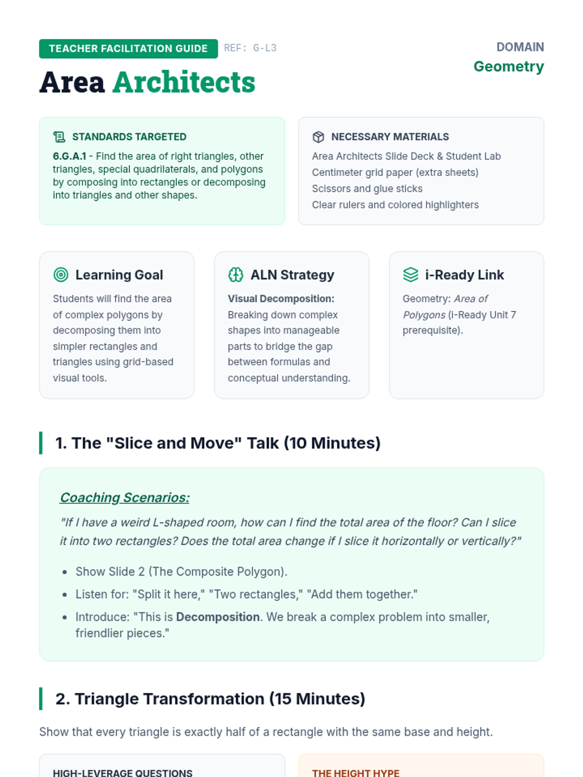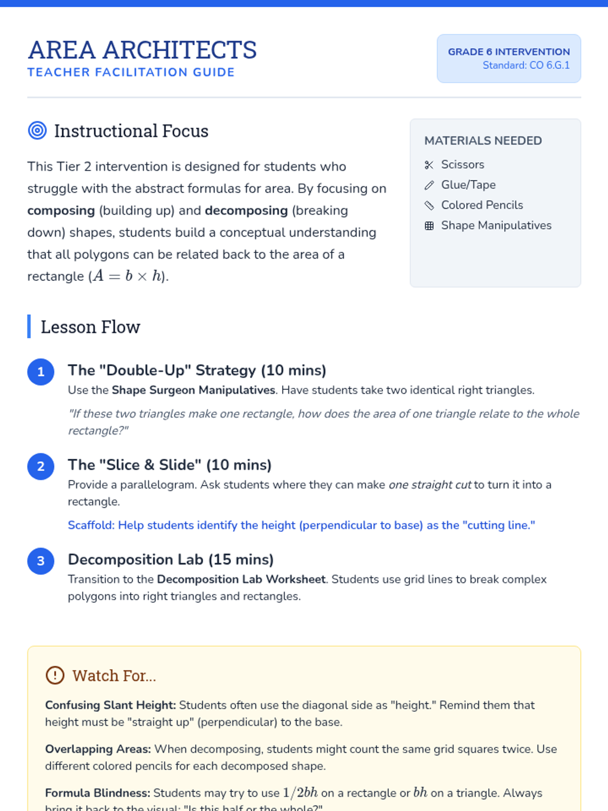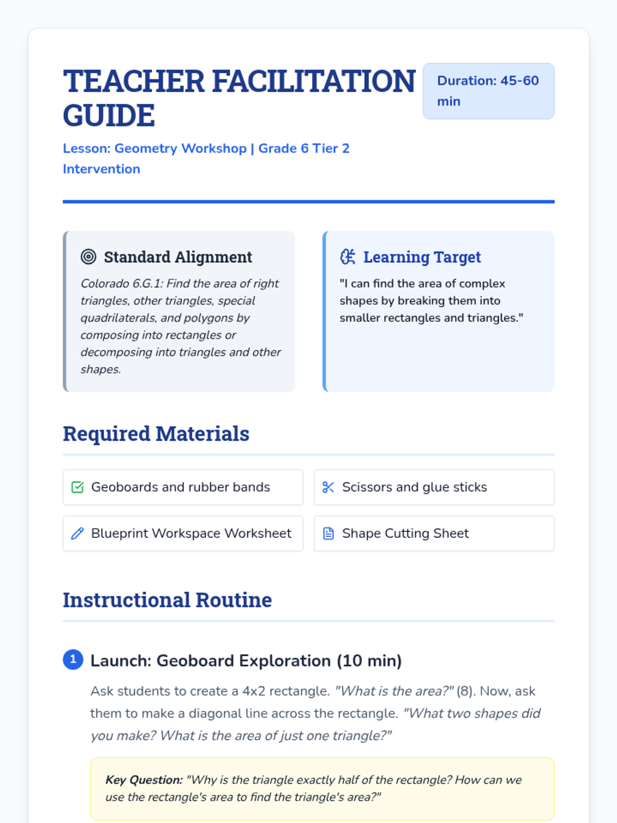 A Tier 2 intervention lesson focusing on finding the area of triangles, quadrilaterals, and polygons by composing and decomposing shapes. Students use geoboards, hands-on cutting, and scaffolded blueprints to master area concepts.