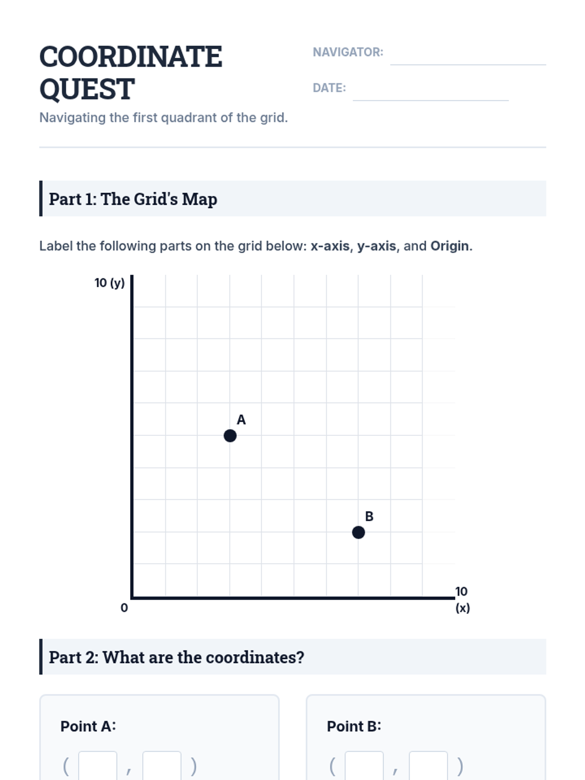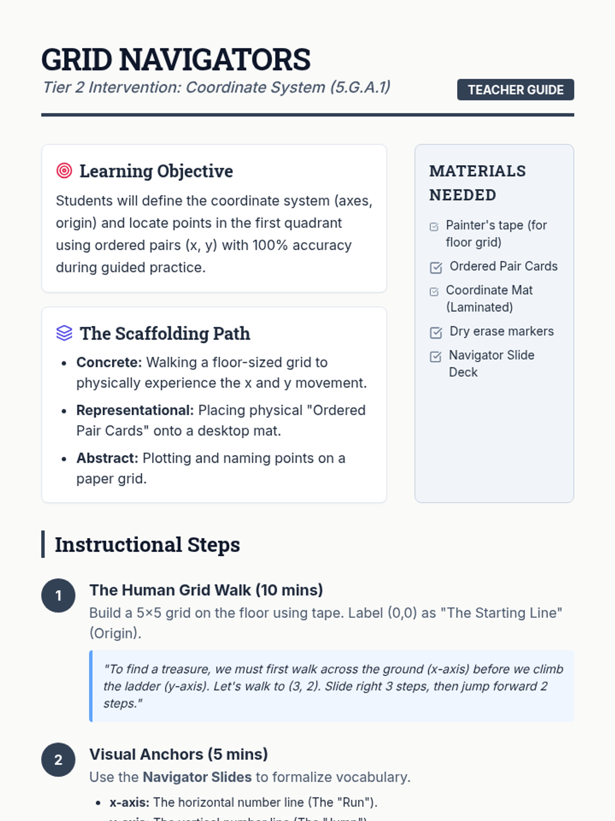 A Tier 2 intervention lesson focused on mastering the coordinate plane through tactile floor activities and scaffolded grid work. Students will identify axes, the origin, and accurately plot points using ordered pairs.