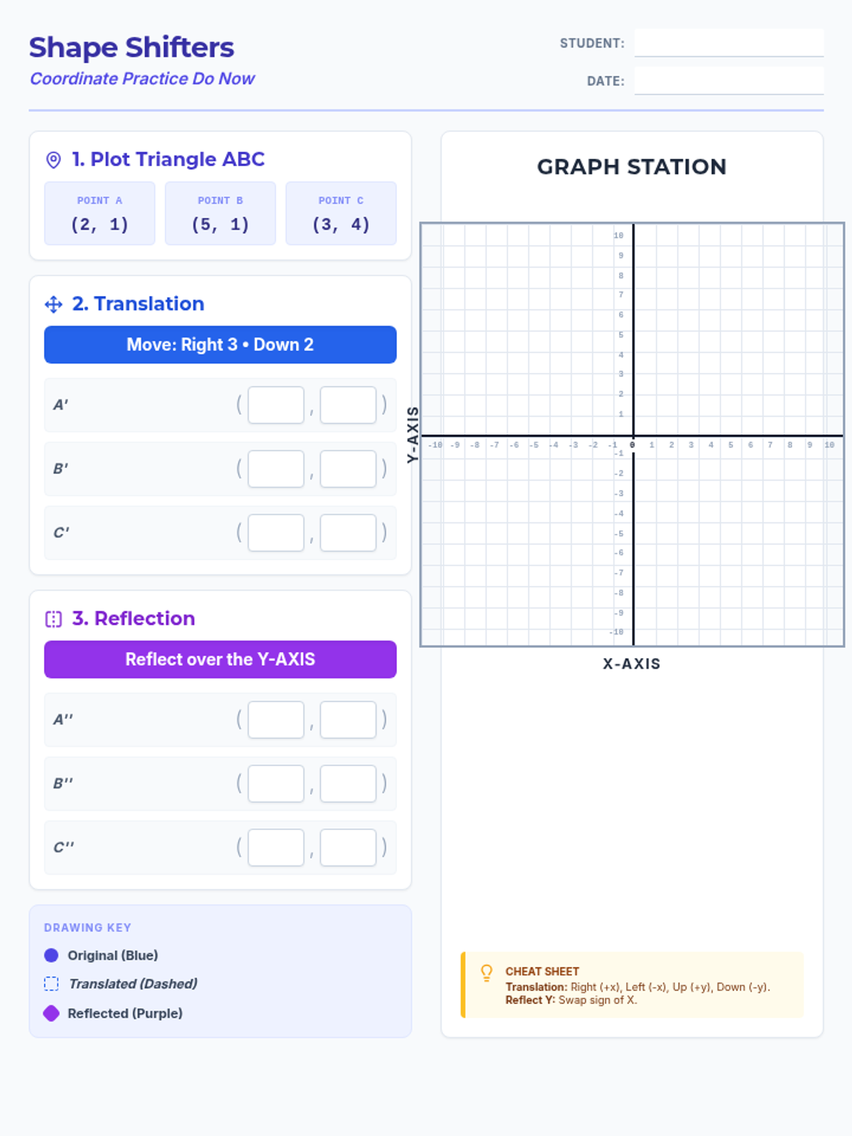 A quick starter activity for reviewing coordinate transformations, specifically translations and reflections, designed for accessibility.