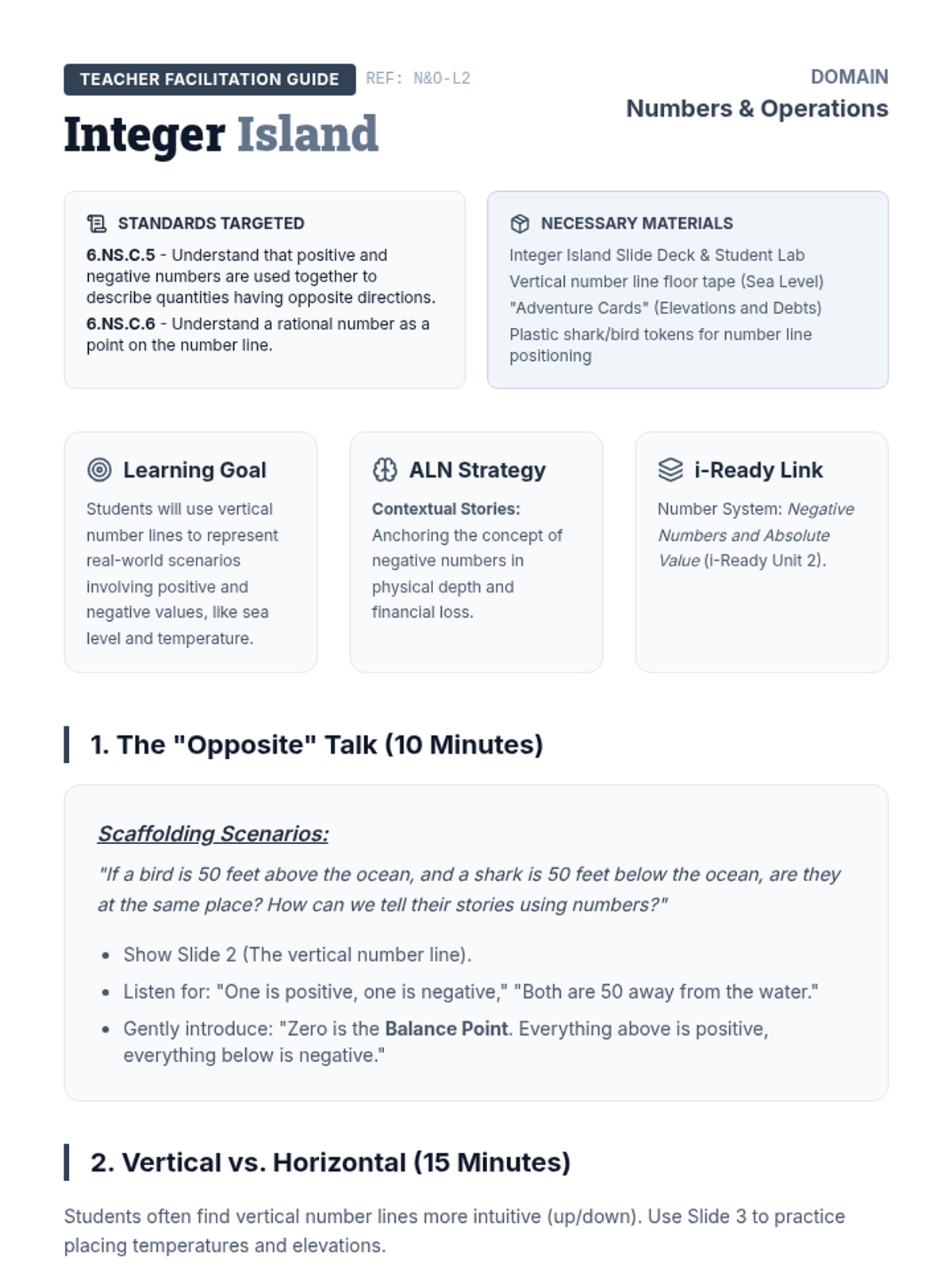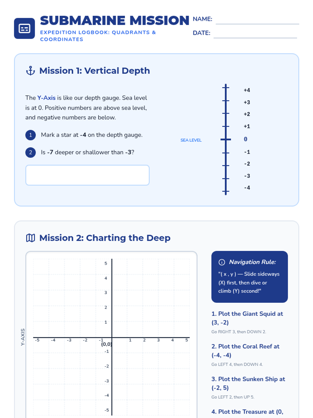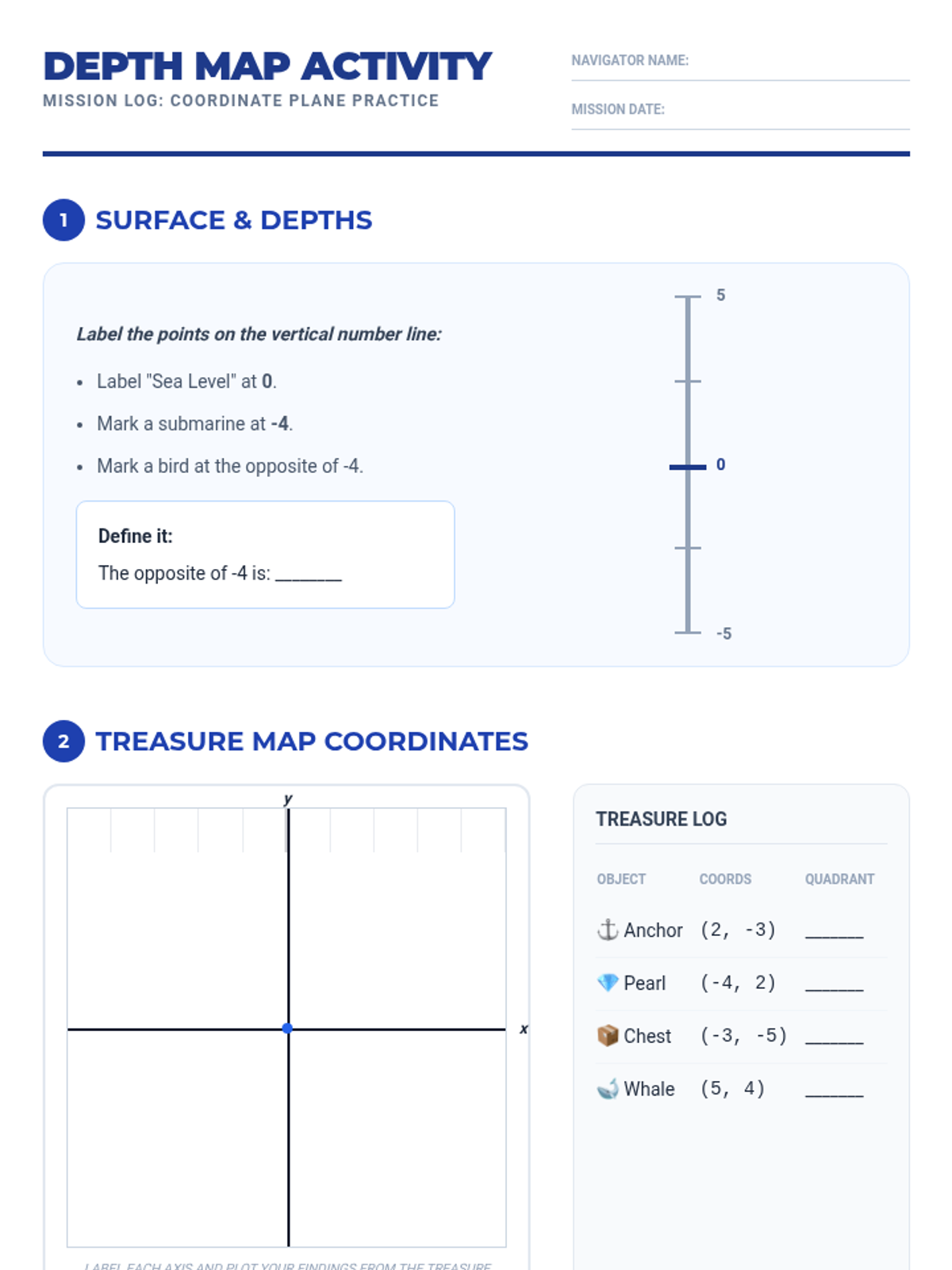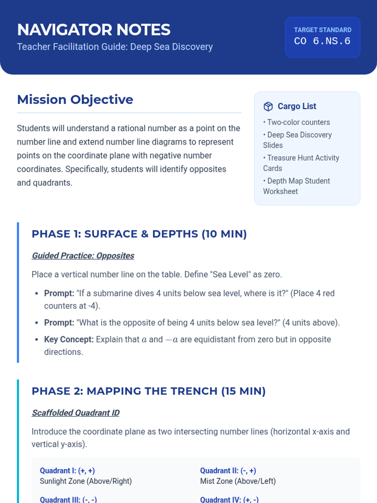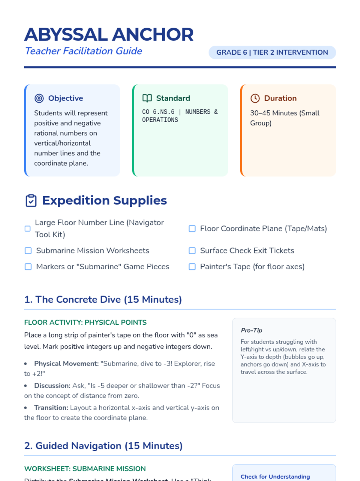 A targeted Tier 2 intervention lesson for 6th graders to master negative numbers on number lines and coordinate planes using a "Deep Sea Explorer" theme. Includes hands-on floor activities, scaffolded practice, and a formal assessment check.