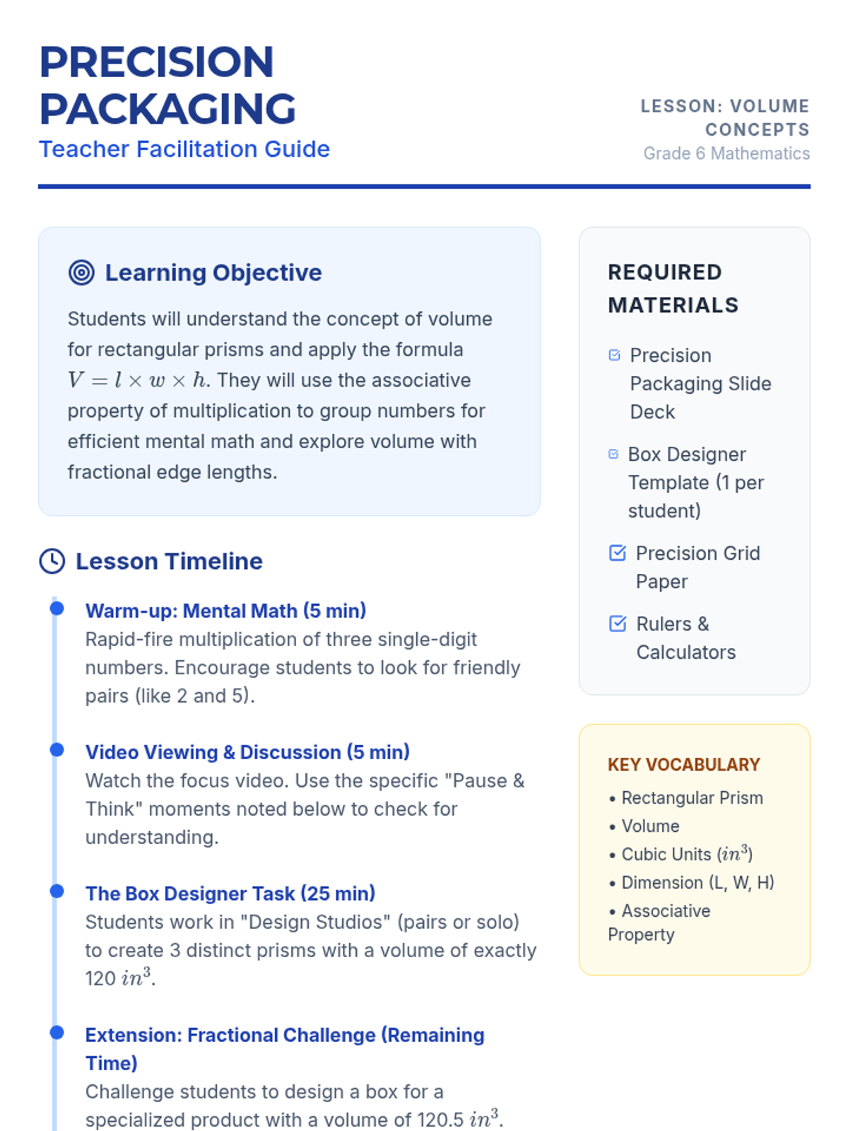 A 6th-grade math lesson where students apply multi-digit multiplication to calculate volume and act as packaging engineers to design custom containers.