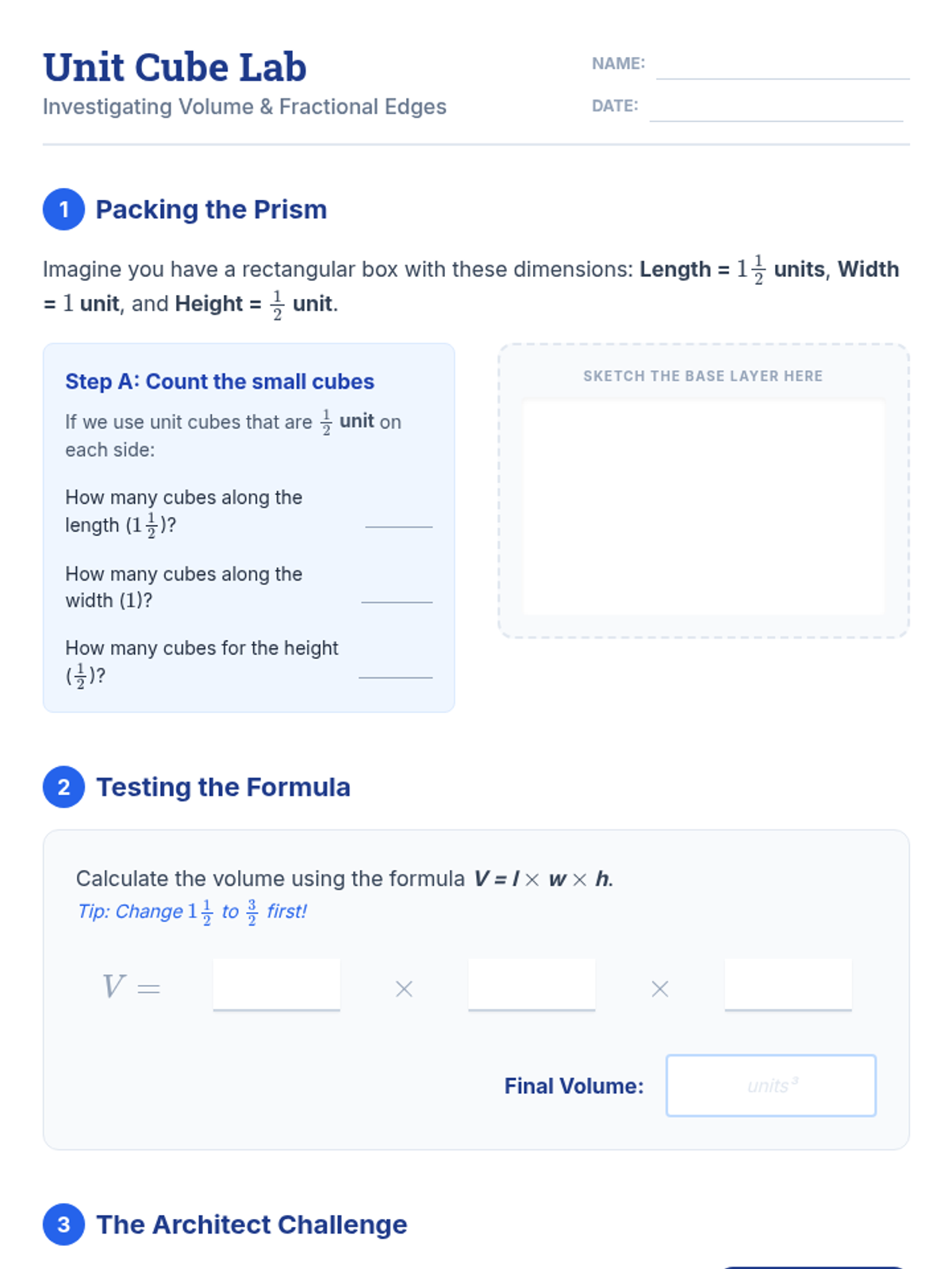 A hands-on exploration of volume for cubes and rectangular prisms, transitioning from counting unit cubes to applying the formula. Designed for diverse learners with visual aids, partner challenges, and blueprint-themed practice.