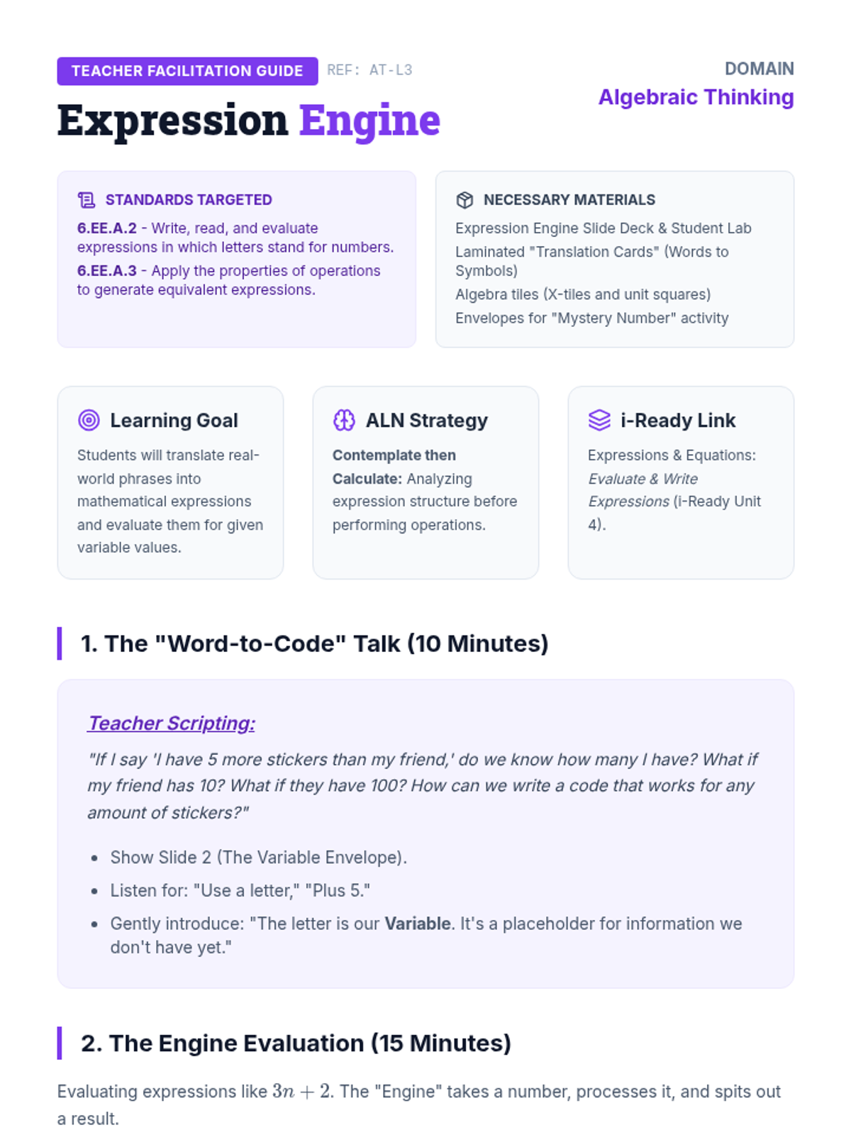 Focuses on translating real-world phrases into algebraic expressions and evaluating them using 'Contemplate then Calculate' strategies.