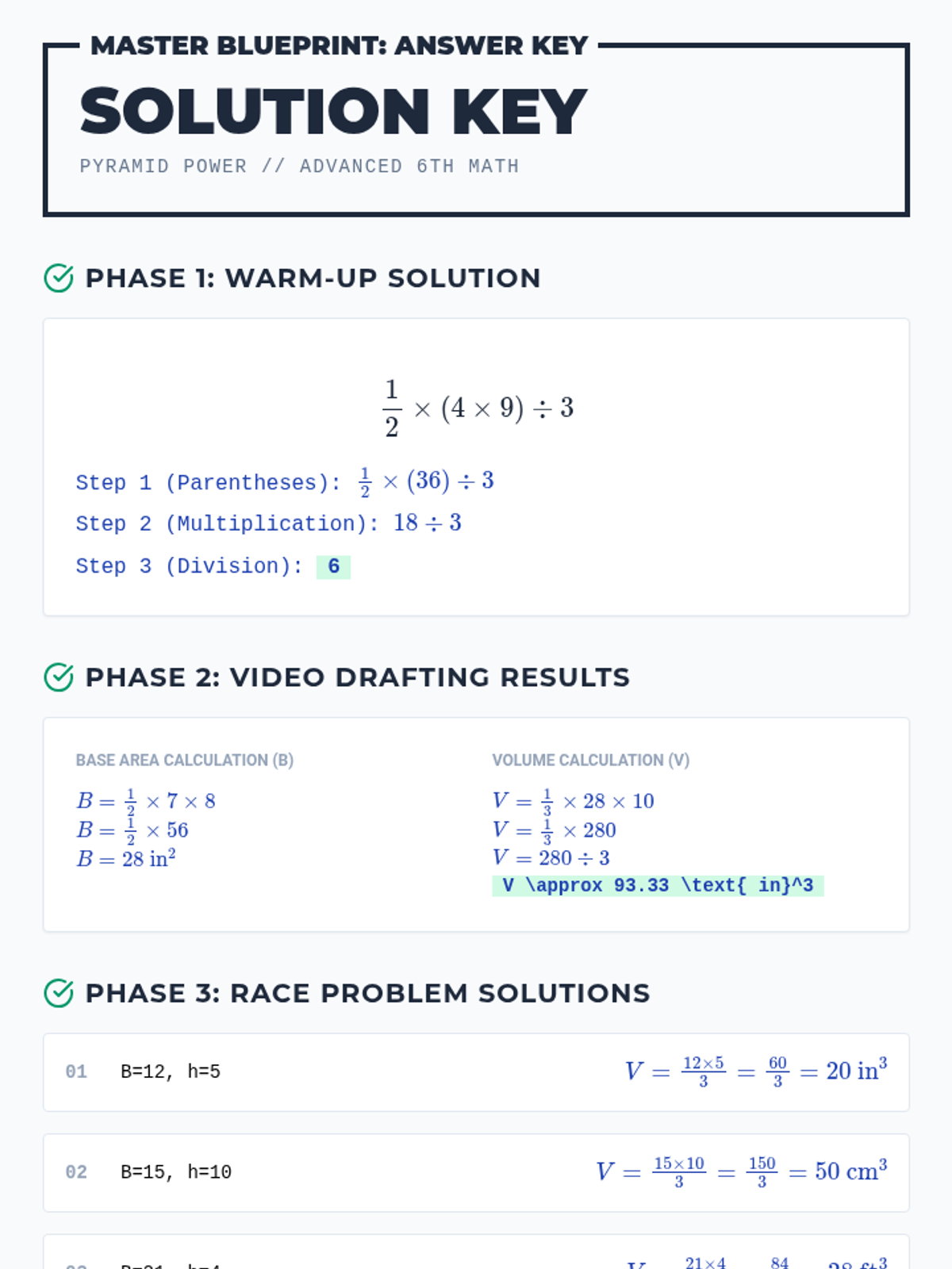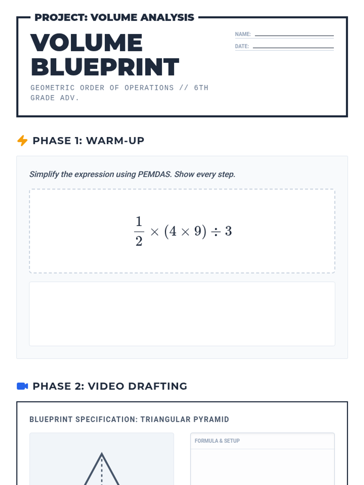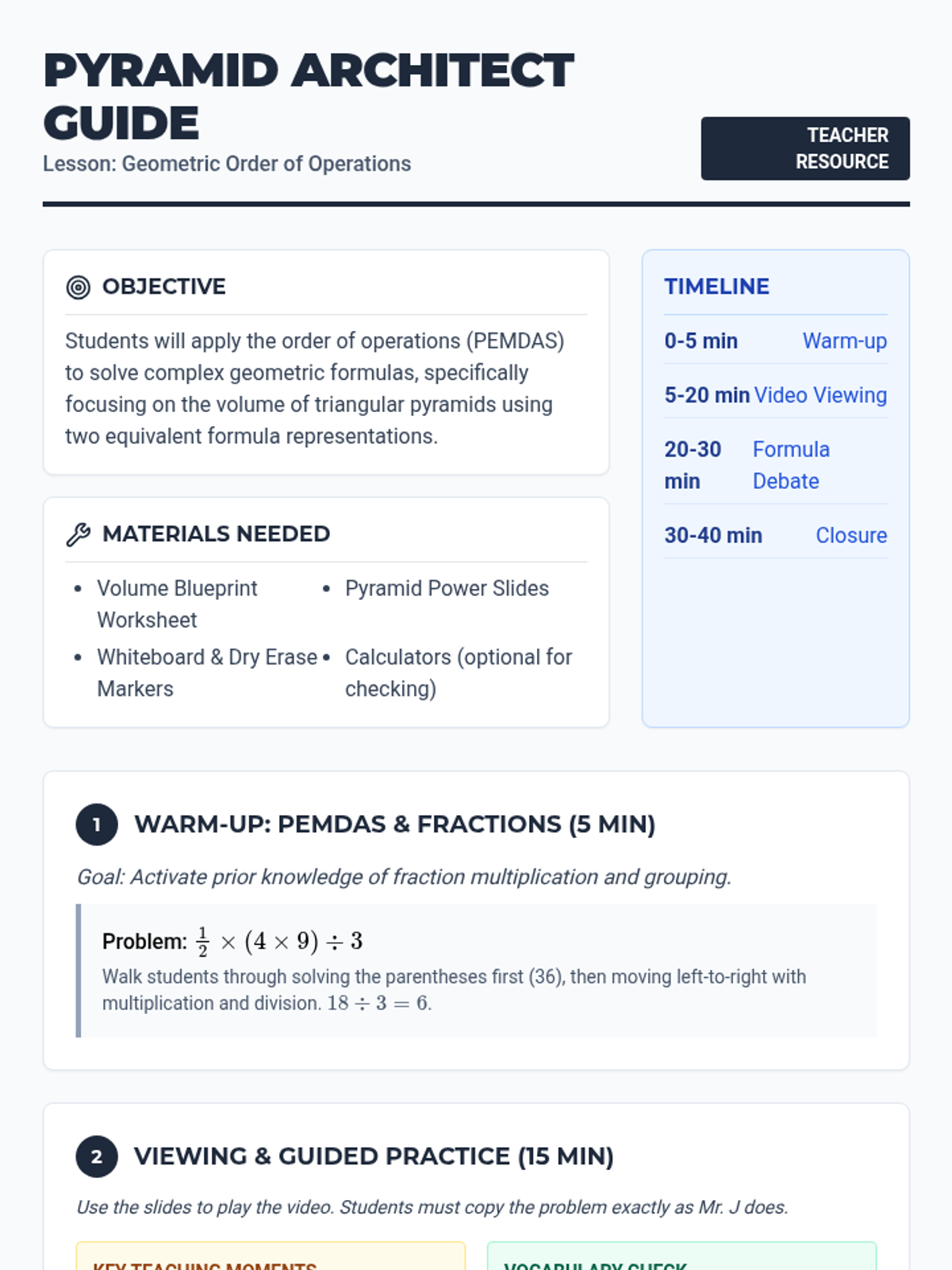 Students will apply the order of operations to solve complex geometric formulas for the volume of triangular pyramids. This lesson uses a comparative approach to explore equivalent formulas and reinforces fraction operations within a geometric context.