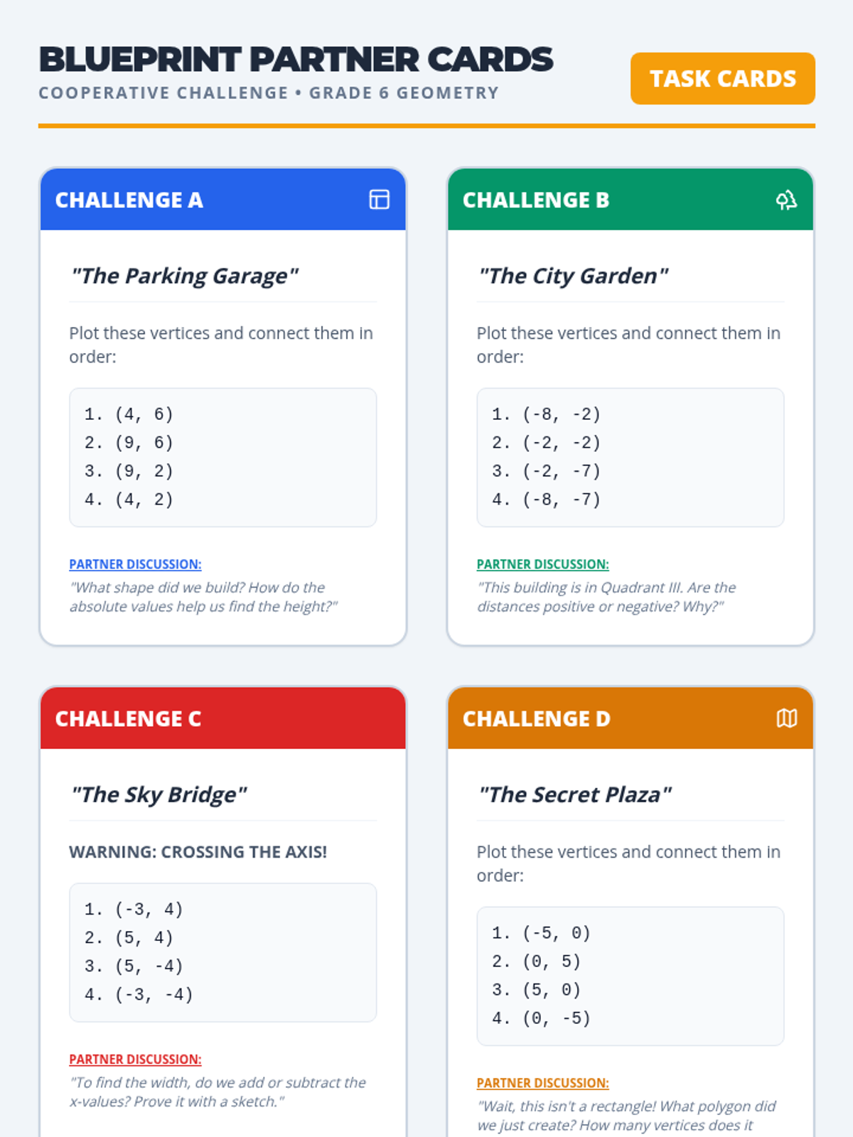 A small group intervention lesson focused on plotting points in all four quadrants and calculating horizontal and vertical distances.