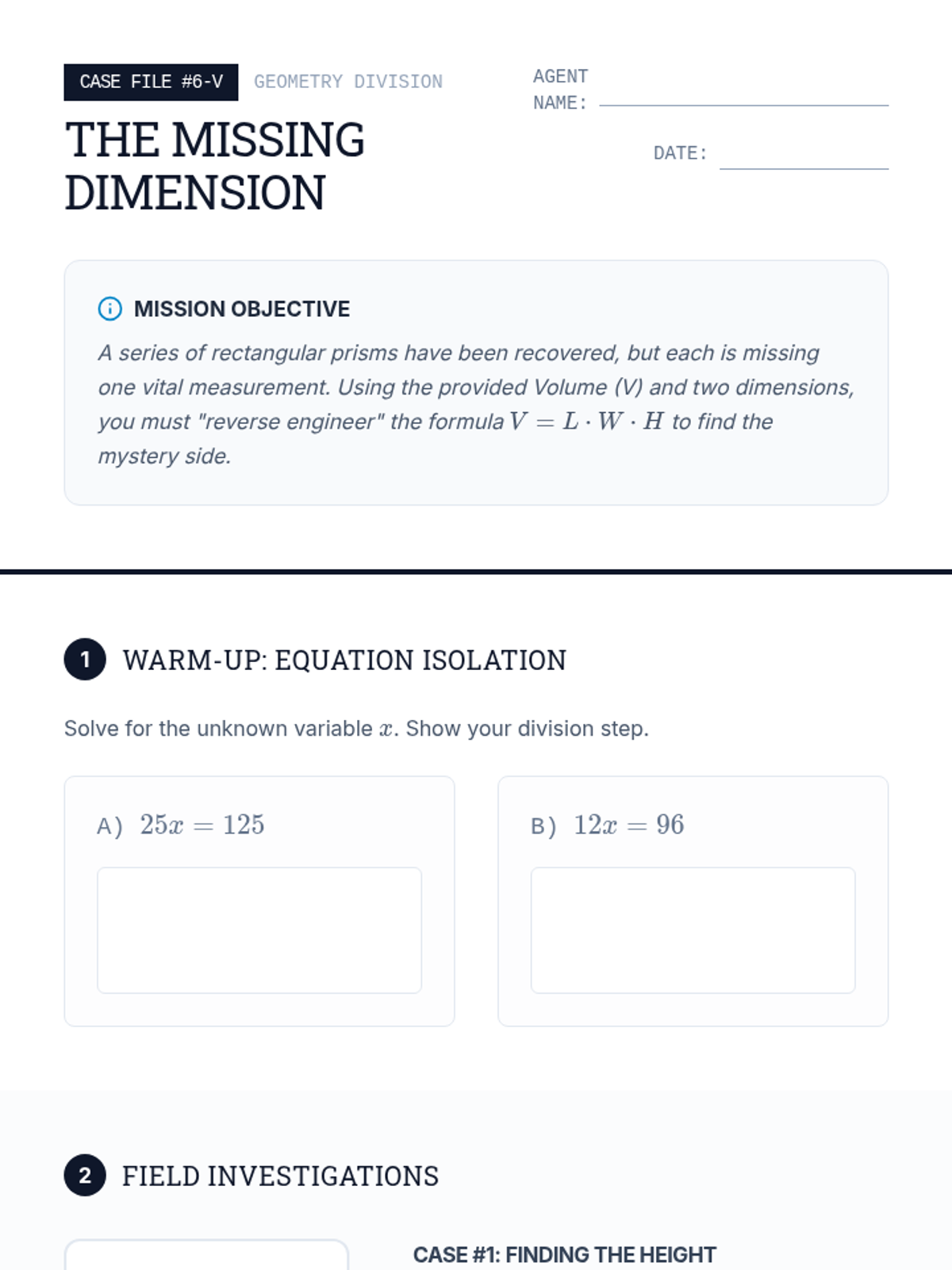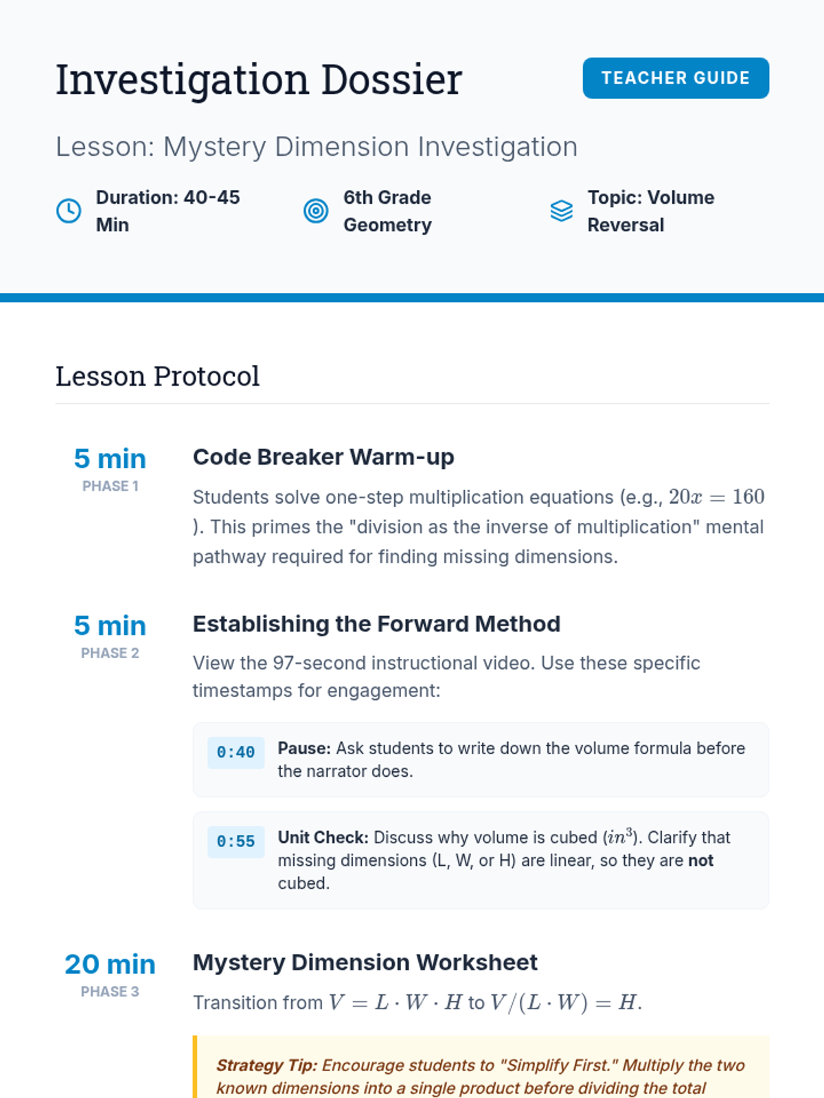 A 6th-grade geometry lesson where students 'reverse engineer' the volume formula to find missing dimensions of rectangular prisms. The lesson includes a warm-up, a video-based exploration of the standard formula, and a main activity focused on solving for unknown variables.