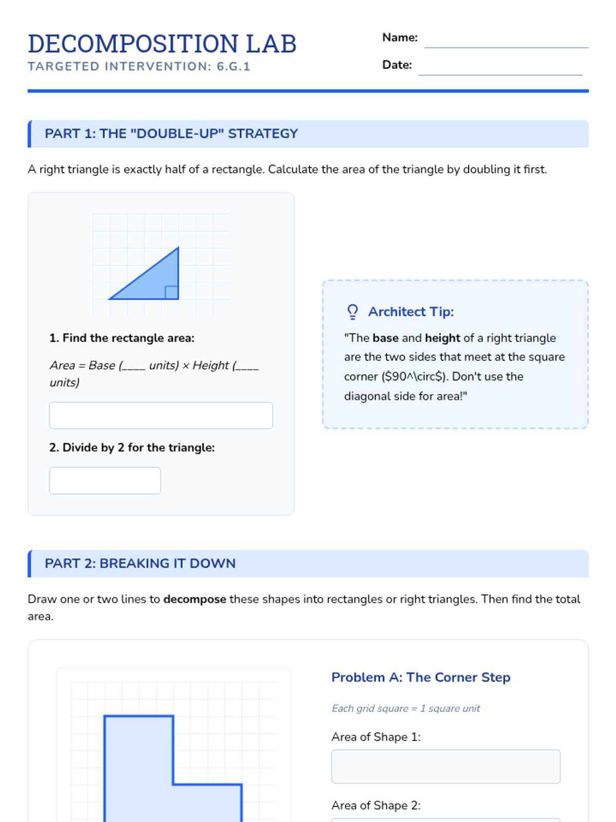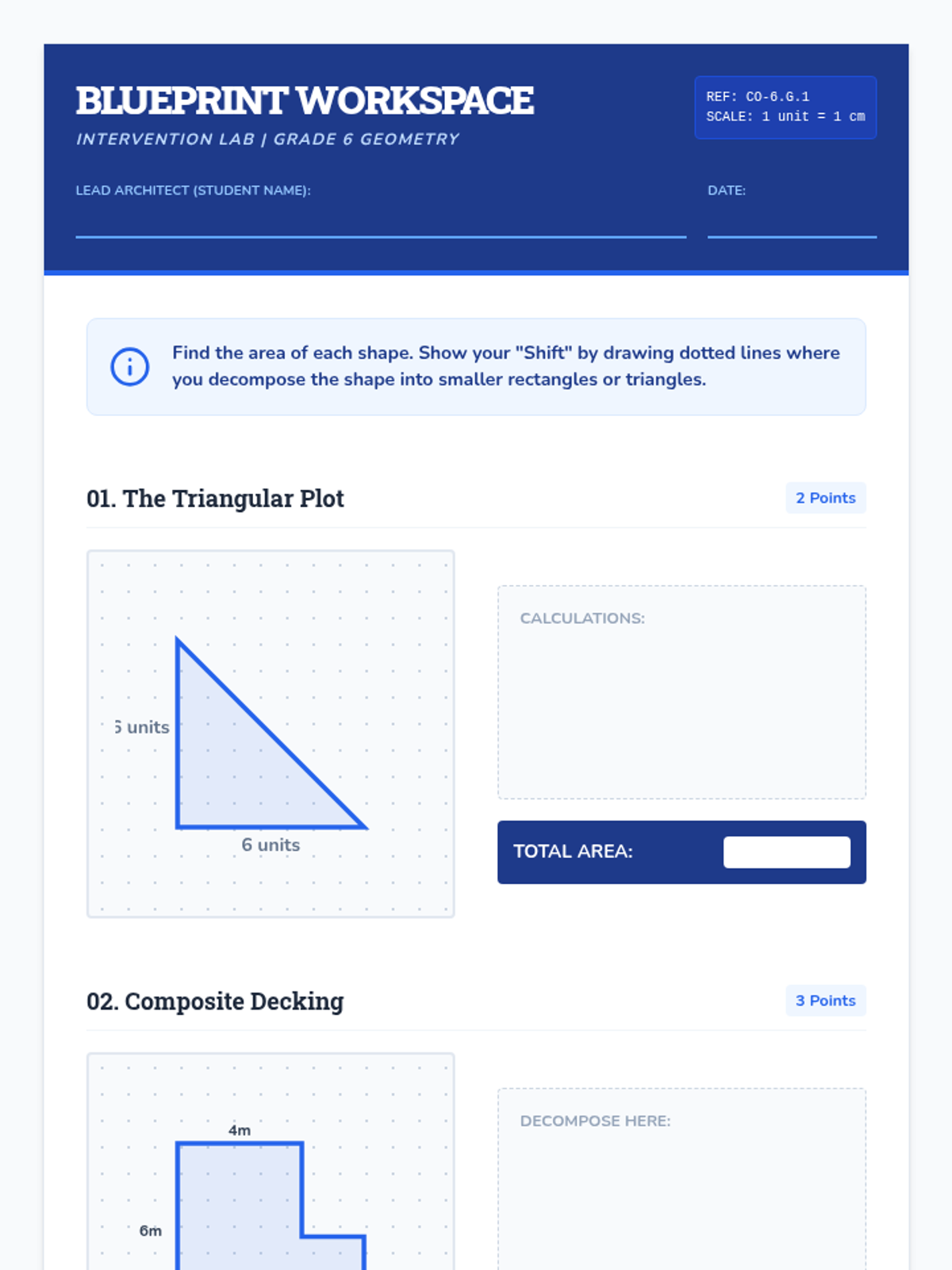 A Tier 2 intervention lesson focusing on decomposing composite shapes into rectangles and triangles to find total area, using a blueprint and tangram-inspired approach.