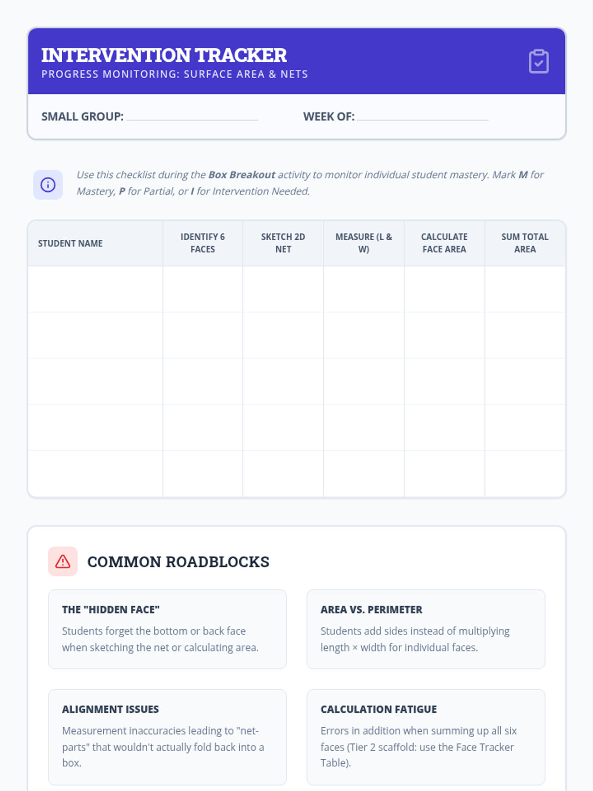 A targeted Tier 2 intervention lesson for 6th grade students on finding the surface area of prisms and pyramids by 'unfolding' them into nets. This lesson uses a construction blueprint theme to help students track and calculate the area of individual faces before summing them for the total surface area.