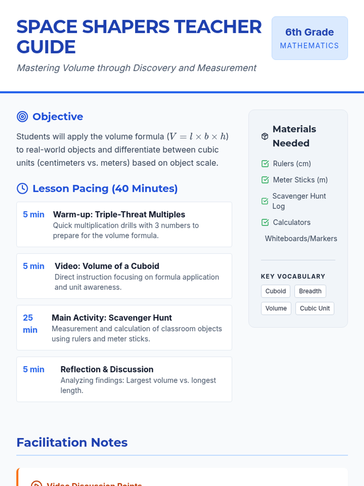 A hands-on geometry lesson for 6th graders to master the volume of rectangular prisms (cuboids) through video analysis and a classroom scavenger hunt. Students will measure real-world objects, apply the volume formula, and differentiate between metric units.