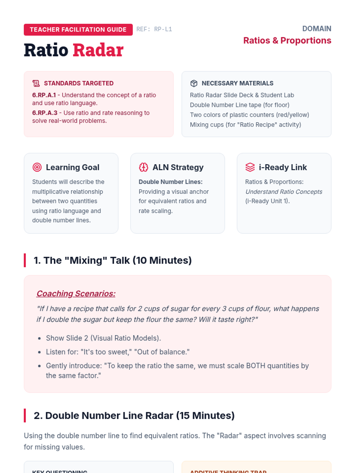 Explores the conceptual meaning of ratios and proportional relationships using 'Double Number Lines' and visual models to bridge i-Ready 6th grade gaps.