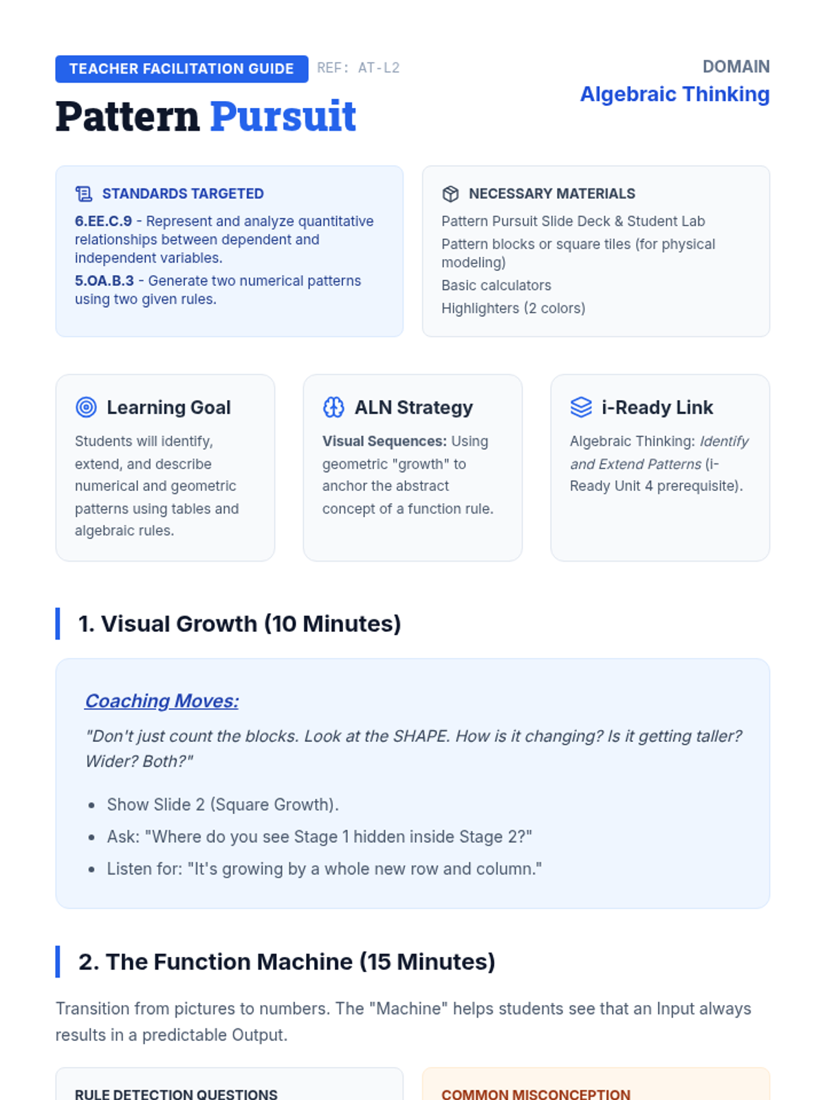 Uses visual sequences and function machines to help students identify, extend, and describe numerical patterns and rules.