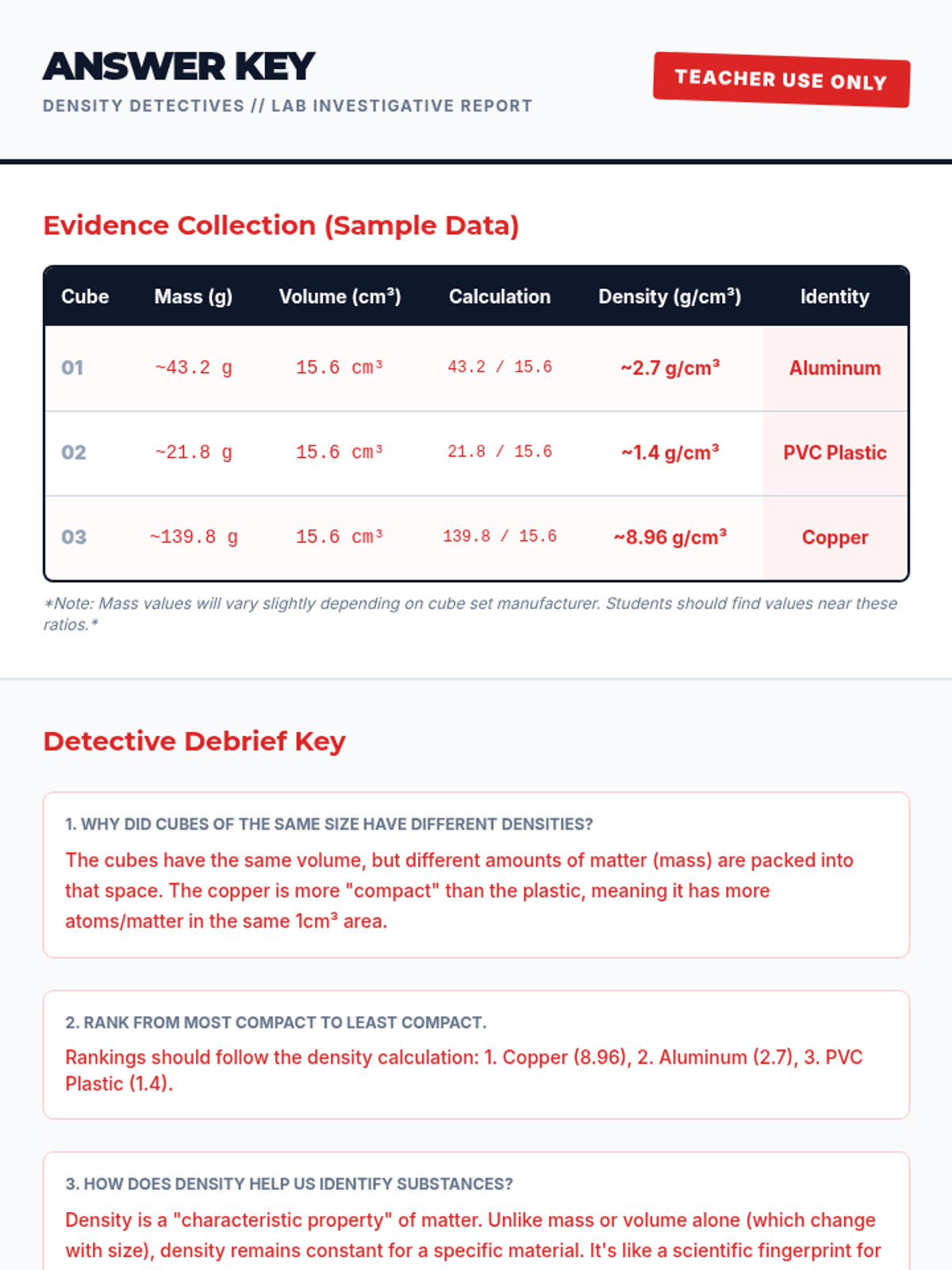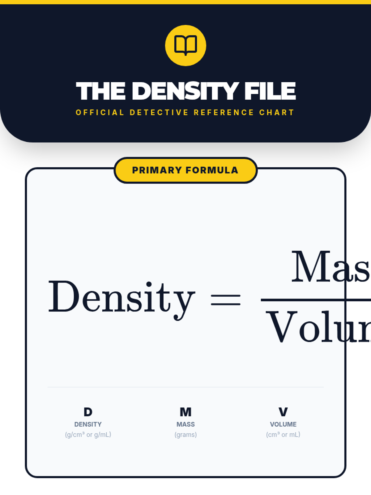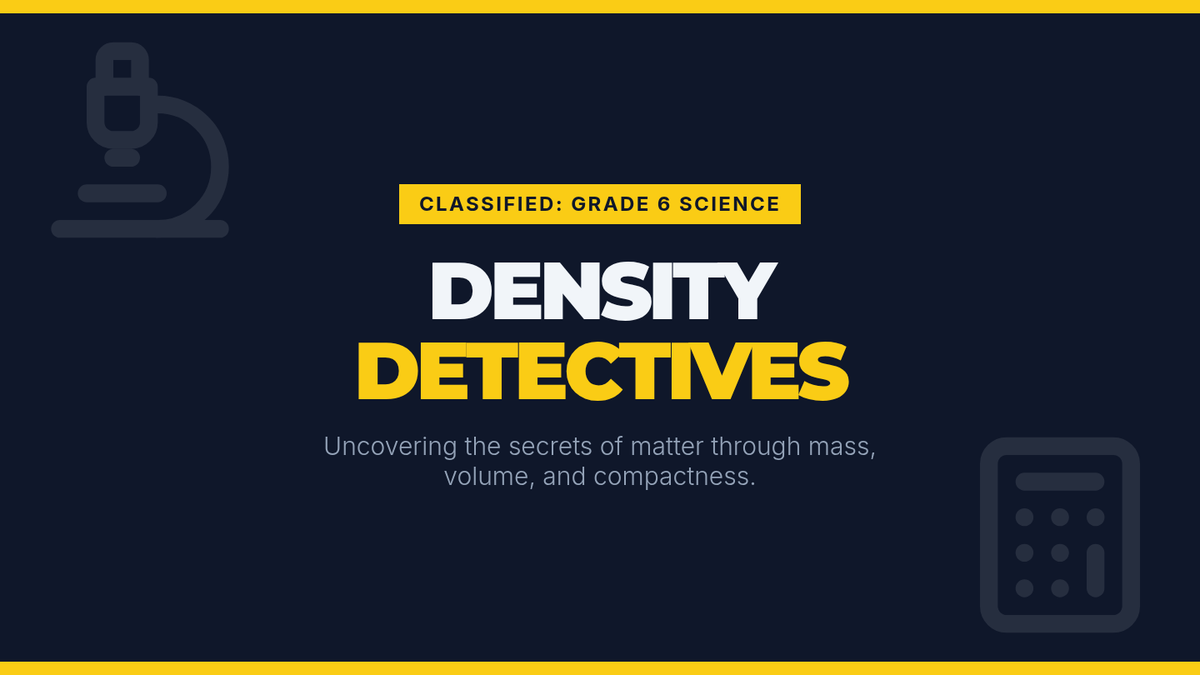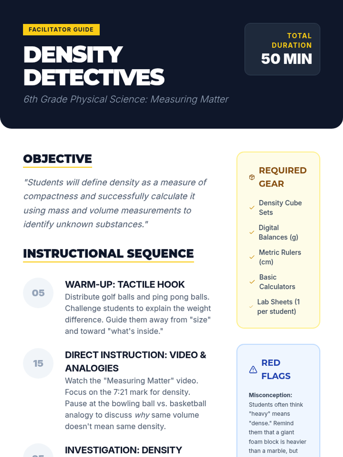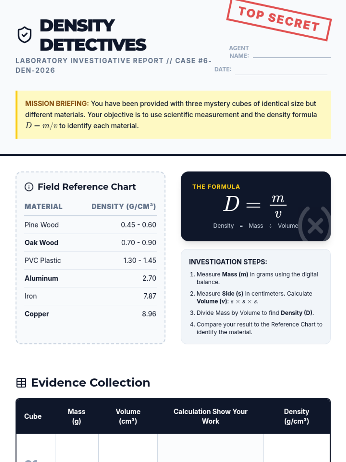 A comprehensive 6th-grade science lesson exploring density through hands-on measurement and a detective-themed investigation. Students will learn the density formula, calculate the density of various materials, and use a reference guide to identify unknown substances.