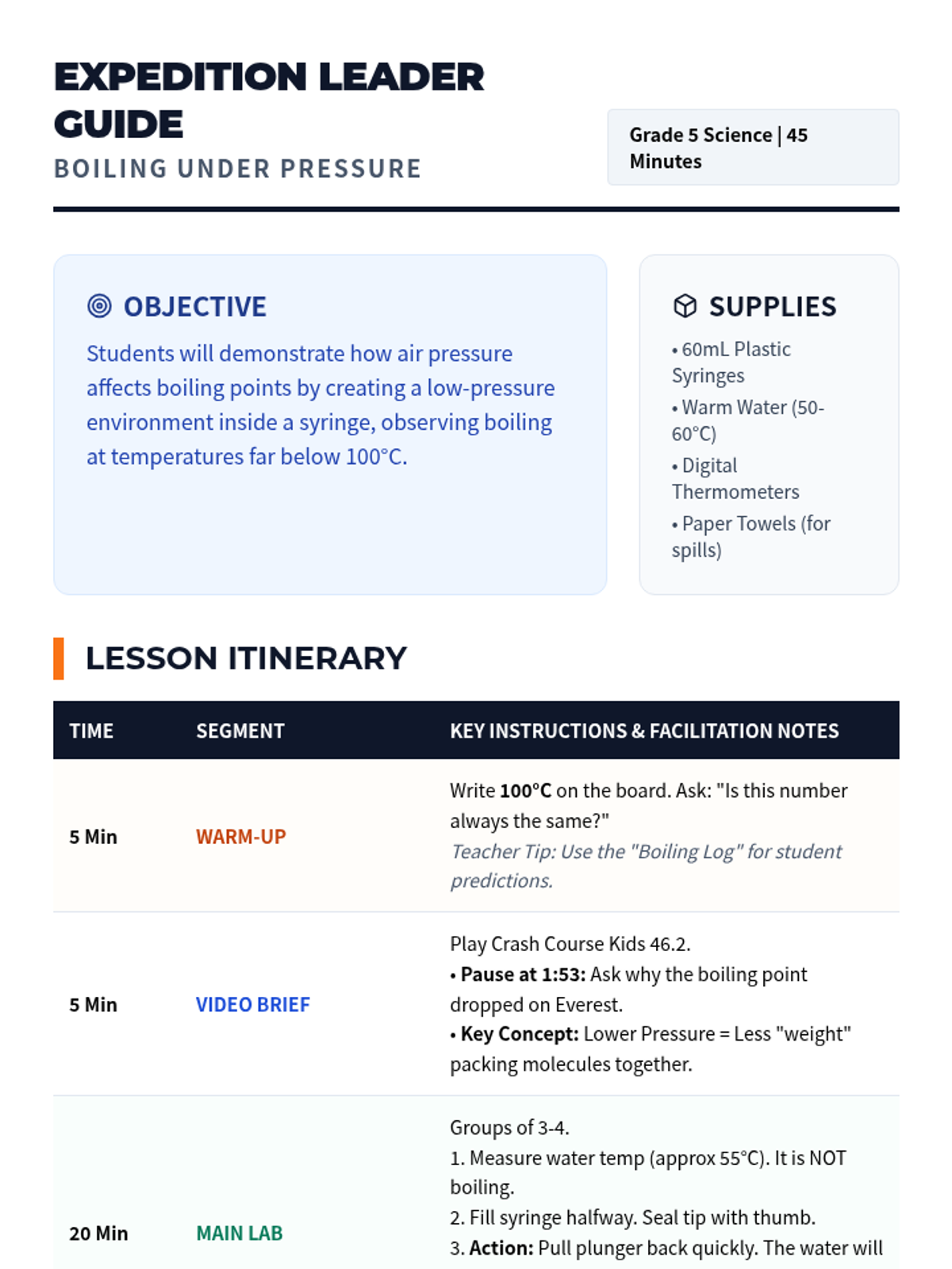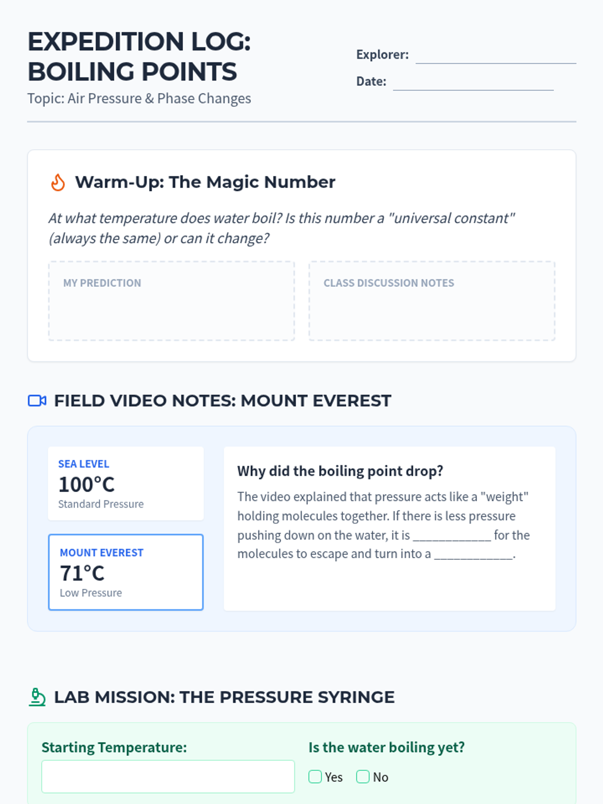 A hands-on science lesson exploring how atmospheric pressure influences the boiling point of water through a syringe model and a 'Postcard from Everest' writing task.