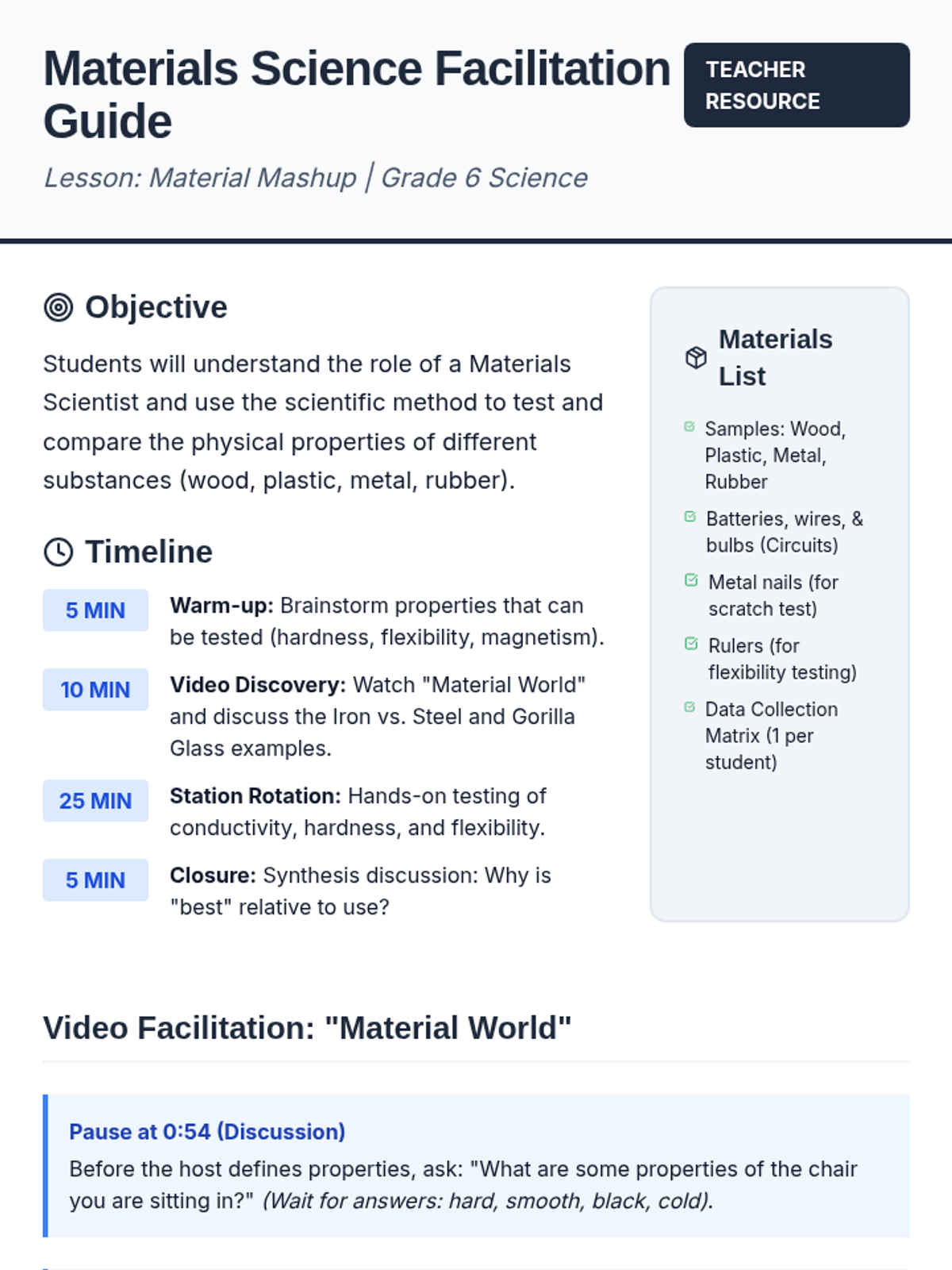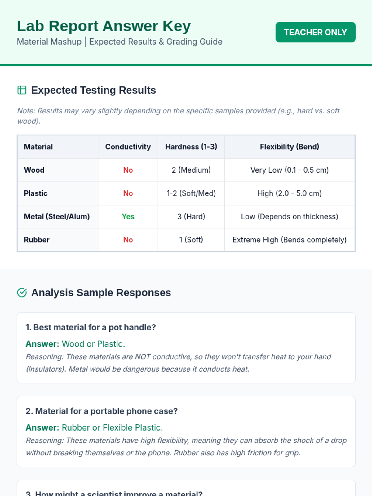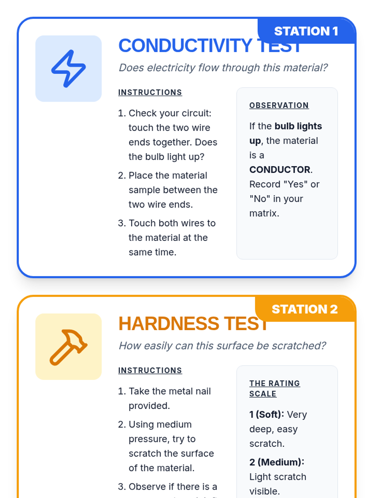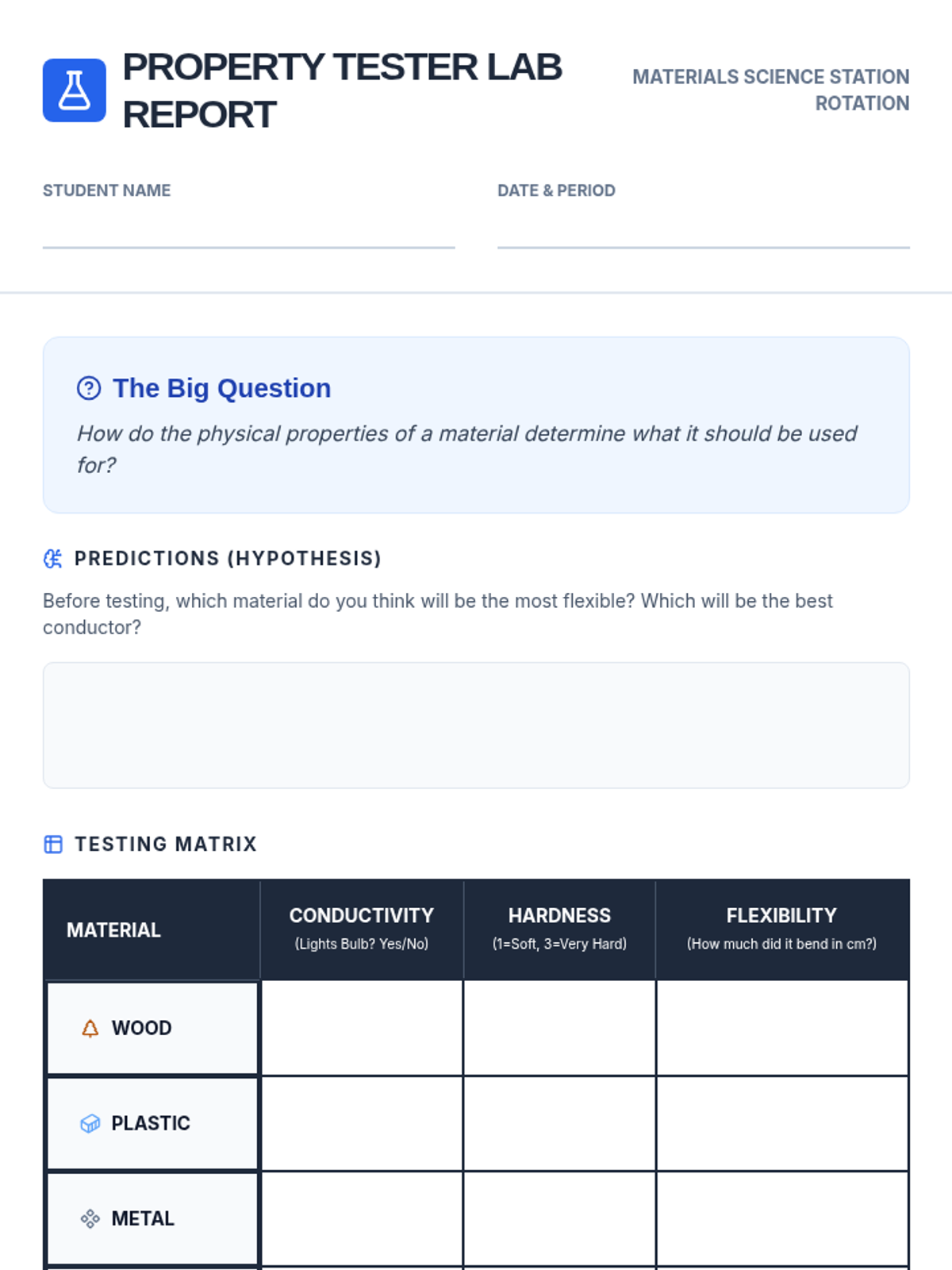 Students explore the world of materials science, testing various substances for conductivity, hardness, and flexibility to understand how properties dictate a material's use.