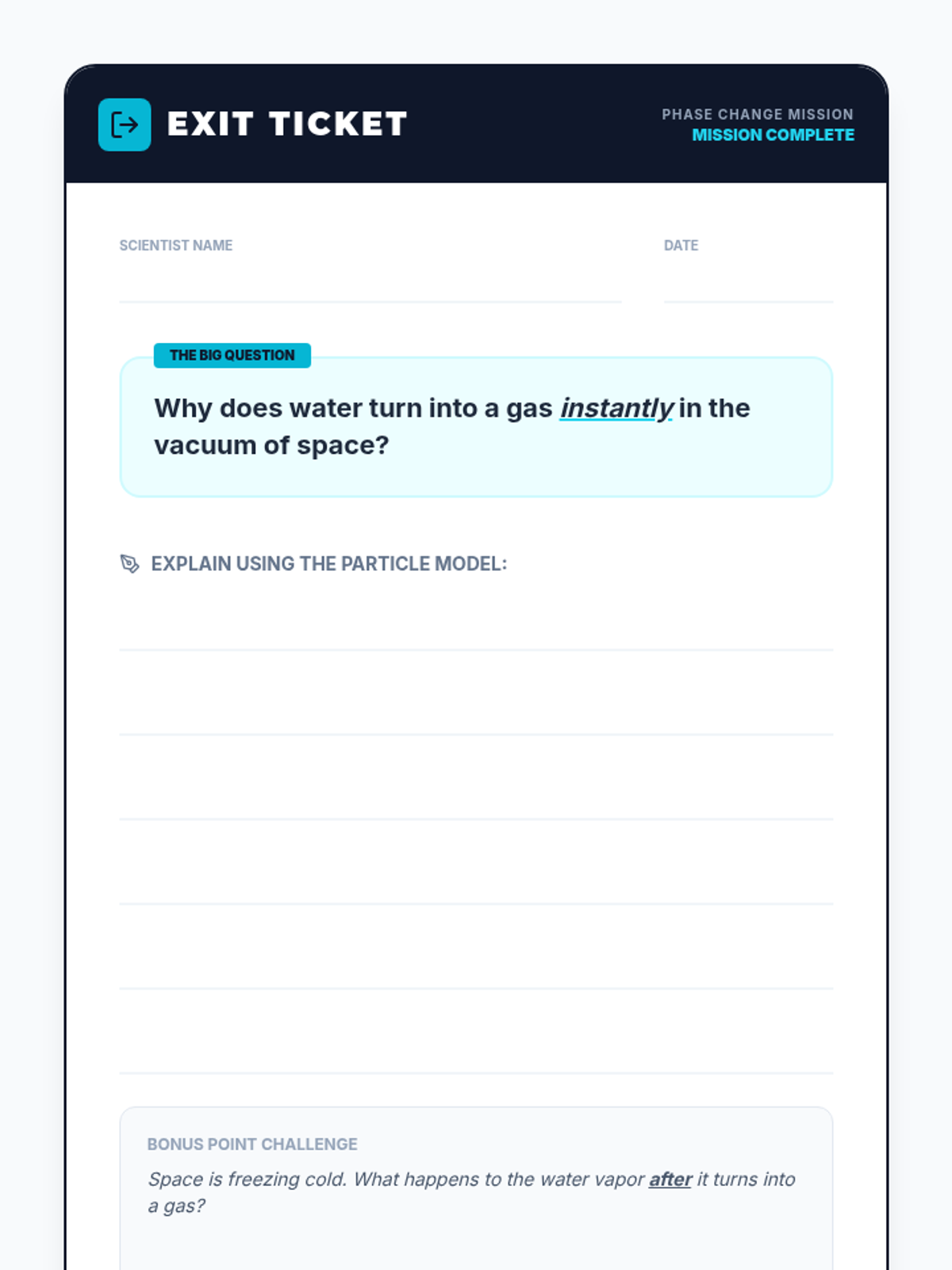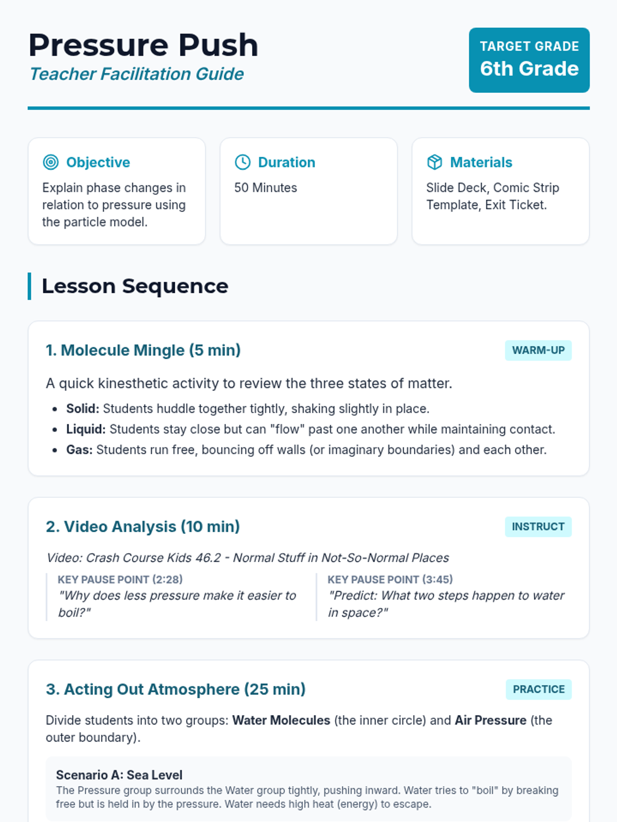 Students will explore how atmospheric pressure affects states of matter and boiling points using a particle-based model. The lesson includes a physical roleplay activity, a video analysis, and a creative comic strip application.