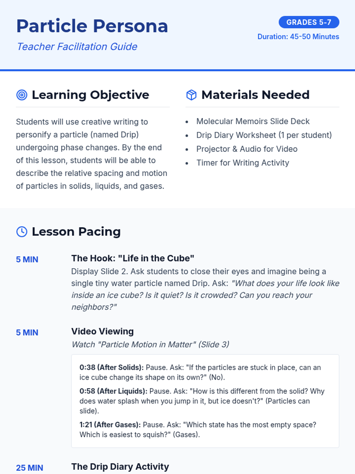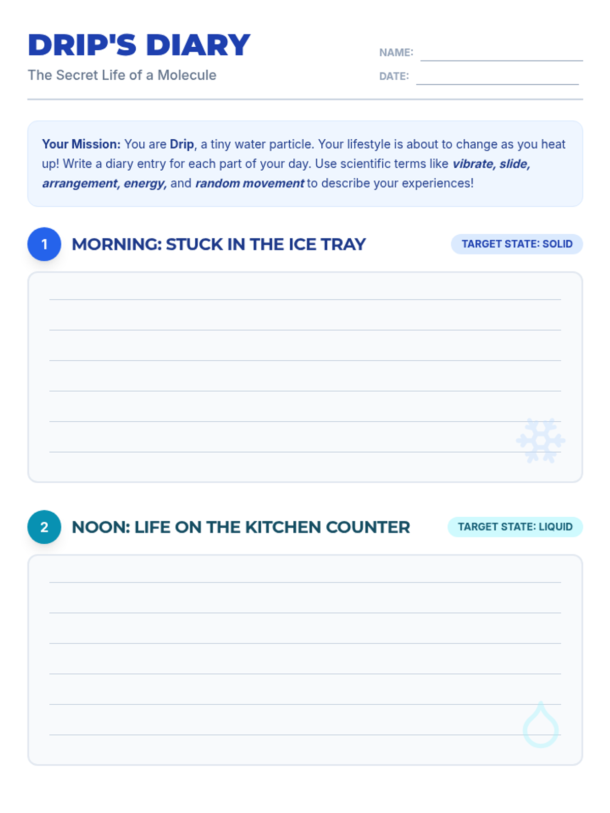 Students personify a water particle named Drip as it transitions from a solid to a liquid and finally a gas, using creative writing to demonstrate understanding of particle motion.