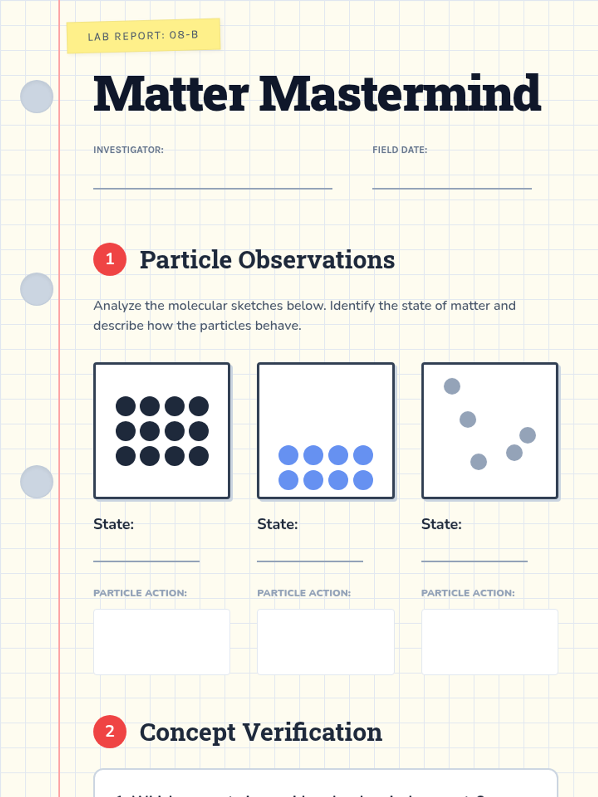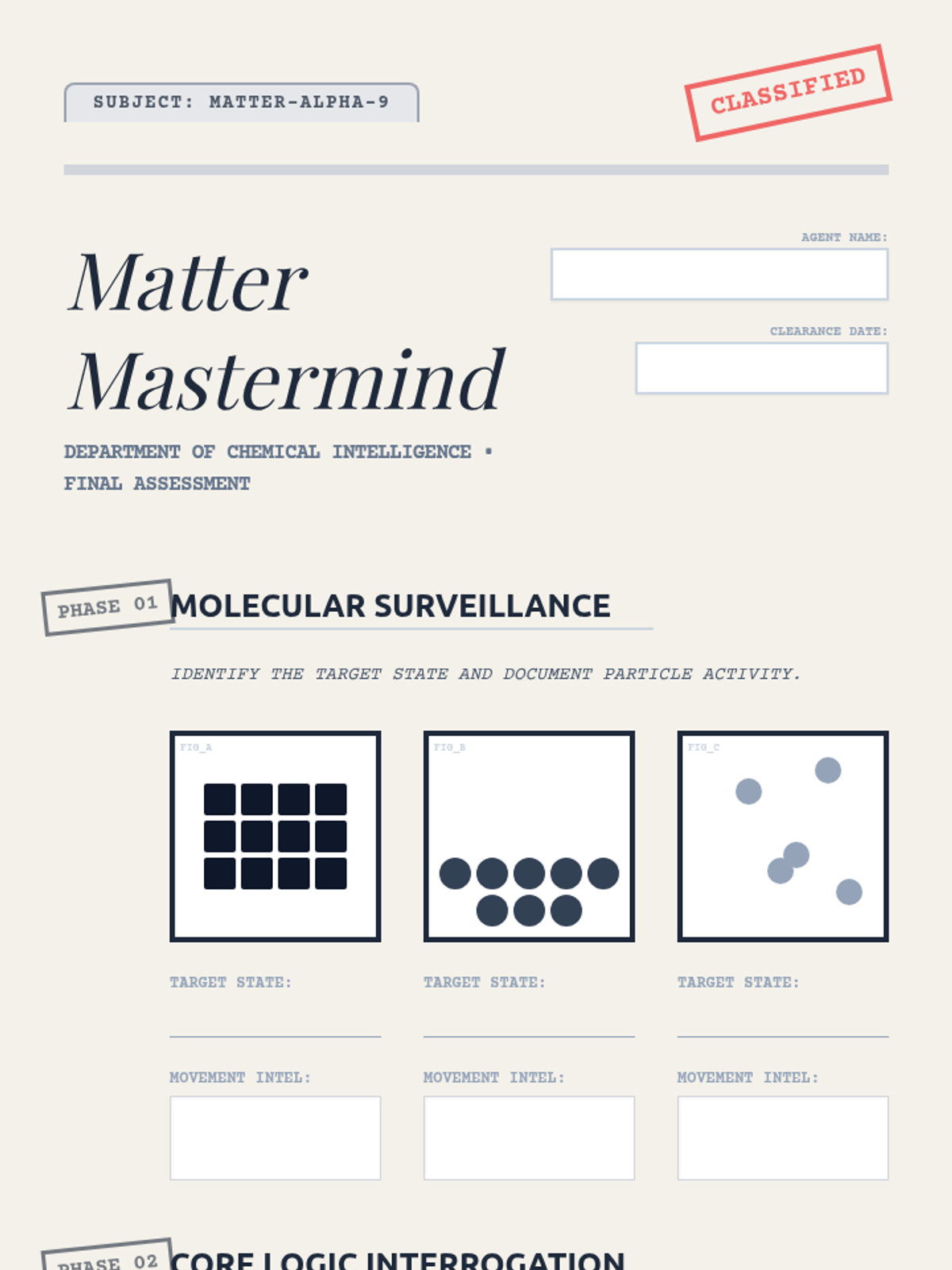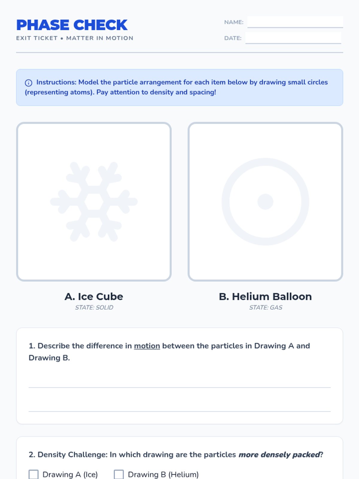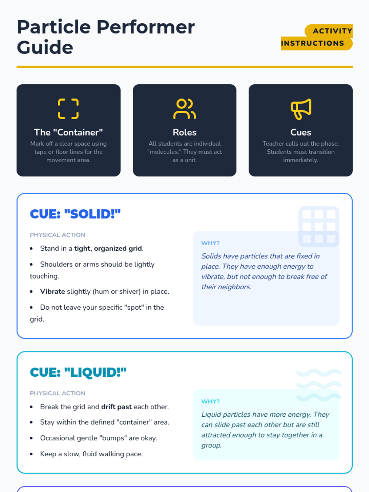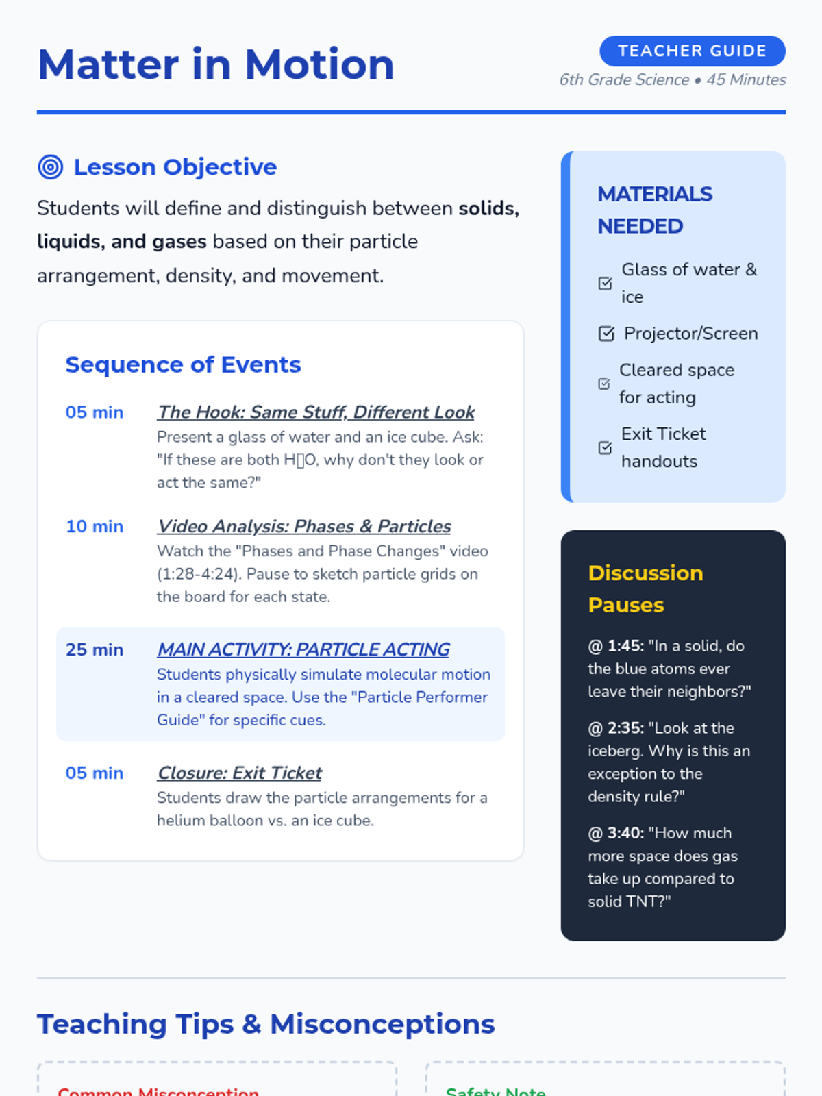 An interactive 6th-grade science lesson exploring the three primary states of matter through video analysis, kinesthetic movement, and visual modeling. Students will compare solids, liquids, and gases by acting as molecules and drawing their arrangements.