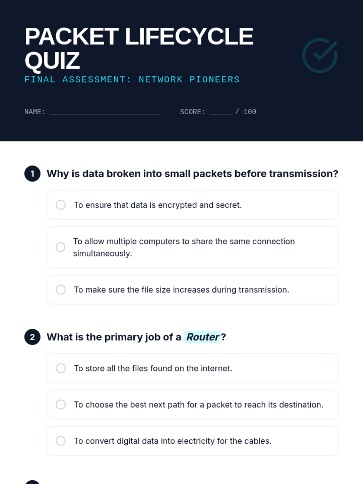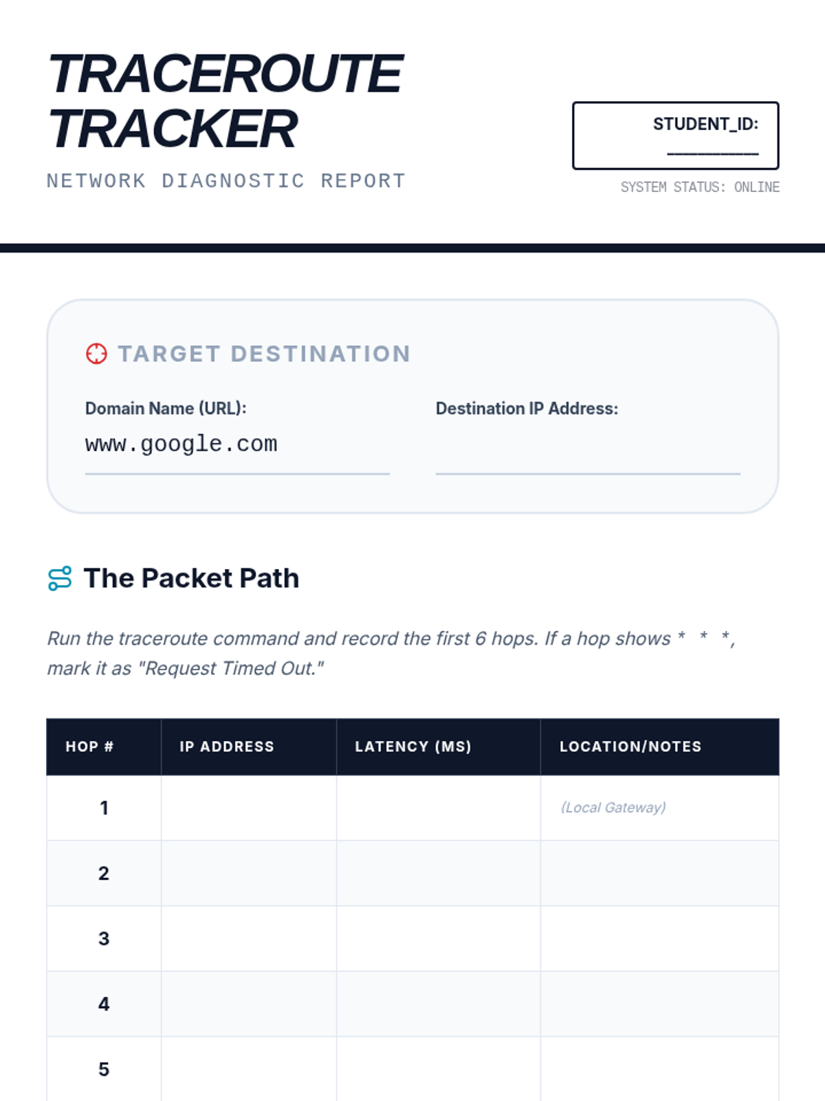 Students observe the full protocol stack in action using traceroute tools and simulations to trace a packet's complete lifecycle.
