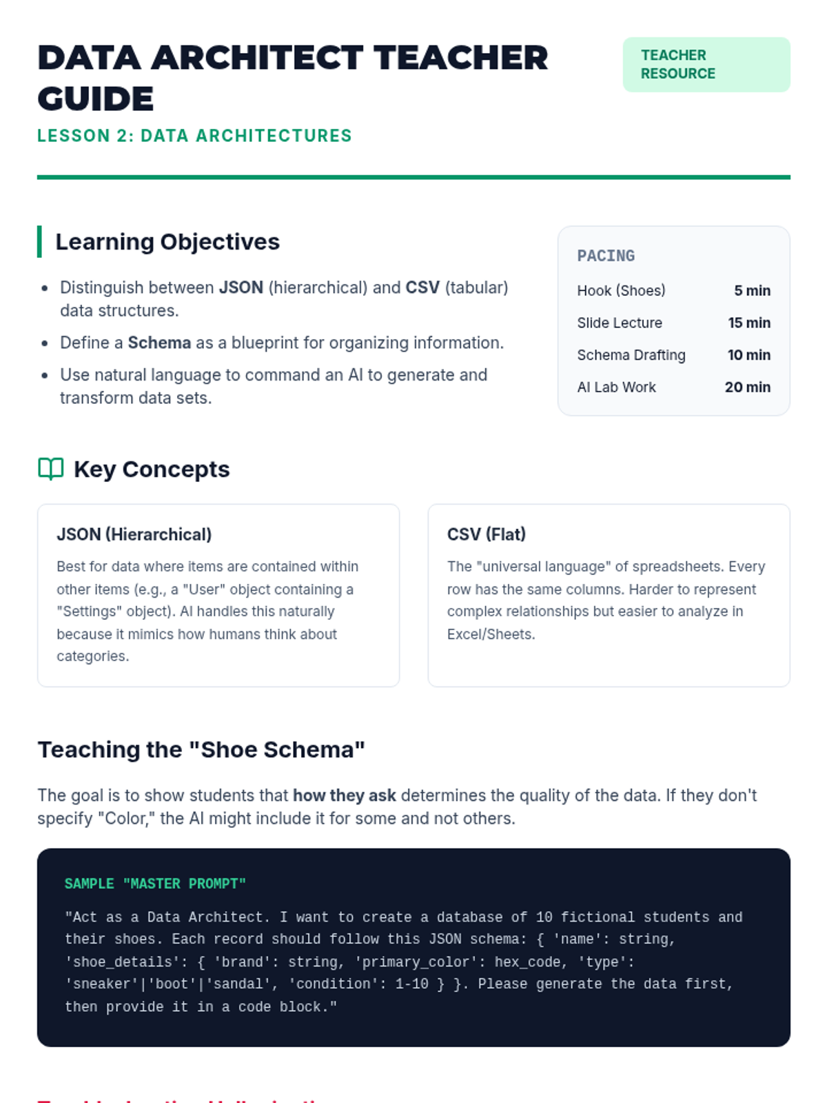 Students learn to use natural language to generate and manipulate structured data formats like JSON and CSV.