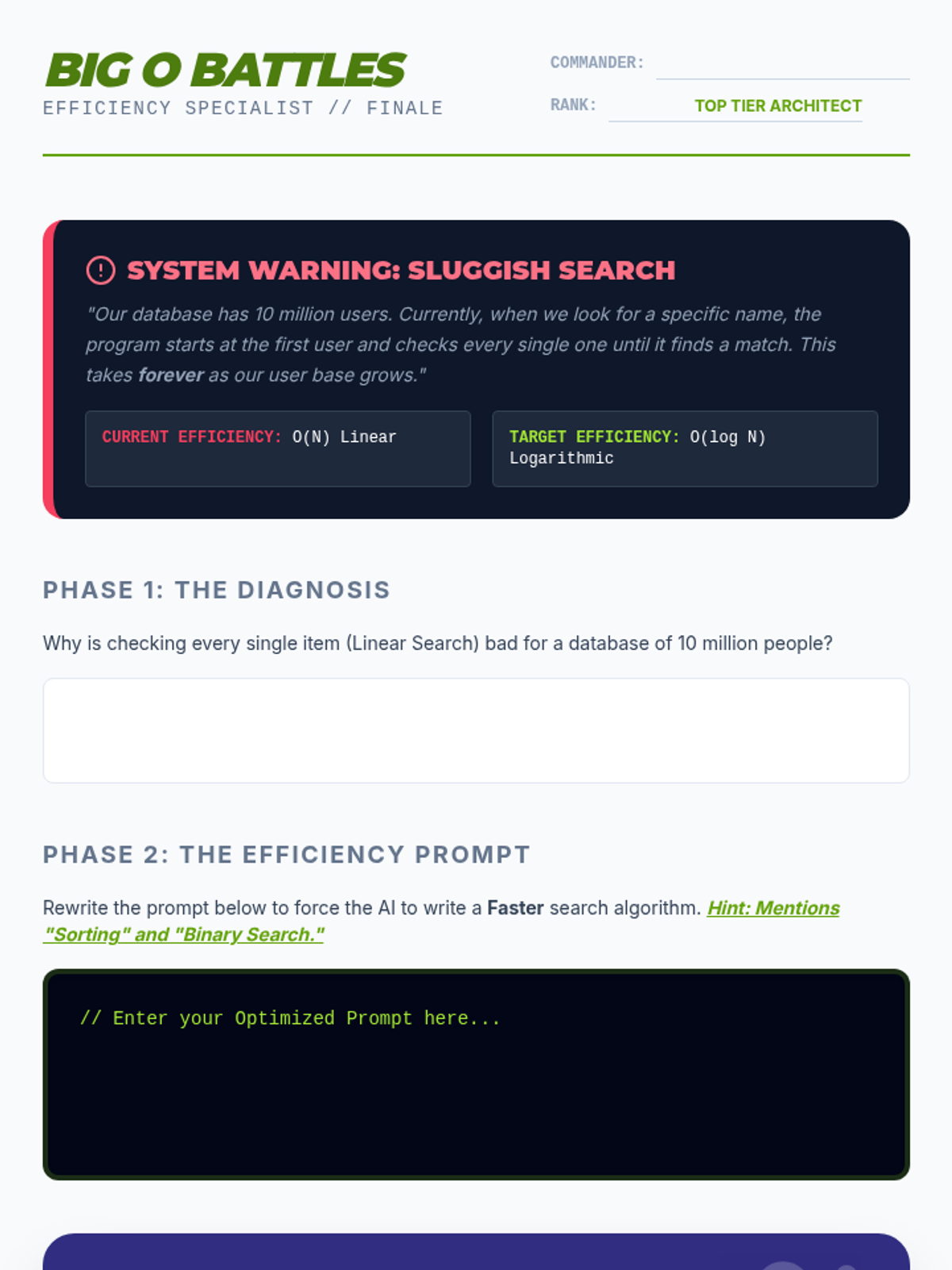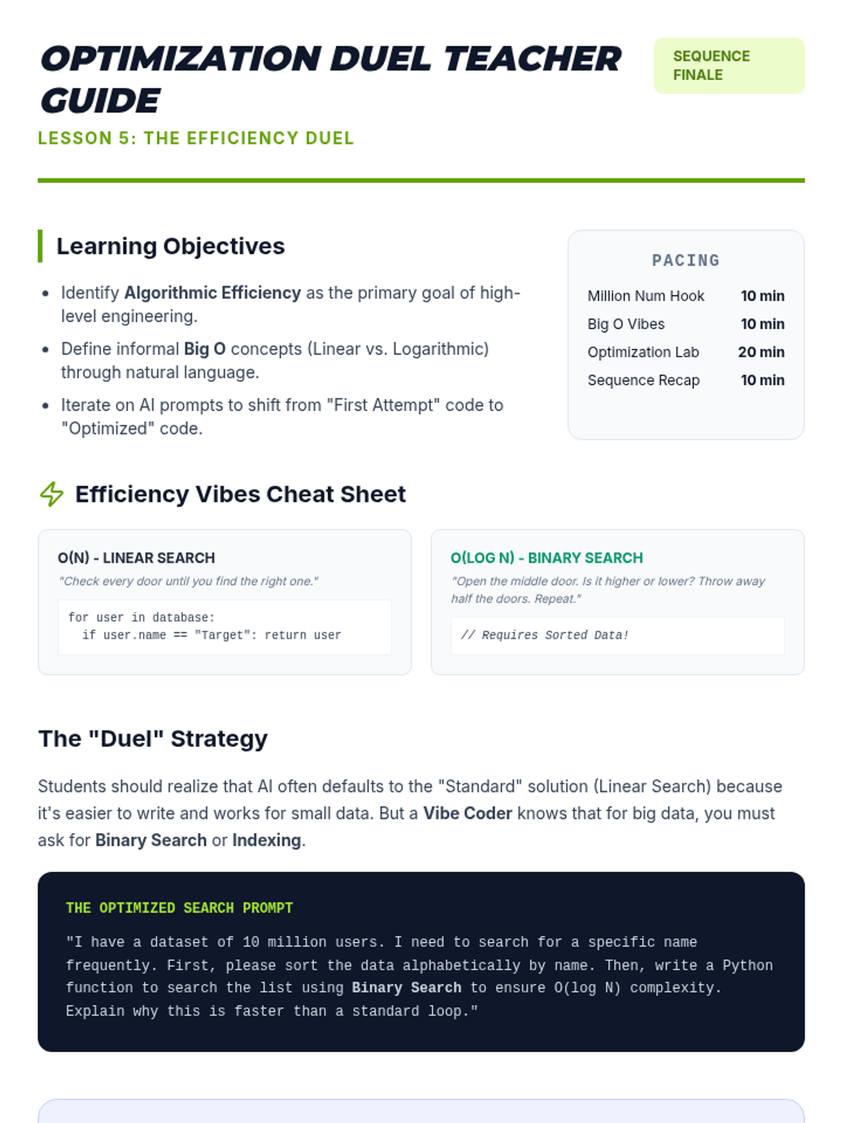 Students iterate on AI-generated solutions to improve efficiency and speed, learning informal Big O concepts through natural language.