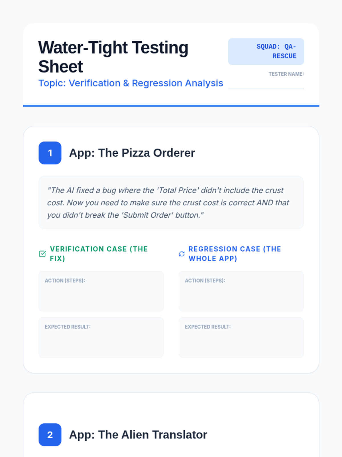 Students learn to test whether the AI's proposed solution actually solved the problem without introducing new ones (regression testing). They practice running test cases after a new generation.