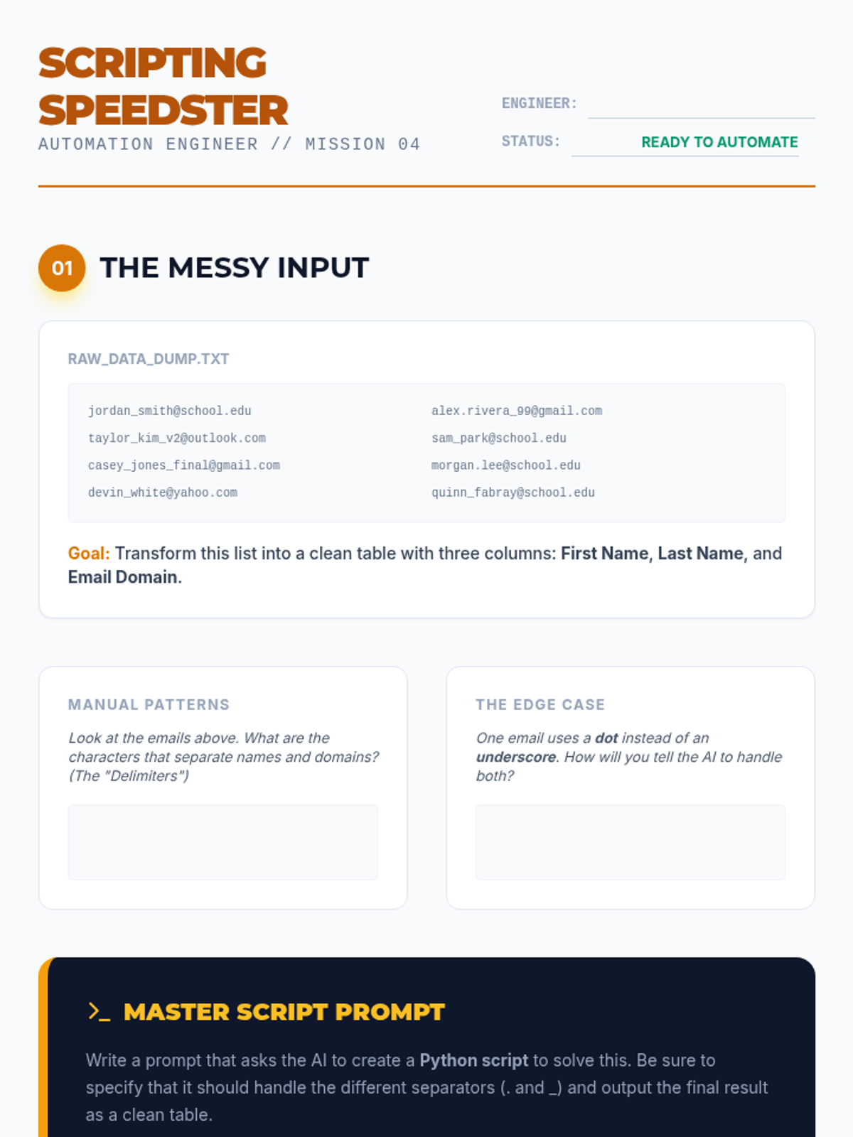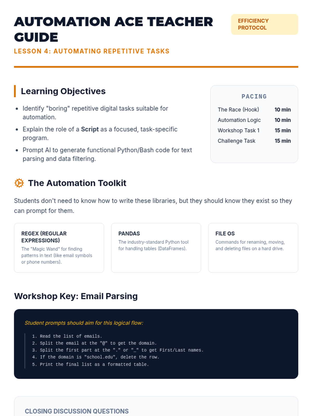 Students identify repetitive digital tasks and use AI to create automation scripts, connecting coding to real-world efficiency.