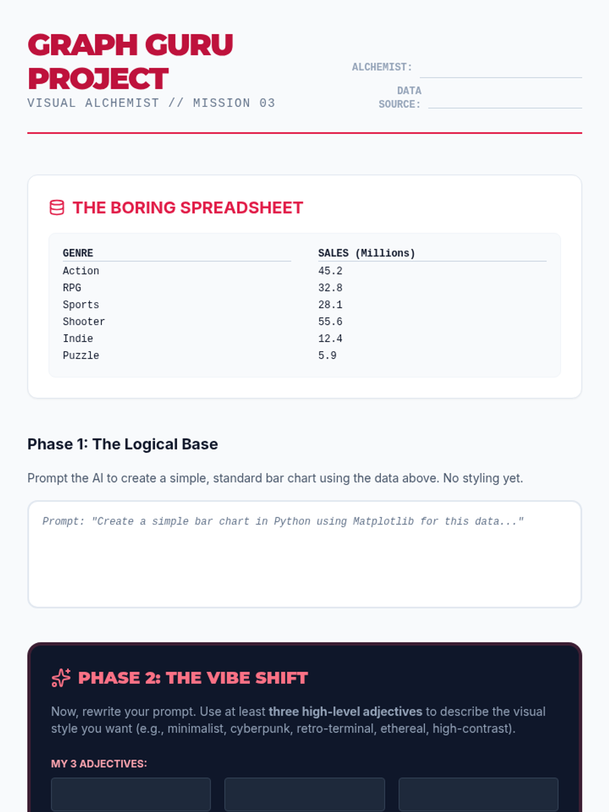 Students transform raw data into compelling visualizations using AI prompts, exploring how descriptive language affects output.