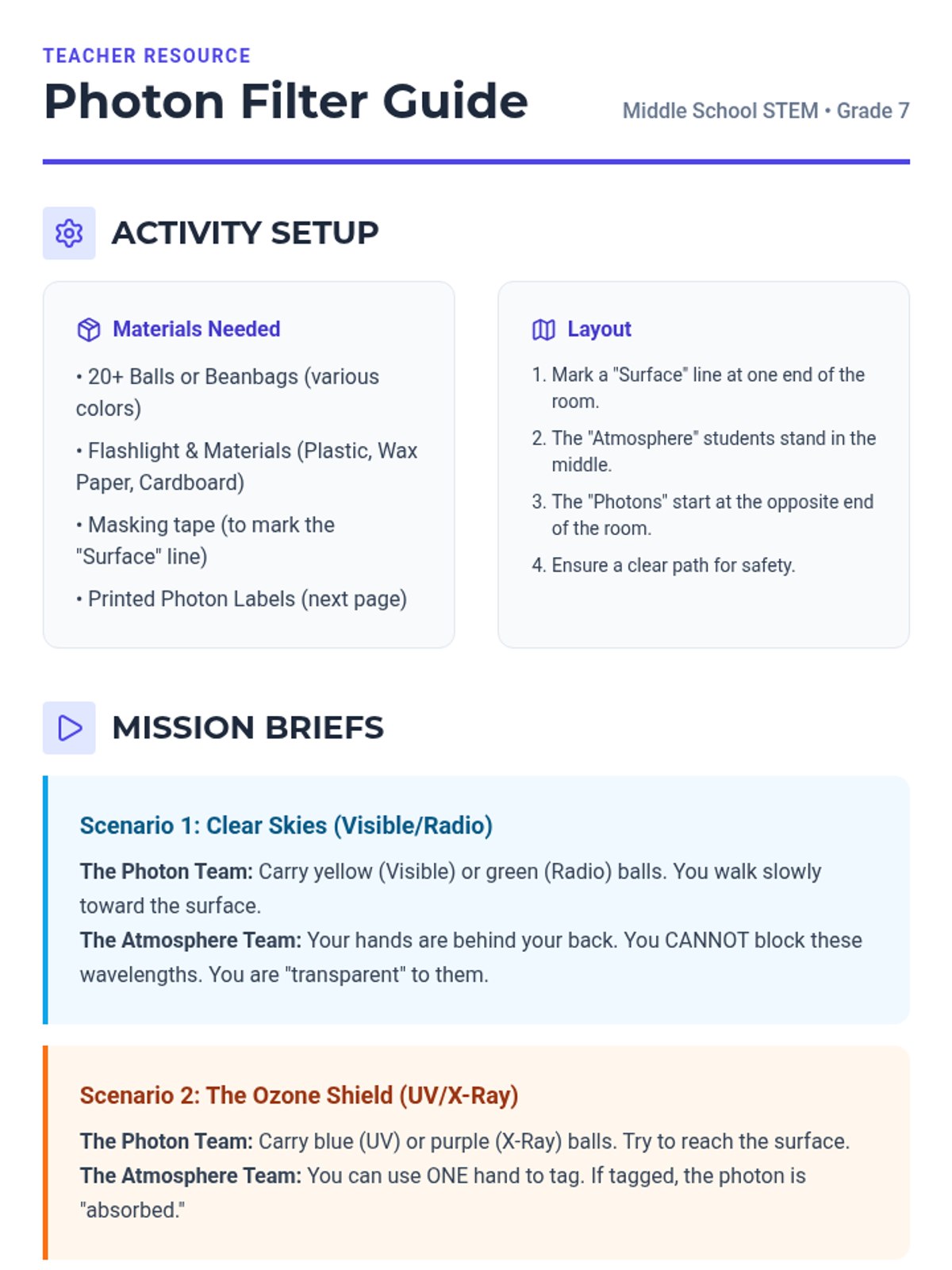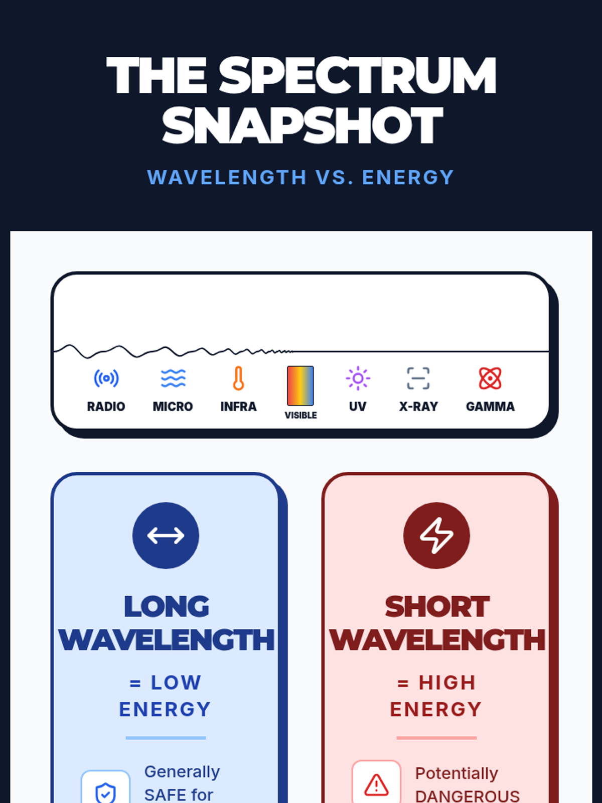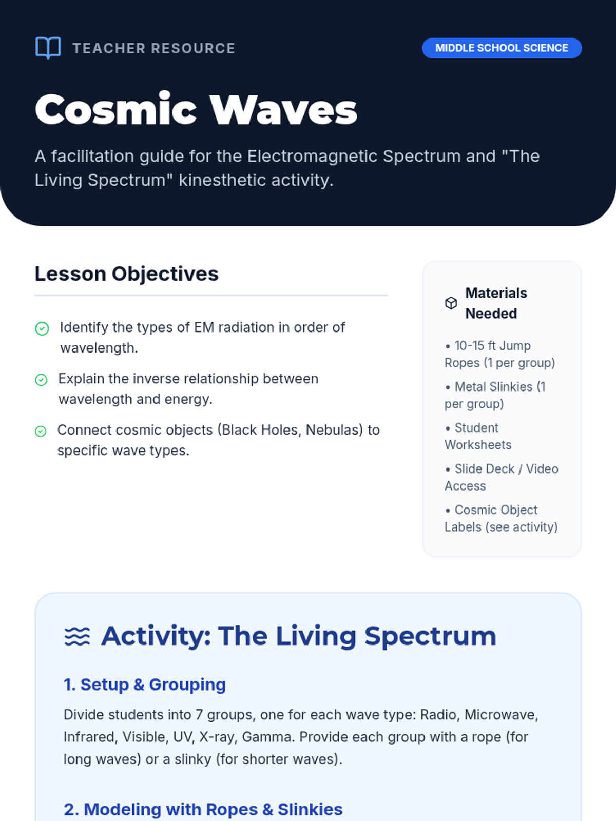 A middle school science lesson where students explore the electromagnetic spectrum, learning the inverse relationship between wavelength and energy through a hands-on kinesthetic activity.