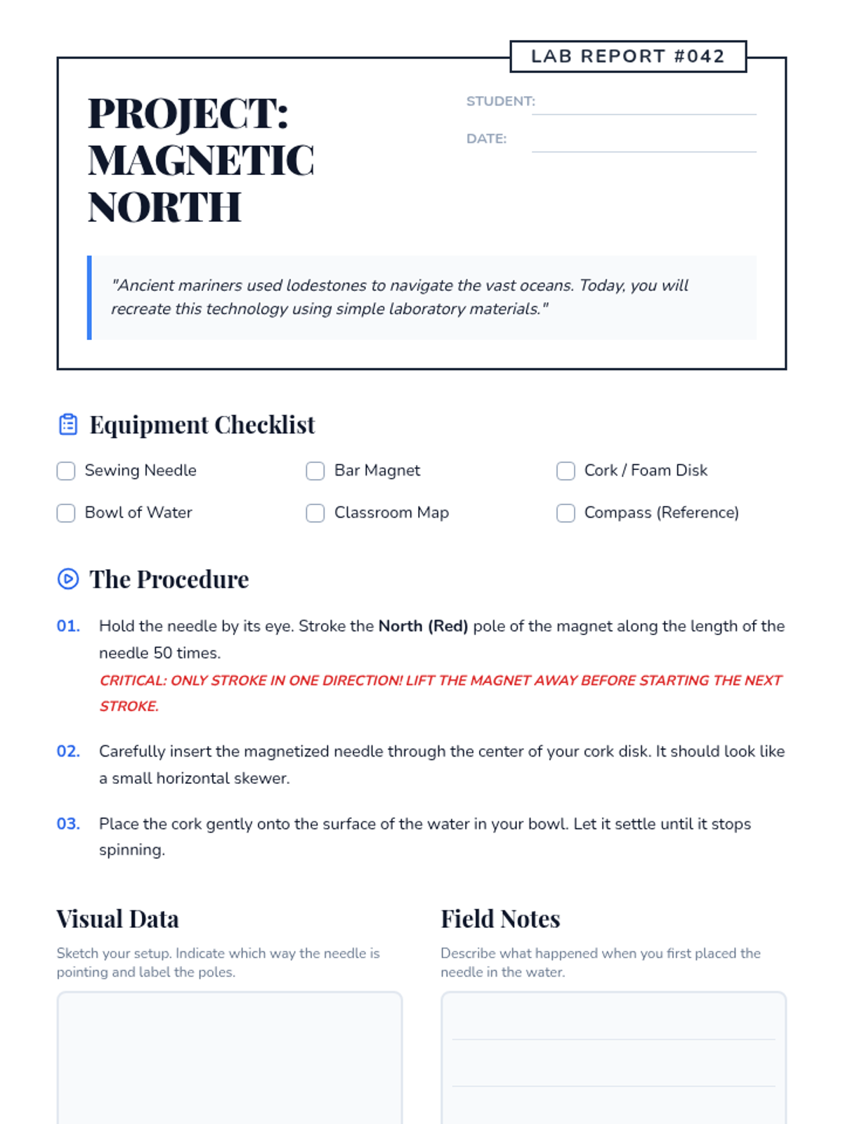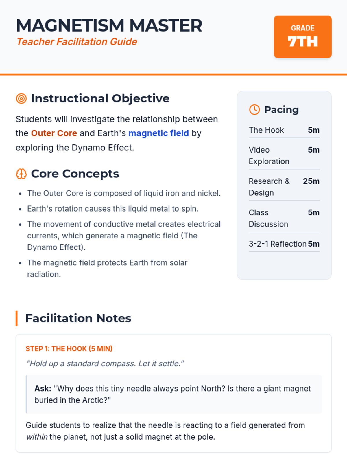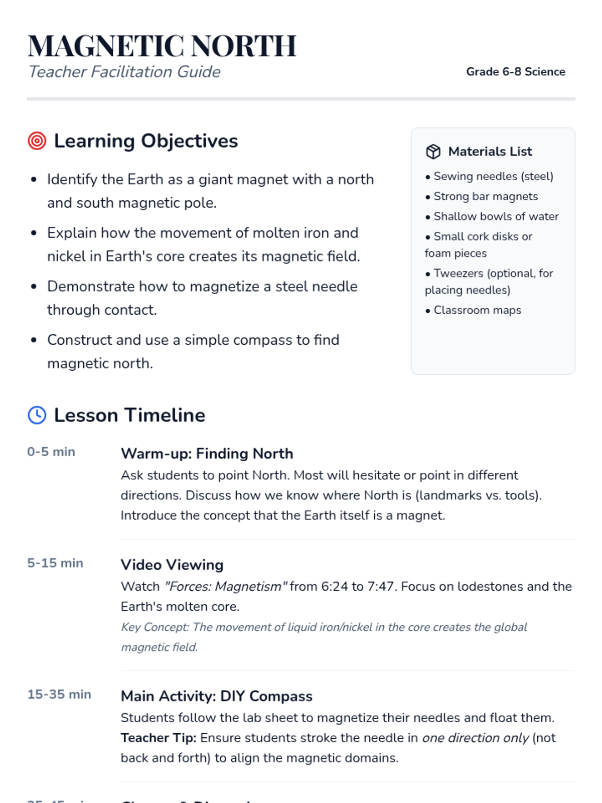 A middle school science lesson exploring Earth's magnetic field through the creation of a DIY compass. Students learn about the molten core of the Earth and the difference between geographic and magnetic north.