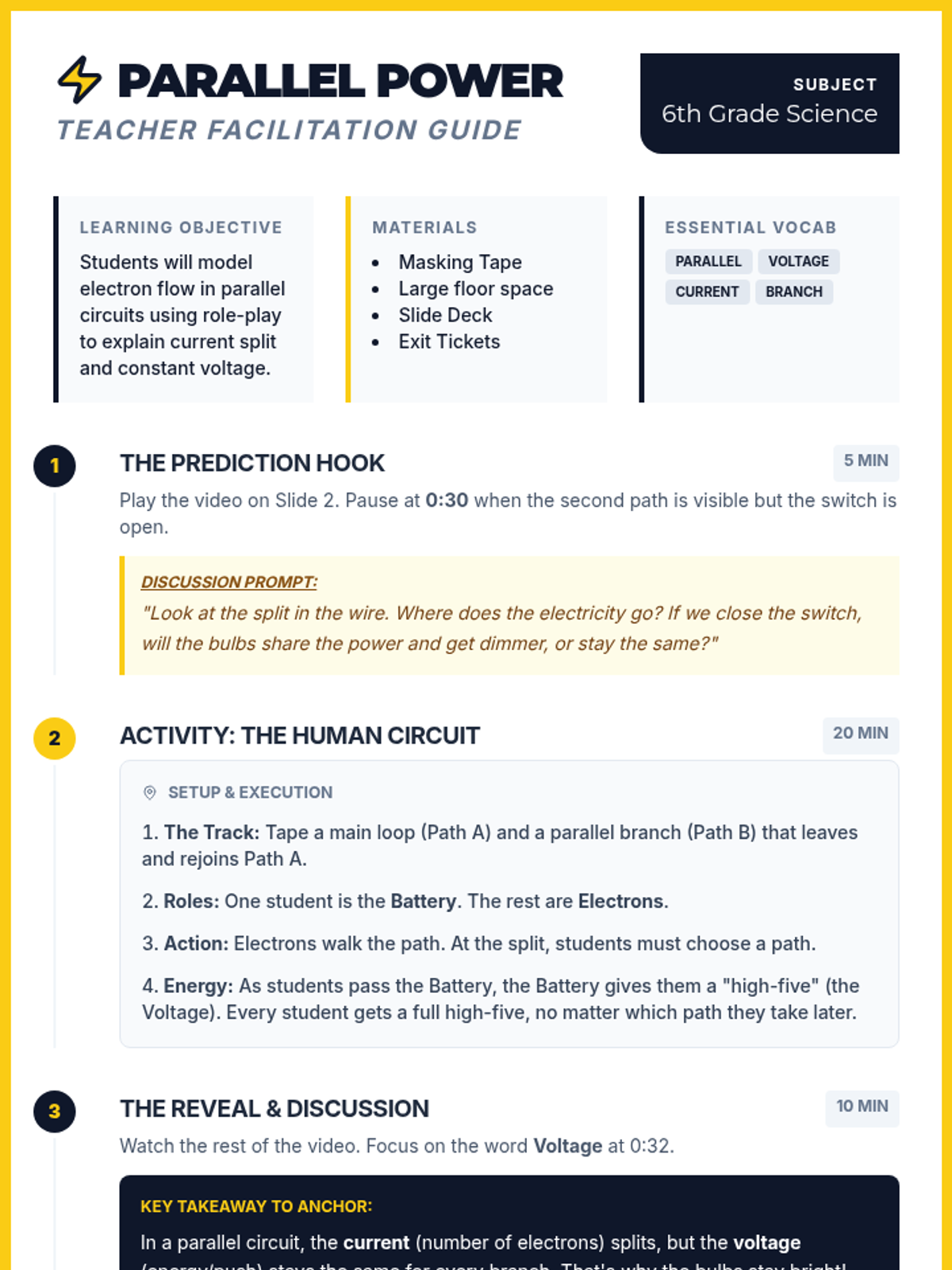 Students will role-play as electrons in a circuit to understand how current splits and voltage remains constant in a parallel circuit arrangement, using a video demonstration as a baseline for observation.